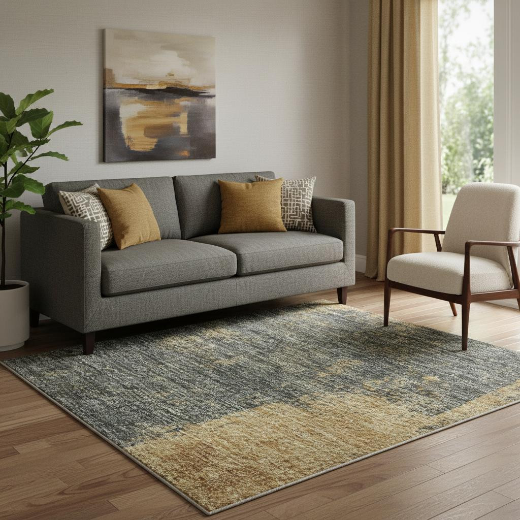 Add some artistry to your room with this 5-foot x 8-foot gold and blue abstract washable area rug with uv protection. Ideal for spaces with kids and pets, this rug is stain resistant to help repel dirt and spilled liquids. Built to last, this rug crafted from polyester fibers is known for its durability and long lasting appeal. Rugs are a great way to showcase your style, hide imperfections, warm your home and reduce noise. This larger sized, transitional styled rug is ready to create a focal point or statement piece in your room. 60.00-inch h x 90.00-inch w x 0.39-inch d.