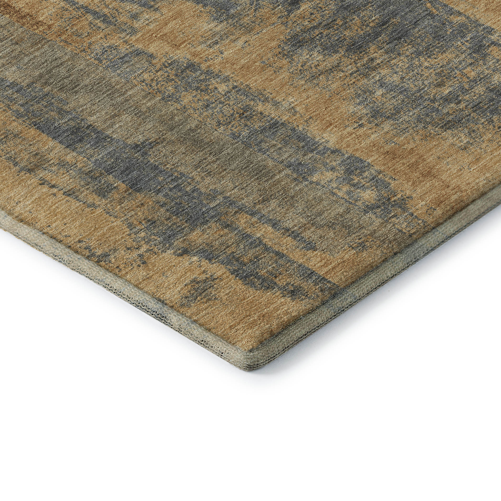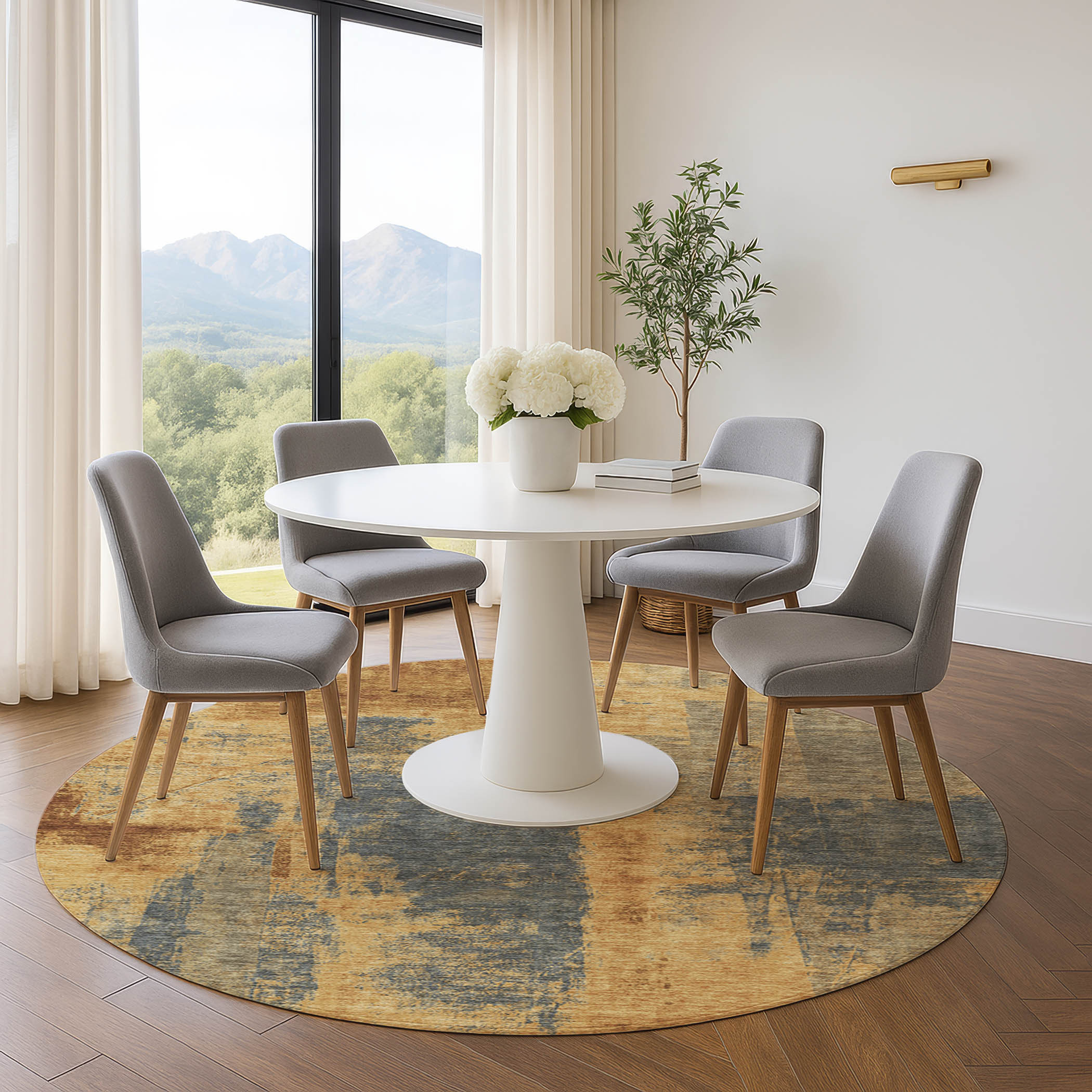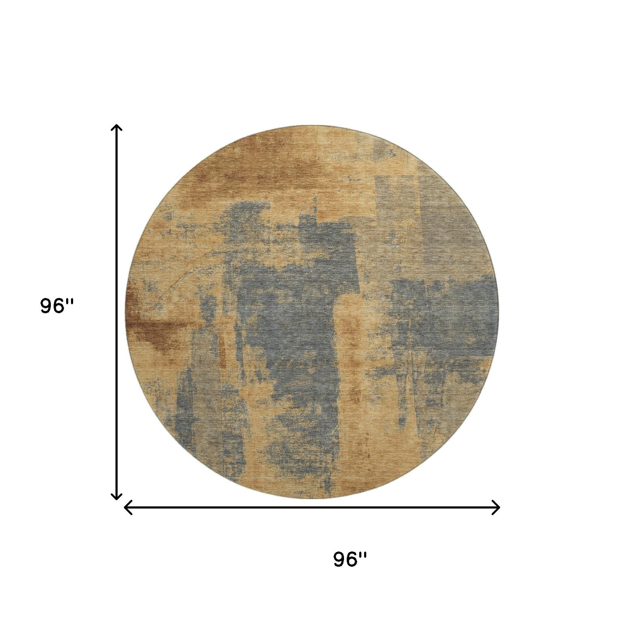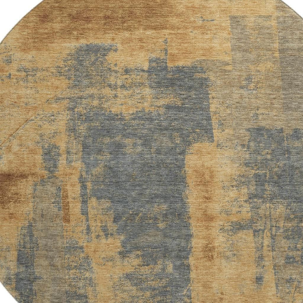 Add great coloration and comfortable texture to your space with this 8-foot gold and blue abstract washable round rug with uv protection. Ideal for spaces with kids and pets, this rug is stain resistant to help repel dirt and spilled liquids. Built to last, this rug crafted from polyester fibers is known for its durability and long lasting appeal. Rugs are a great way to showcase your style, hide imperfections, warm your home and reduce noise. This larger sized, transitional styled rug is ready to create a focal point or statement piece in your room. 96.00-inch h x 96.00-inch w x 0.39-inch d.