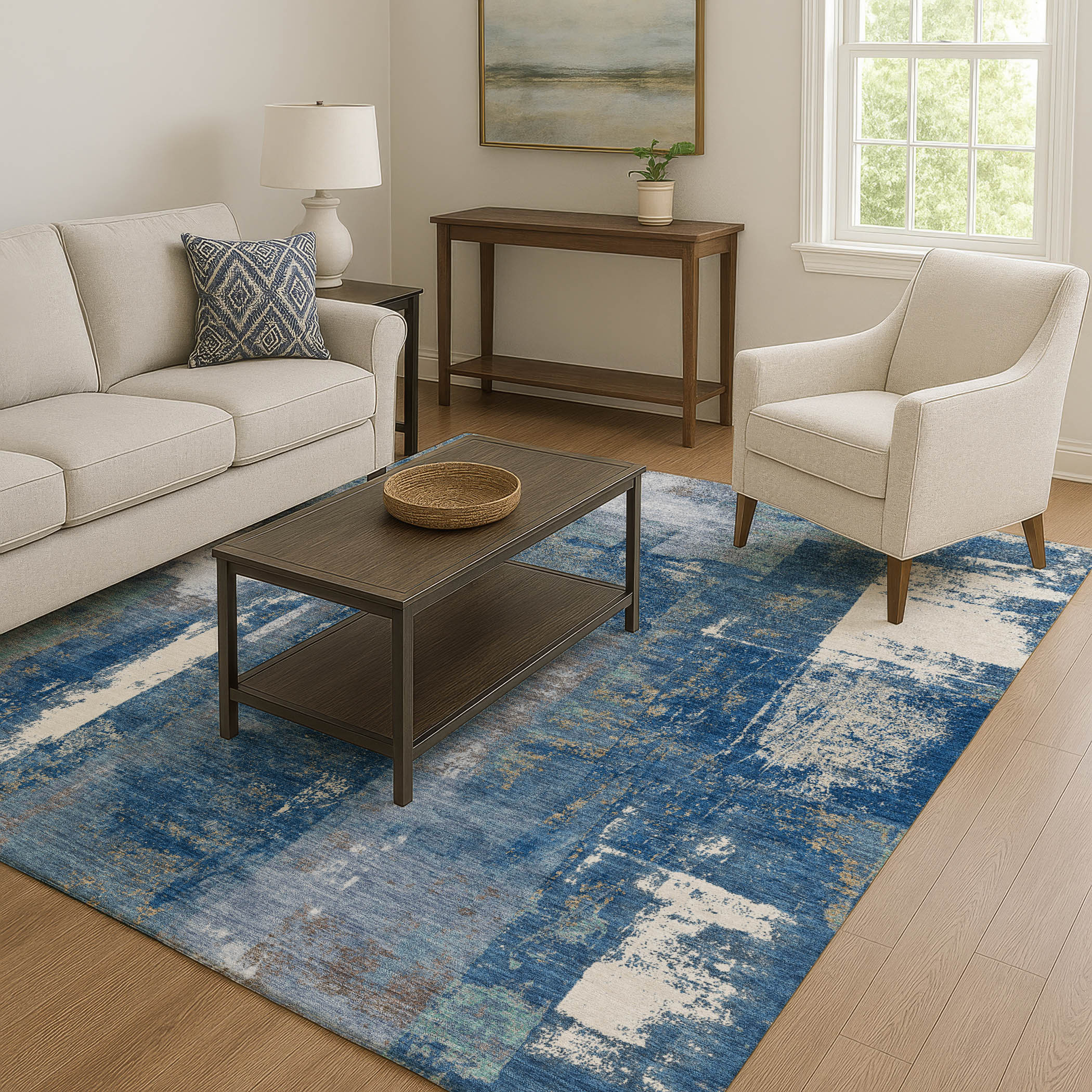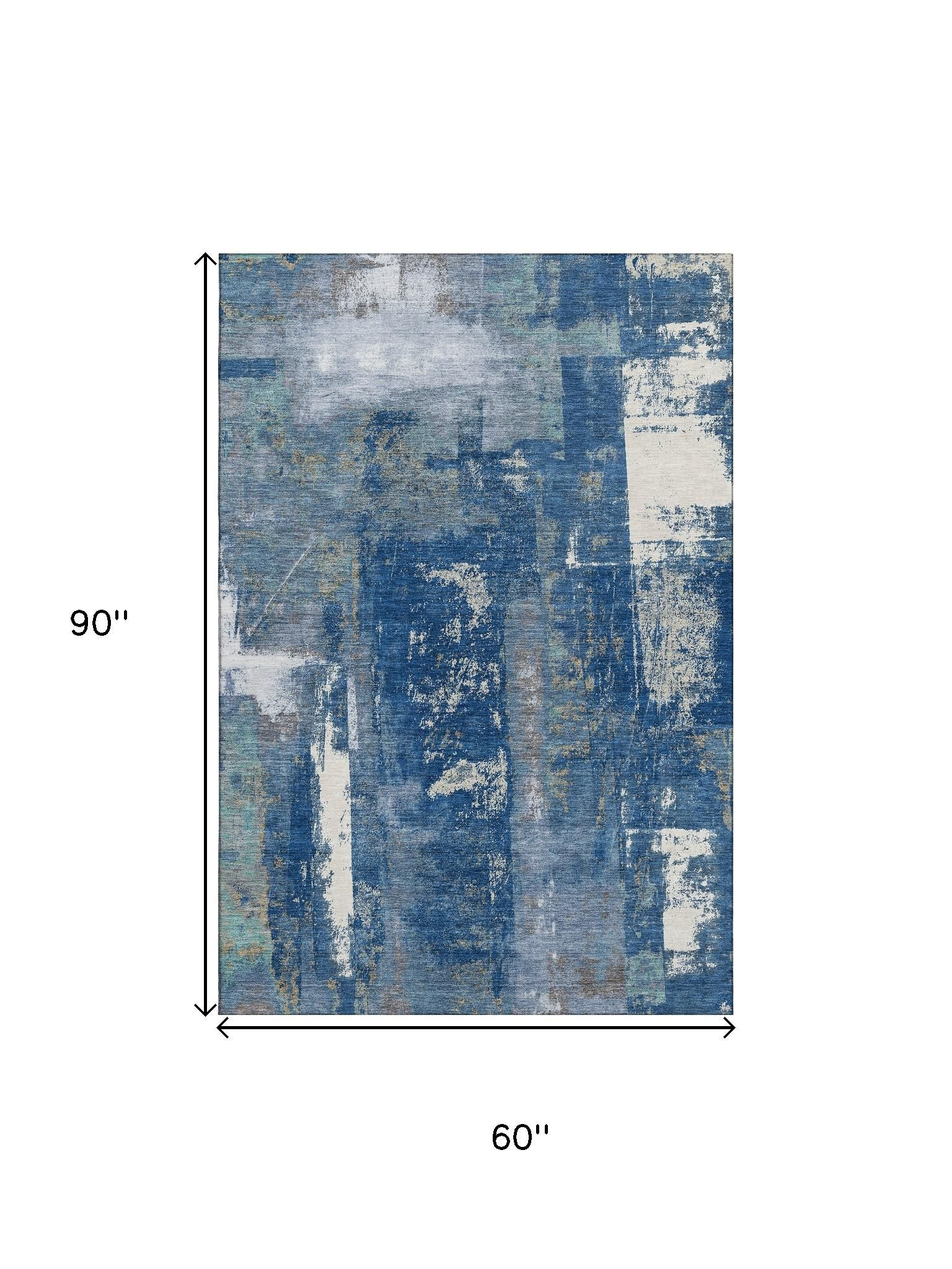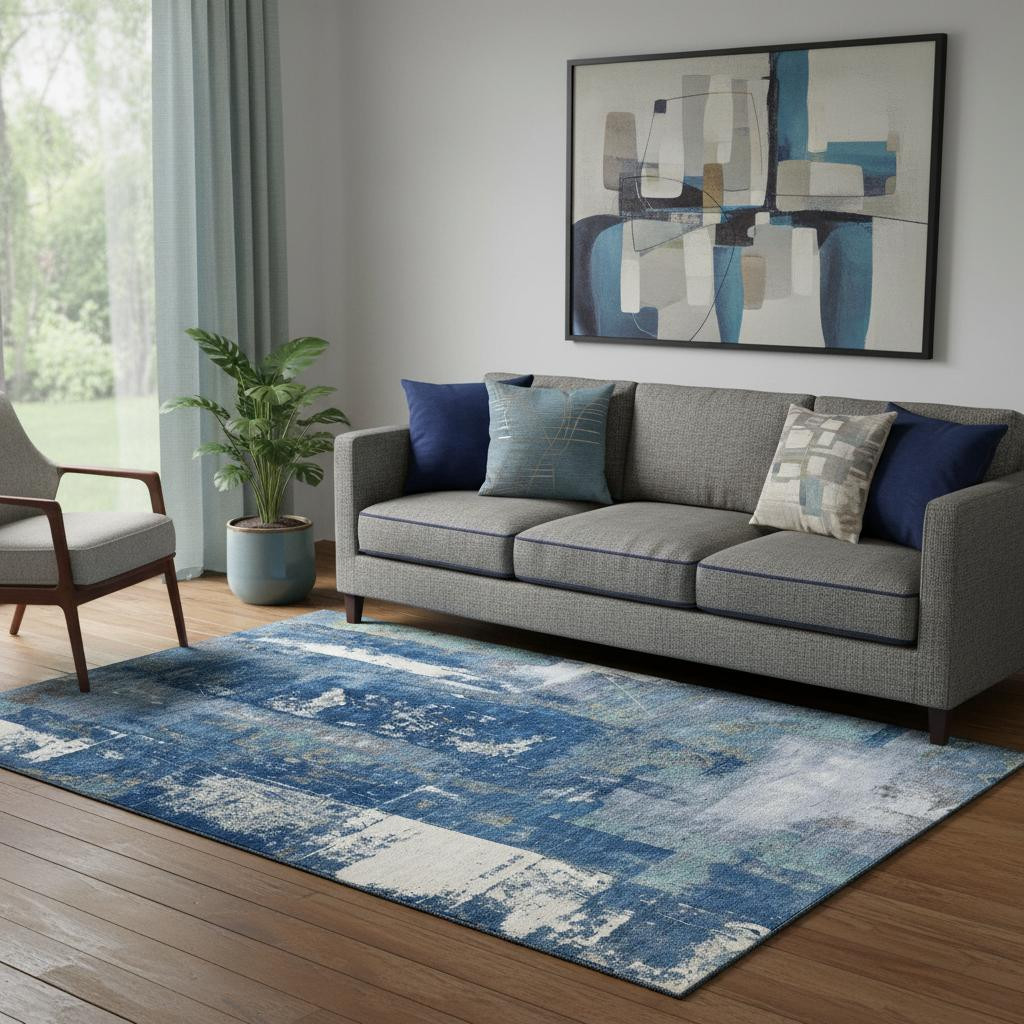 Set an inviting tone in your space with this 5-foot x 8-foot navy blue and ivory abstract washable area rug with uv protection. Ideal for spaces with kids and pets, this rug is stain resistant to help repel dirt and spilled liquids. Built to last, this rug crafted from polyester fibers is known for its durability and long lasting appeal. Rugs are a great way to showcase your style, hide imperfections, warm your home and reduce noise. This larger sized, transitional styled rug is ready to create a focal point or statement piece in your room. 60.00-inch h x 90.00-inch w x 0.39-inch d.