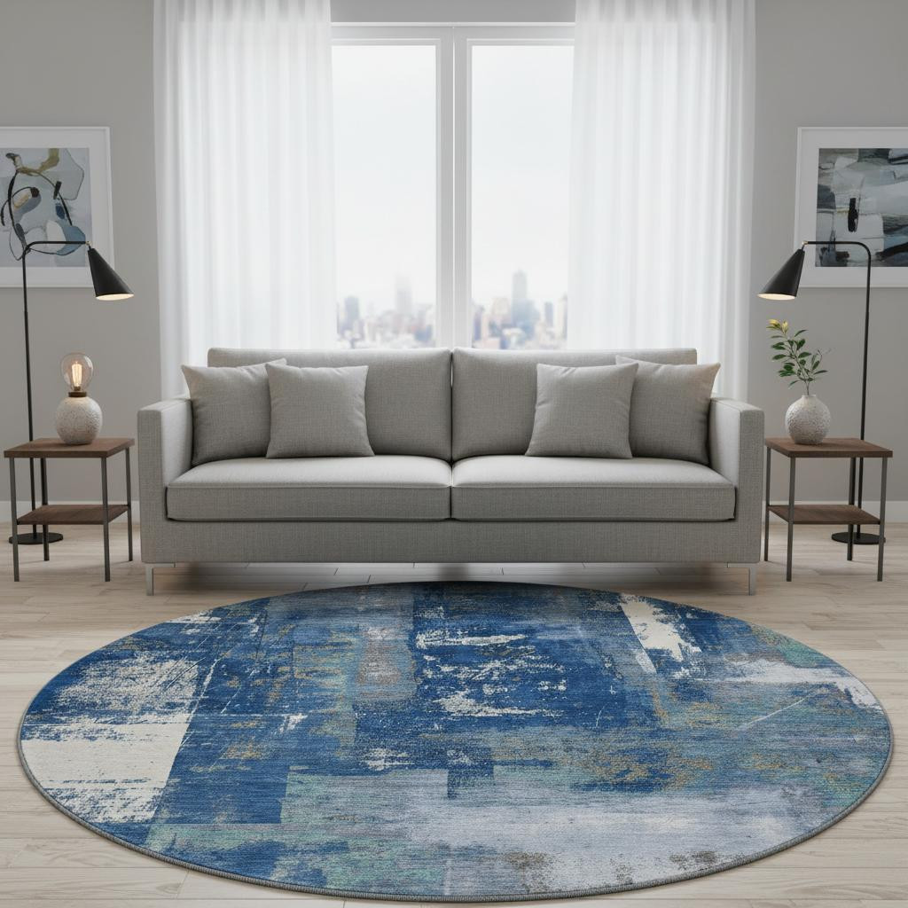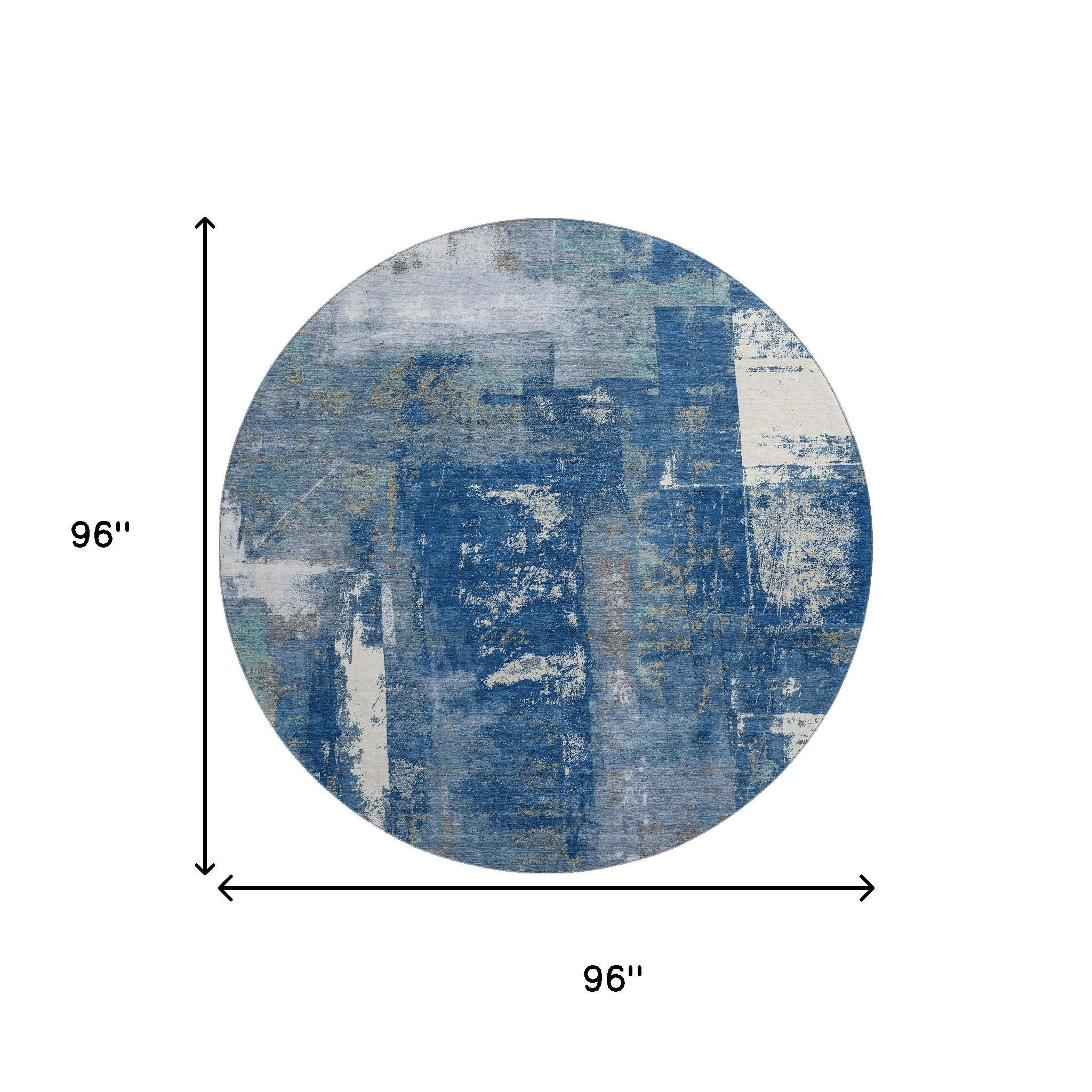 Add some artistry to your room with this 8-foot navy blue and ivory abstract washable round rug with uv protection. Ideal for spaces with kids and pets, this rug is stain resistant to help repel dirt and spilled liquids. Built to last, this rug crafted from polyester fibers is known for its durability and long lasting appeal. Rugs are a great way to showcase your style, hide imperfections, warm your home and reduce noise. This larger sized, transitional styled rug is ready to create a focal point or statement piece in your room. 96.00-inch h x 96.00-inch w x 0.39-inch d.