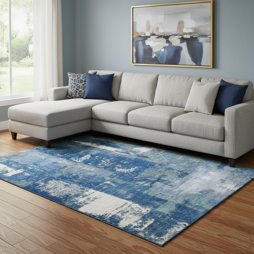 Add some artistry to your room with this 8-foot x 10-foot navy blue and ivory abstract washable area rug with uv protection. Ideal for spaces with kids and pets, this rug is stain resistant to help repel dirt and spilled liquids. Built to last, this rug crafted from polyester fibers is known for its durability and long lasting appeal. Rugs are a great way to showcase your style, hide imperfections, warm your home and reduce noise. This larger sized, transitional styled rug is ready to create a focal point or statement piece in your room. 96.00-inch h x 120.00-inch w x 0.39-inch d.