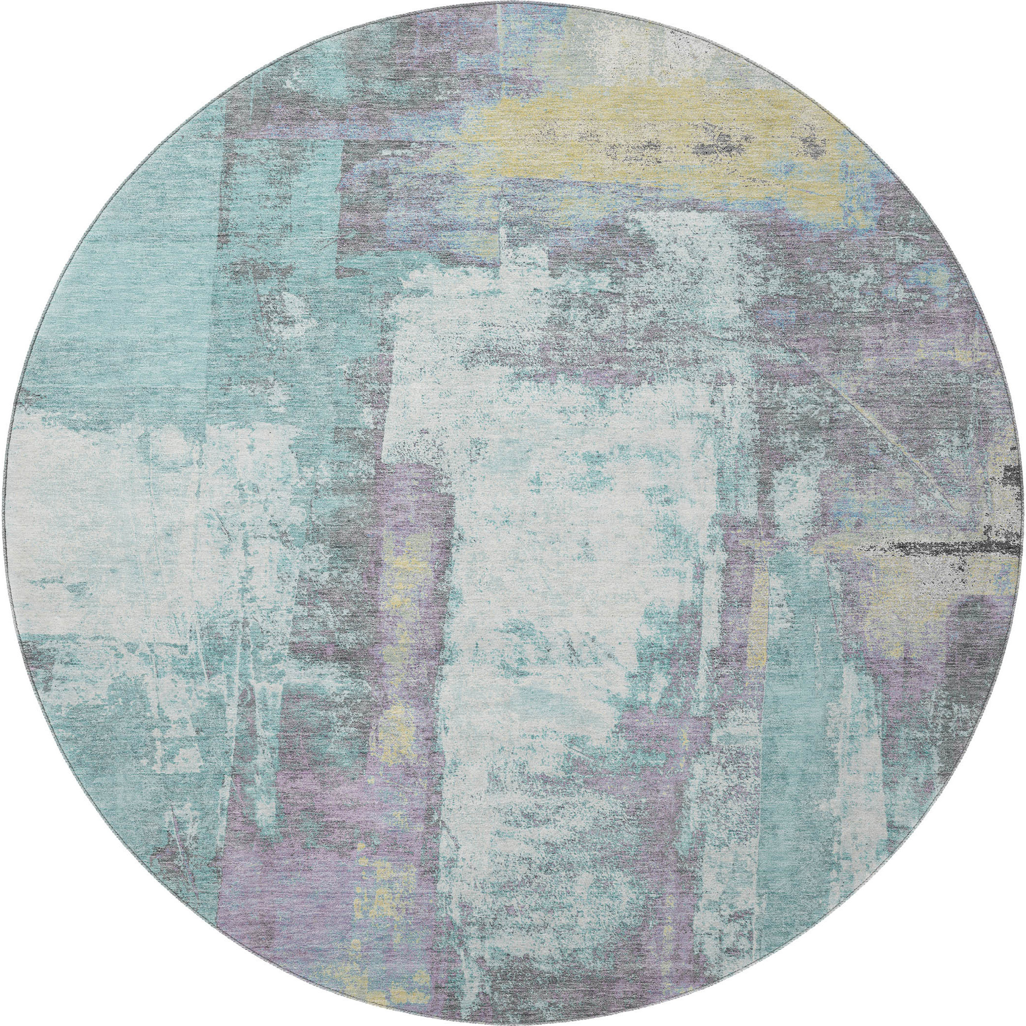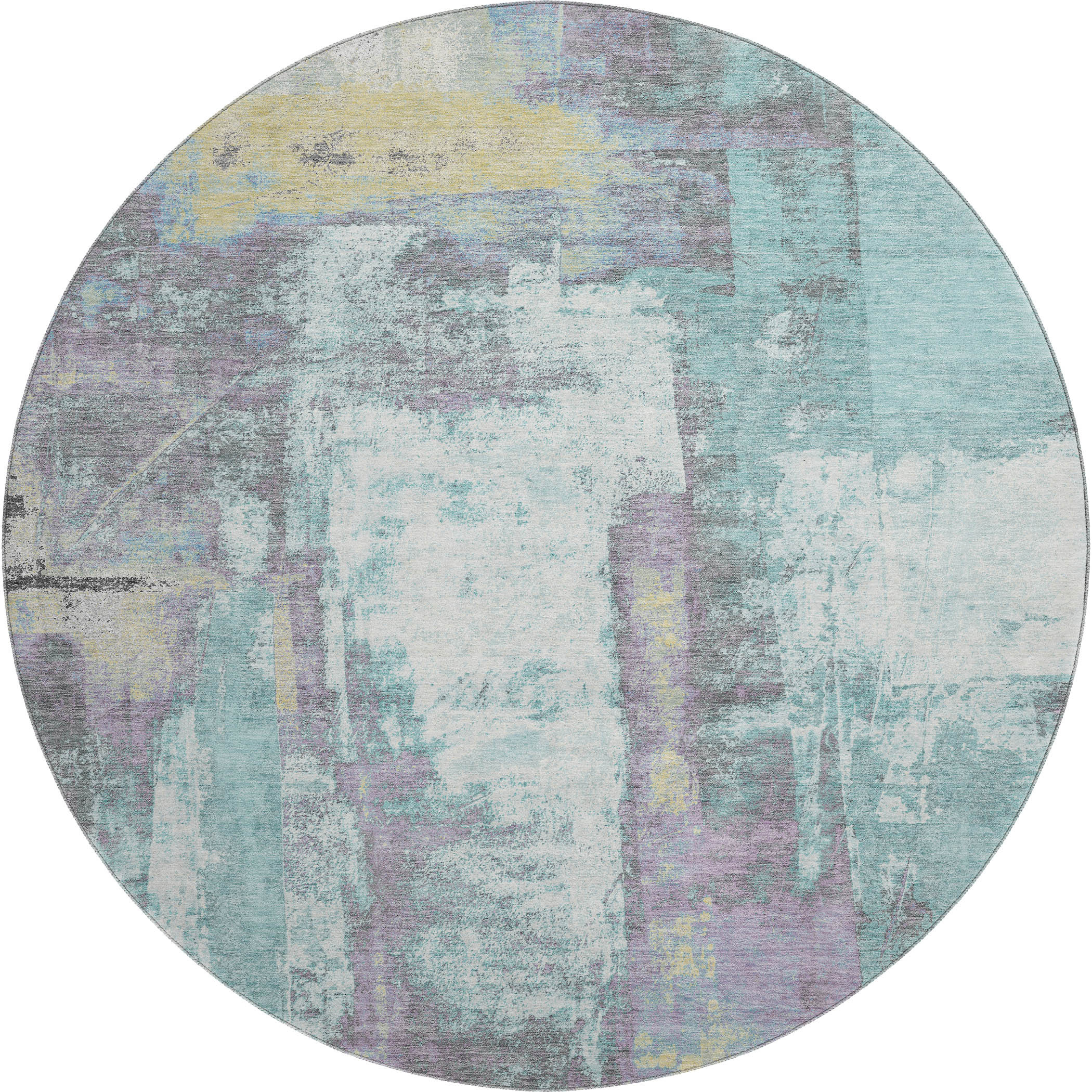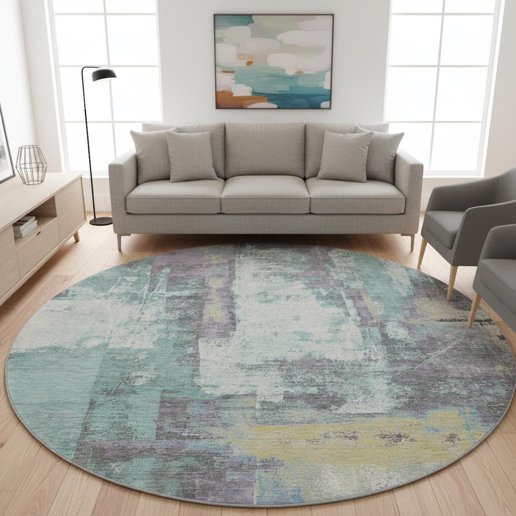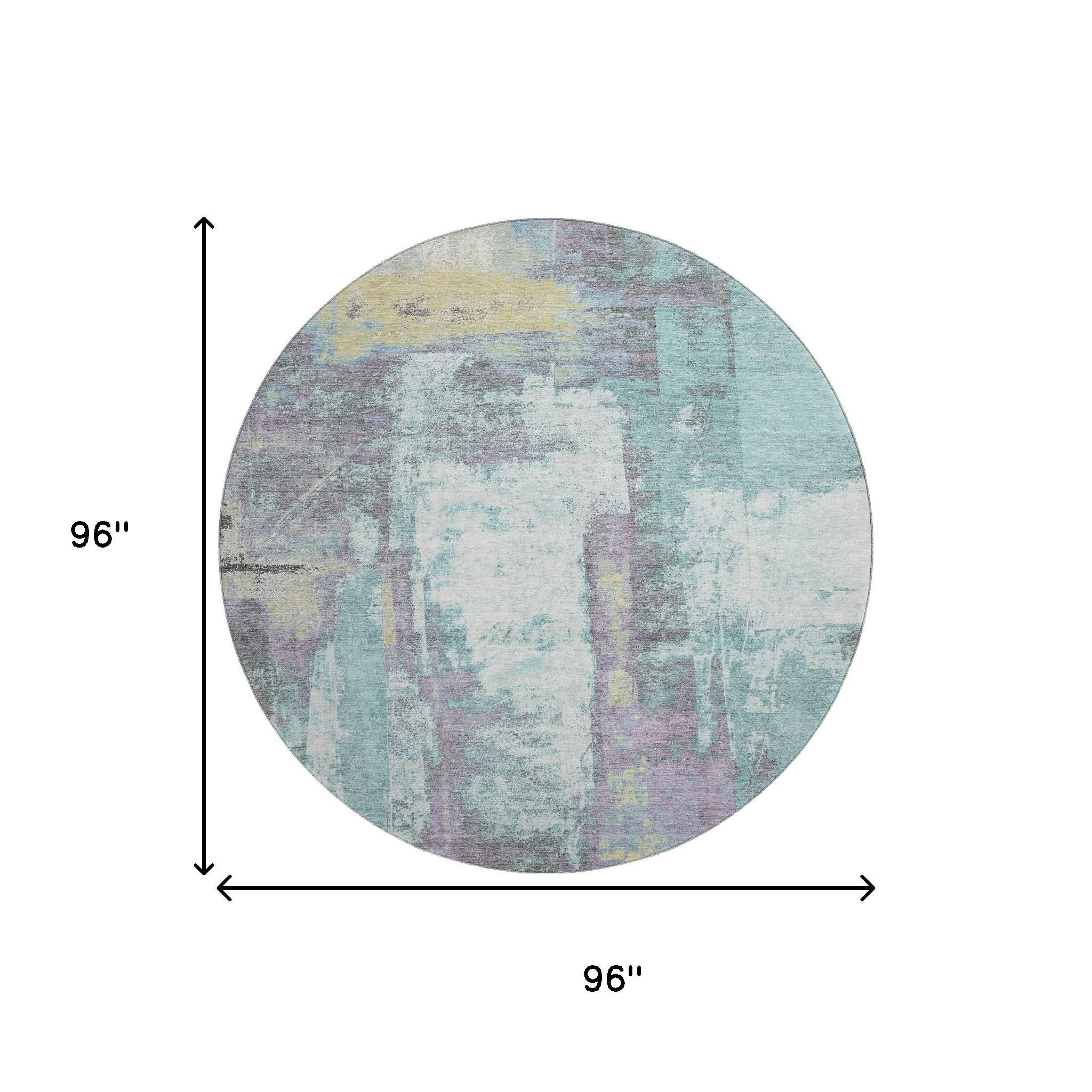 Set an inviting tone in your space with this 8-foot teal ivory and purple abstract washable round rug with uv protection. Ideal for spaces with kids and pets, this rug is stain resistant to help repel dirt and spilled liquids. Built to last, this rug crafted from polyester fibers is known for its durability and long lasting appeal. Rugs are a great way to showcase your style, hide imperfections, warm your home and reduce noise. This larger sized, transitional styled rug is ready to create a focal point or statement piece in your room. 96.00-inch h x 96.00-inch w x 0.39-inch d.