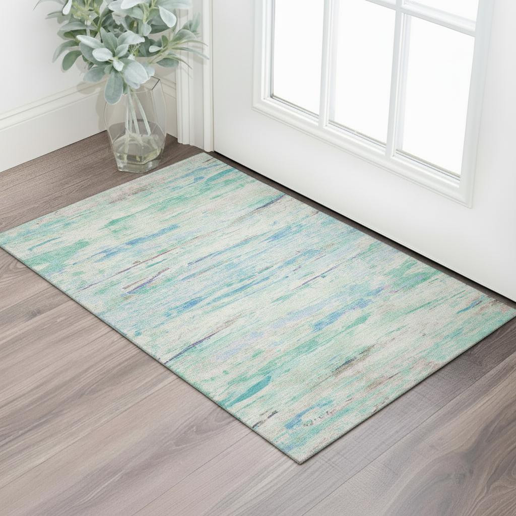 Add great coloration and comfortable texture to your space with this 3-foot x 5-foot teal and ivory abstract washable area rug with uv protection. Ideal for spaces with kids and pets, this rug is stain resistant to help repel dirt and spilled liquids. Built to last, this rug crafted from polyester fibers is known for its durability and long lasting appeal. Rugs are a great way to showcase your style, hide imperfections, warm your home and reduce noise. This smaller sized, transitional styled rug is just what you need for your walkway, bedside, in front of door, cabinet, refrigerator, or chair. 36.00-inch h x 60.00-inch w x 0.39-inch d.