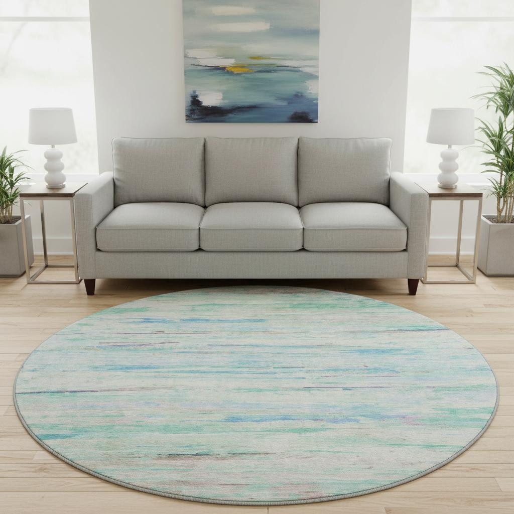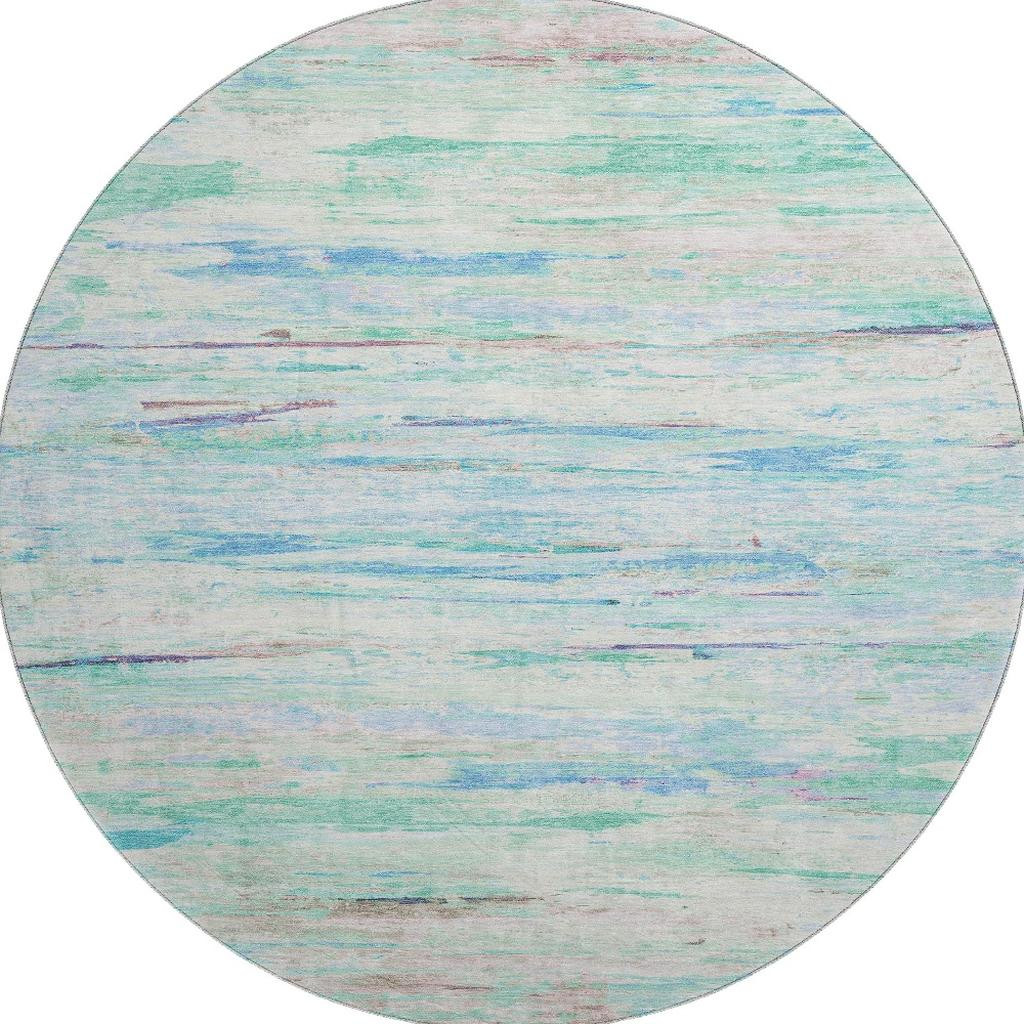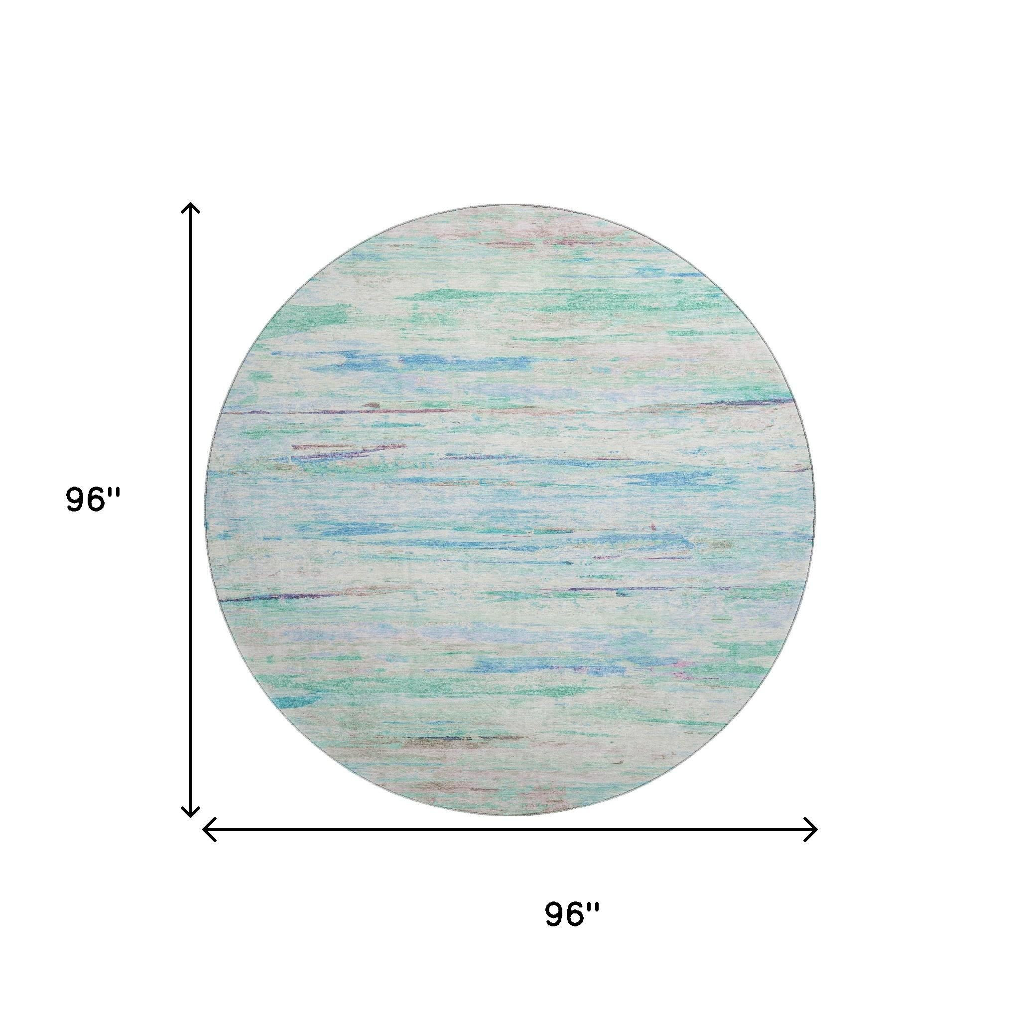 Set an inviting tone in your space with this 8-foot teal and ivory abstract washable round rug with uv protection. Ideal for spaces with kids and pets, this rug is stain resistant to help repel dirt and spilled liquids. Built to last, this rug crafted from polyester fibers is known for its durability and long lasting appeal. Rugs are a great way to showcase your style, hide imperfections, warm your home and reduce noise. This larger sized, transitional styled rug is ready to create a focal point or statement piece in your room. 96.00-inch h x 96.00-inch w x 0.39-inch d.