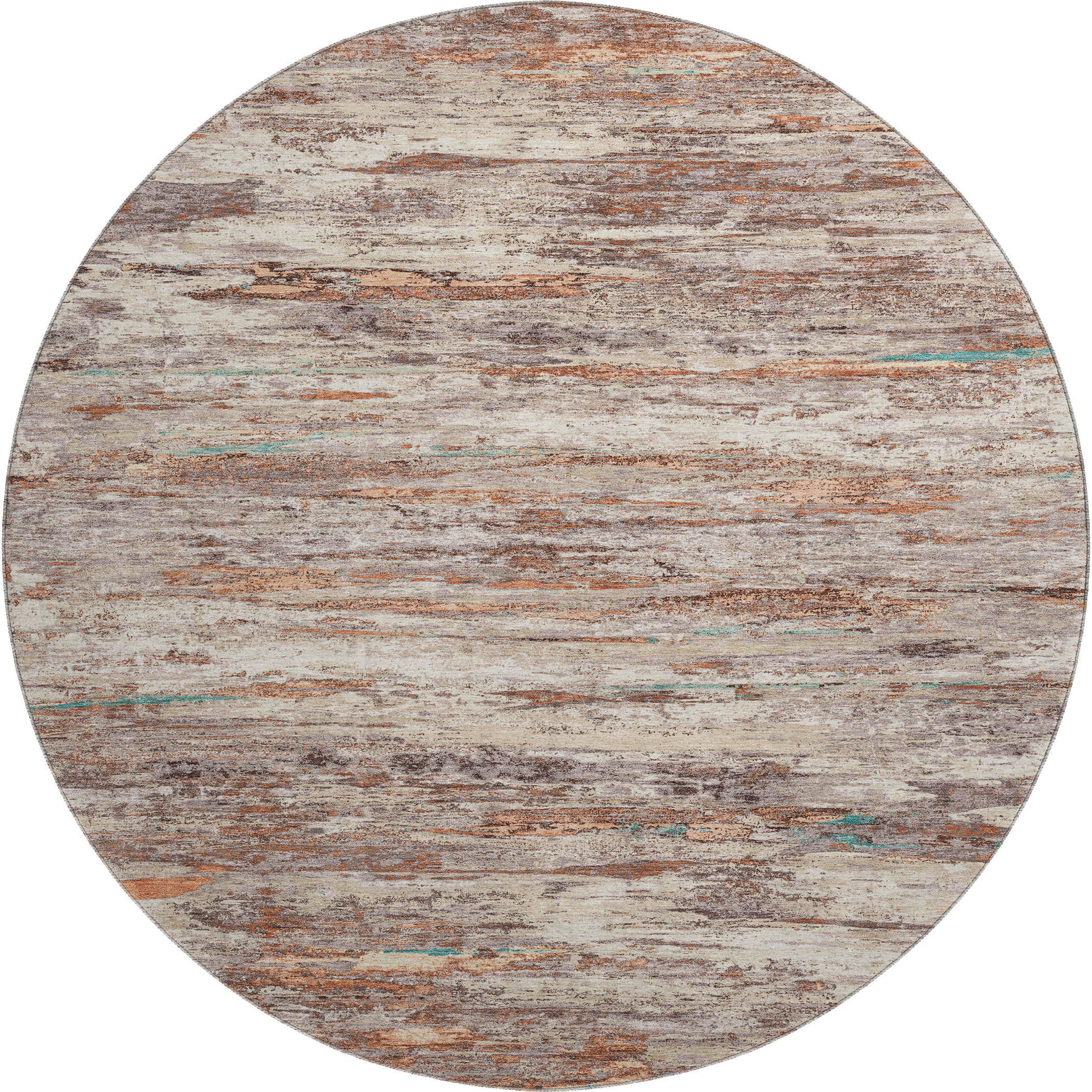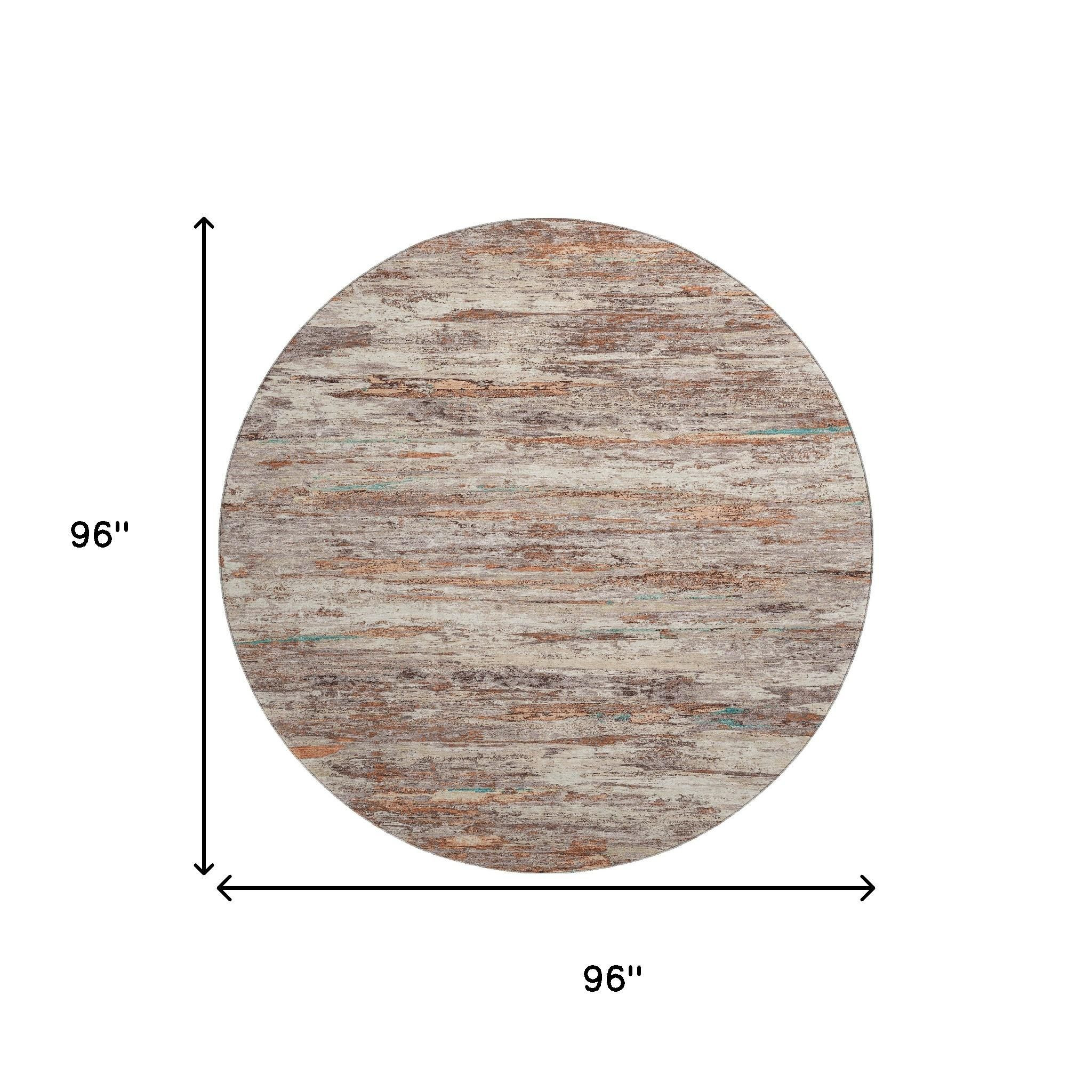 This 8-foot terra cotta beige and teal abstract washable round rug with uv protection, is a great way to add warmth to a room. Ideal for spaces with kids and pets, this rug is stain resistant to help repel dirt and spilled liquids. Built to last, this rug crafted from polyester fibers is known for its durability and long lasting appeal. Rugs are a great way to showcase your style, hide imperfections, warm your home and reduce noise. This larger sized, transitional styled rug is ready to create a focal point or statement piece in your room. 96.00-inch h x 96.00-inch w x 0.39-inch d.