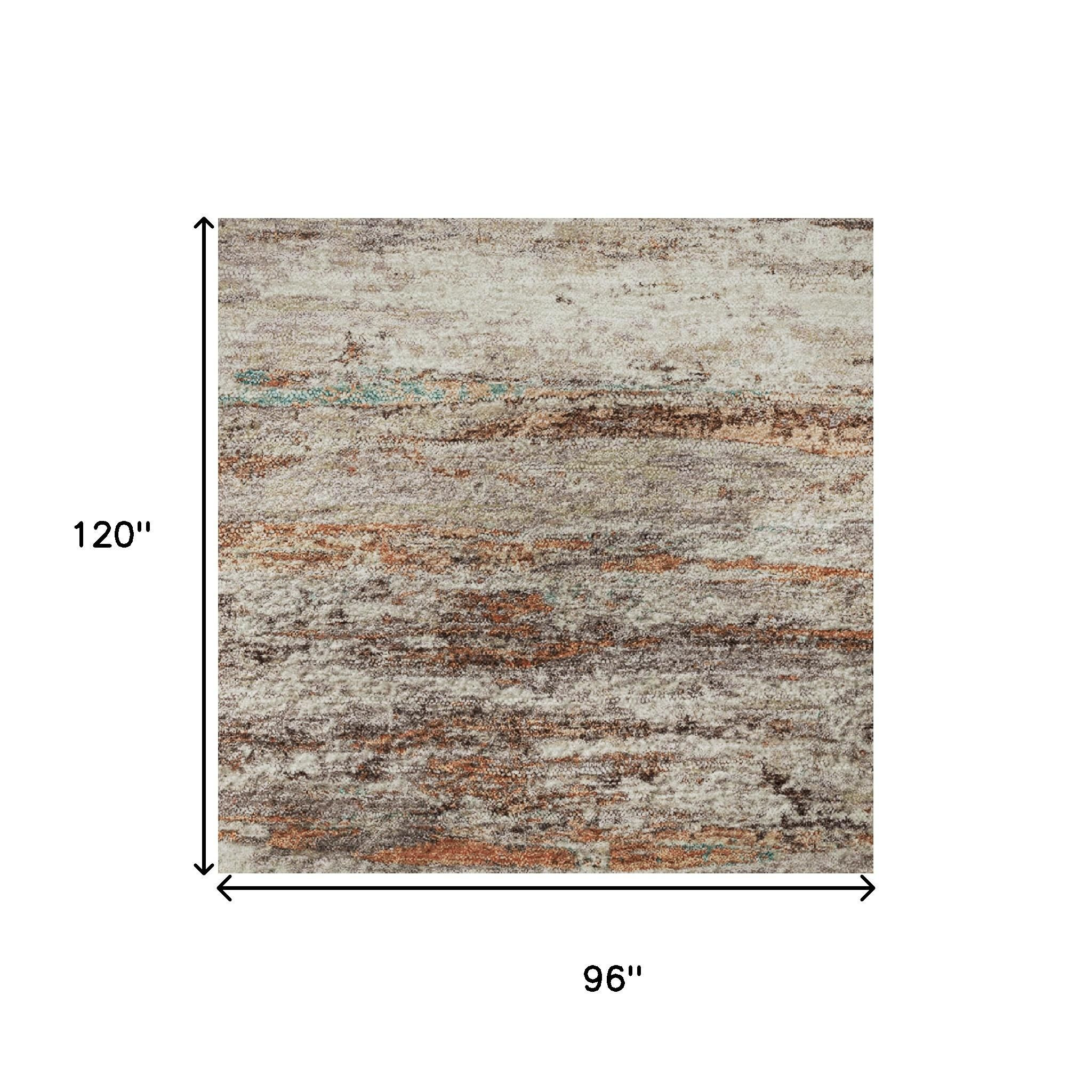 This 8-foot x 10-foot terra cotta beige and teal abstract washable area rug with uv protection, is a great way to add warmth to a room. Ideal for spaces with kids and pets, this rug is stain resistant to help repel dirt and spilled liquids. Built to last, this rug crafted from polyester fibers is known for its durability and long lasting appeal. Rugs are a great way to showcase your style, hide imperfections, warm your home and reduce noise. This larger sized, transitional styled rug is ready to create a focal point or statement piece in your room. 96.00-inch h x 120.00-inch w x 0.39-inch d.