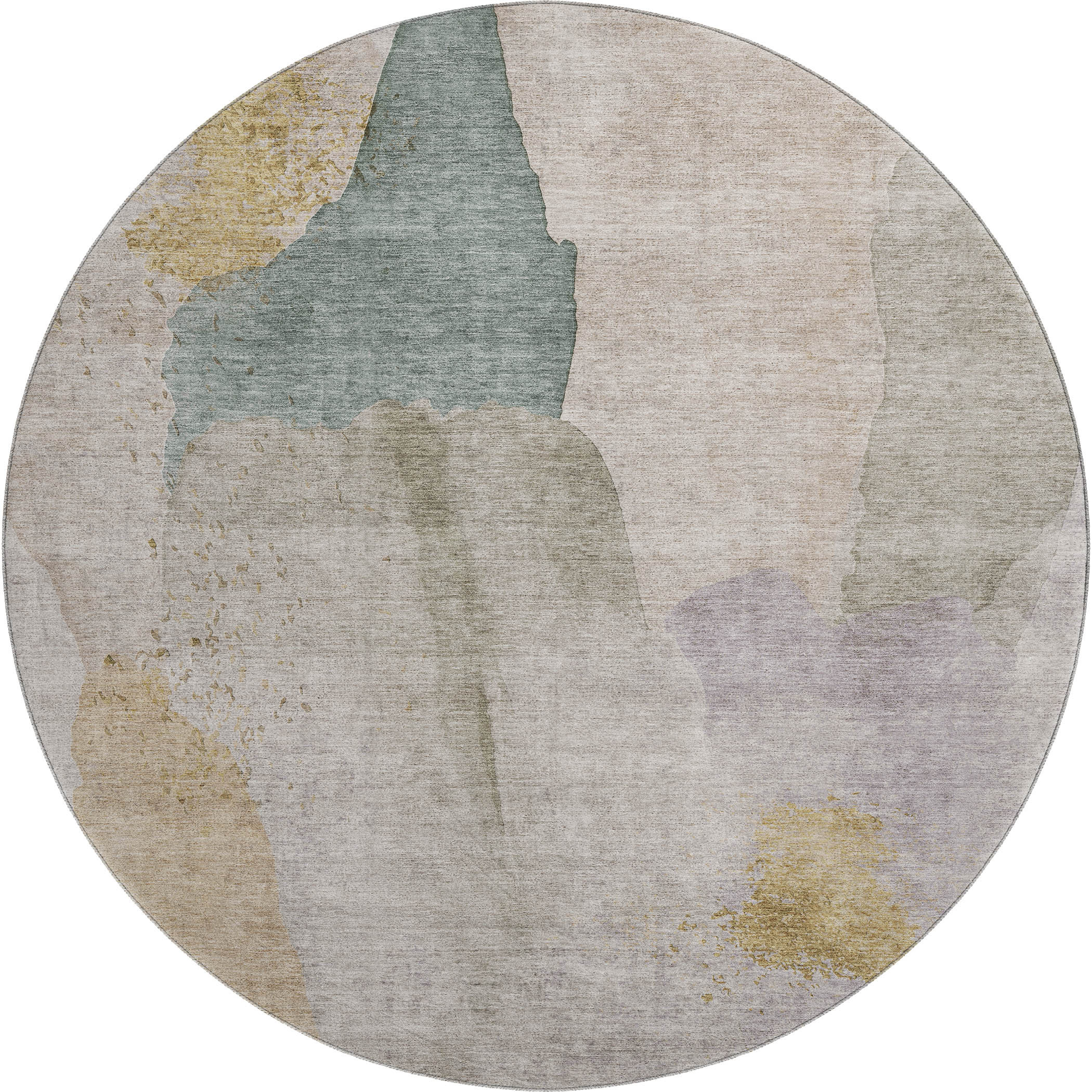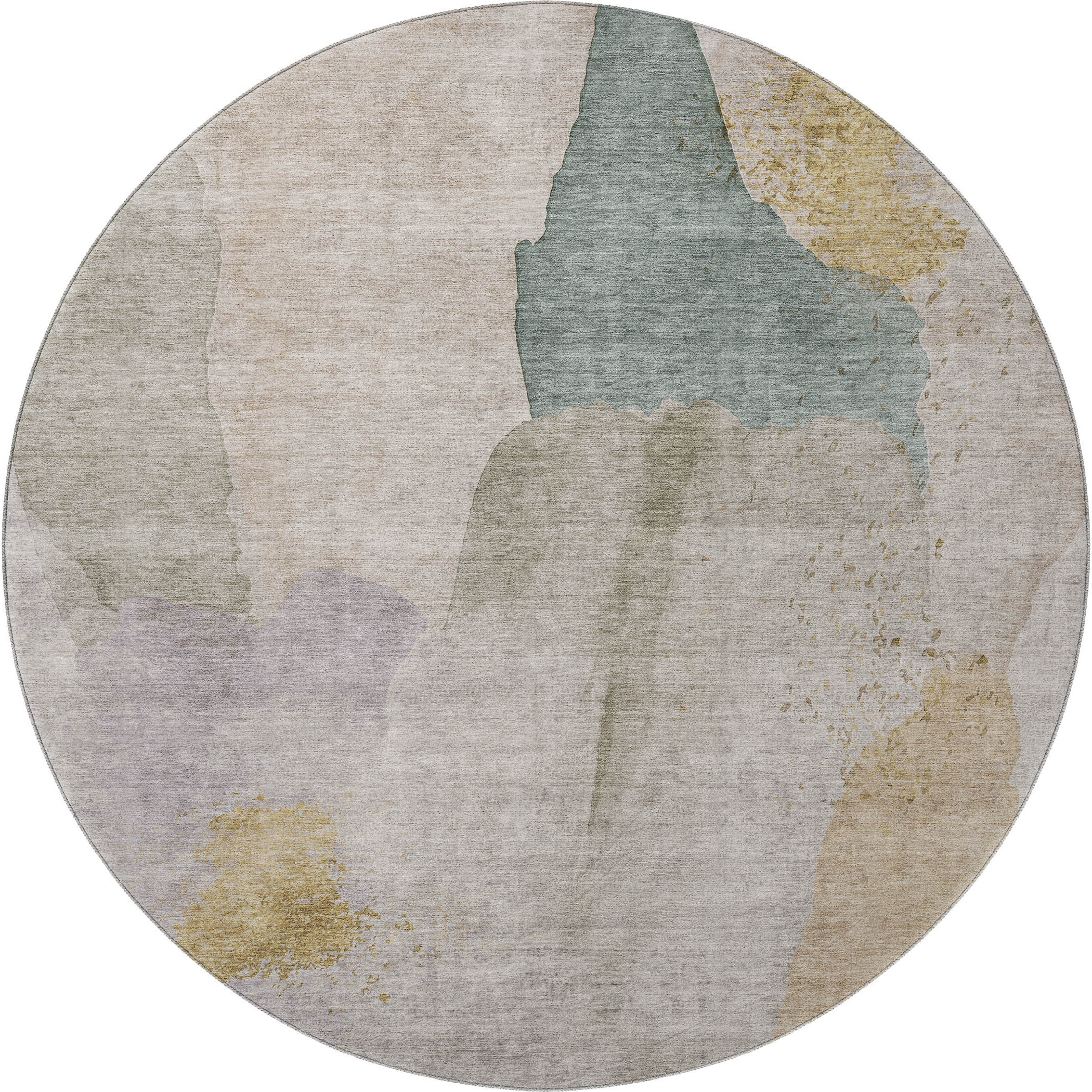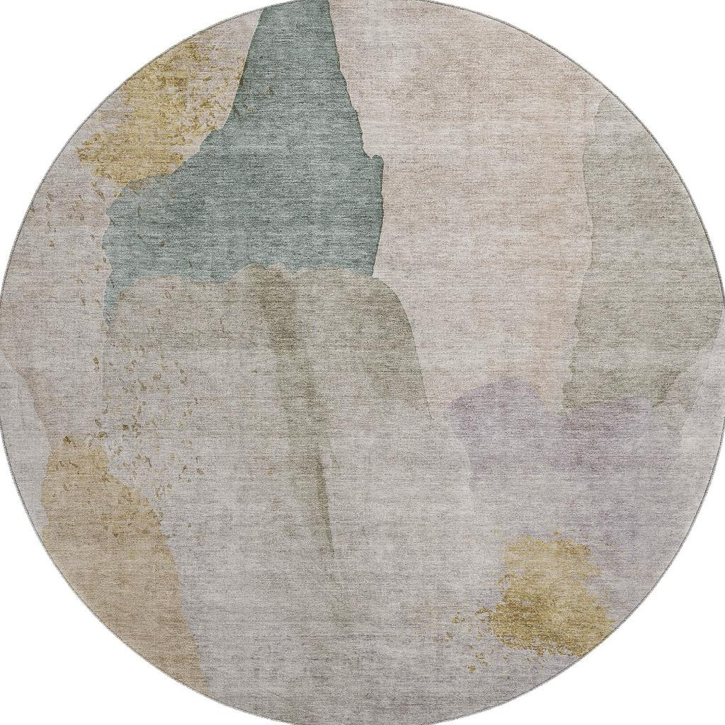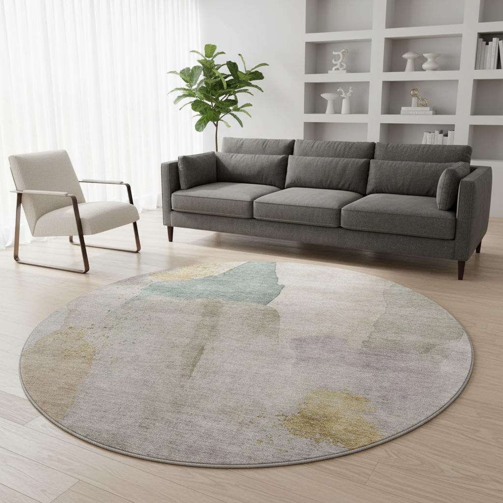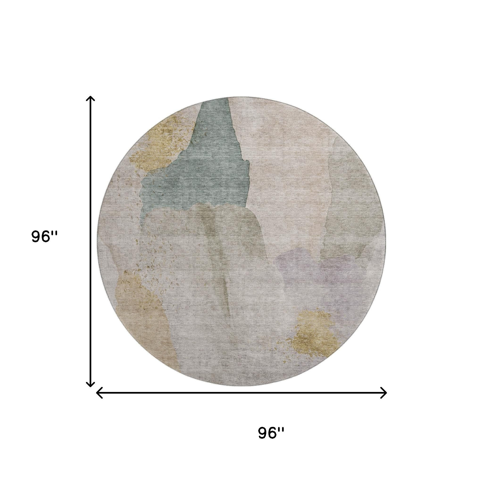 Add great coloration and comfortable texture to your space with this 8-foot beige taupe and lavender abstract washable round rug with uv protection. Ideal for spaces with kids and pets, this rug is stain resistant to help repel dirt and spilled liquids. Built to last, this rug crafted from polyester fibers is known for its durability and long lasting appeal. Rugs are a great way to showcase your style, hide imperfections, warm your home and reduce noise. This larger sized, transitional styled rug is ready to create a focal point or statement piece in your room. 96.00-inch h x 96.00-inch w x 0.39-inch d.