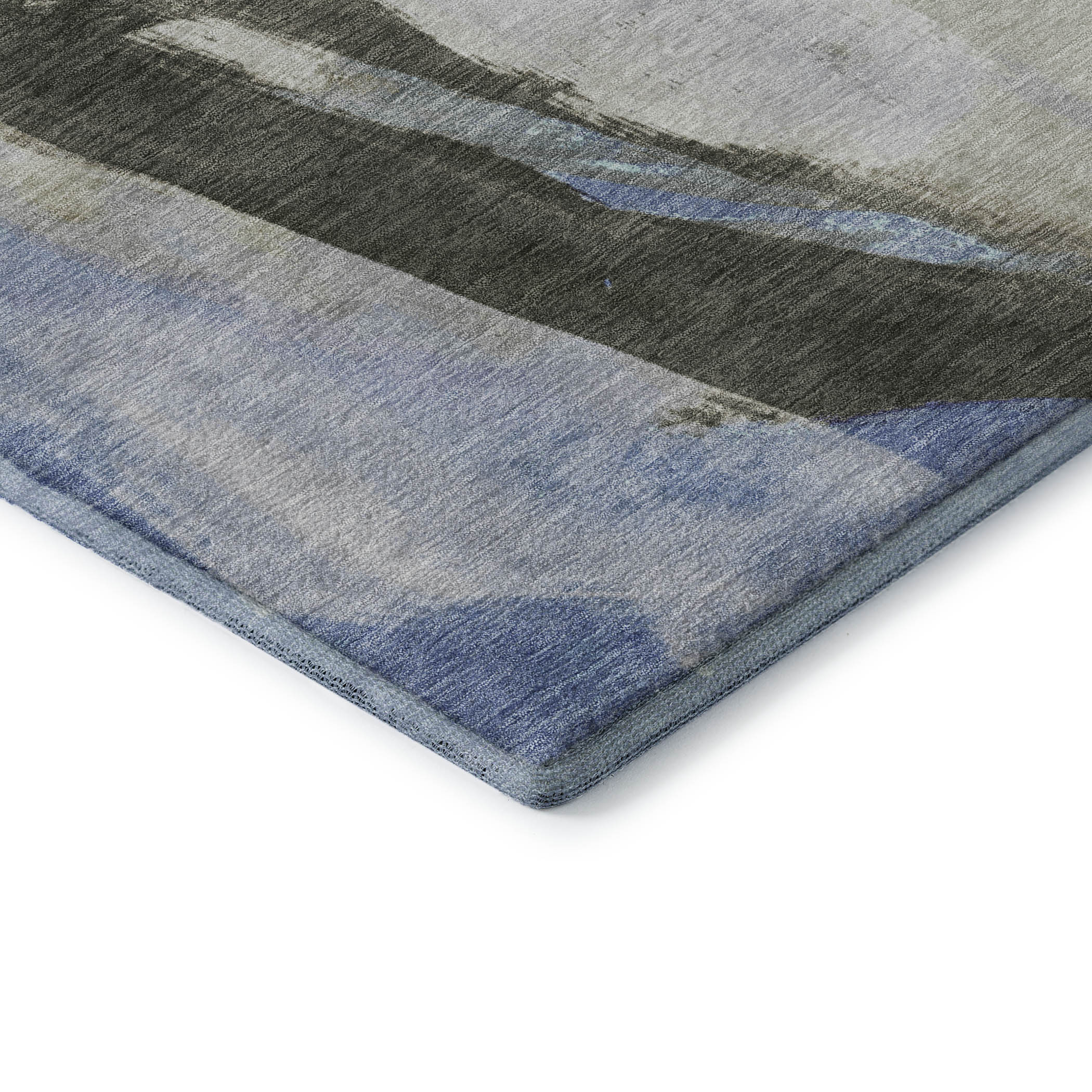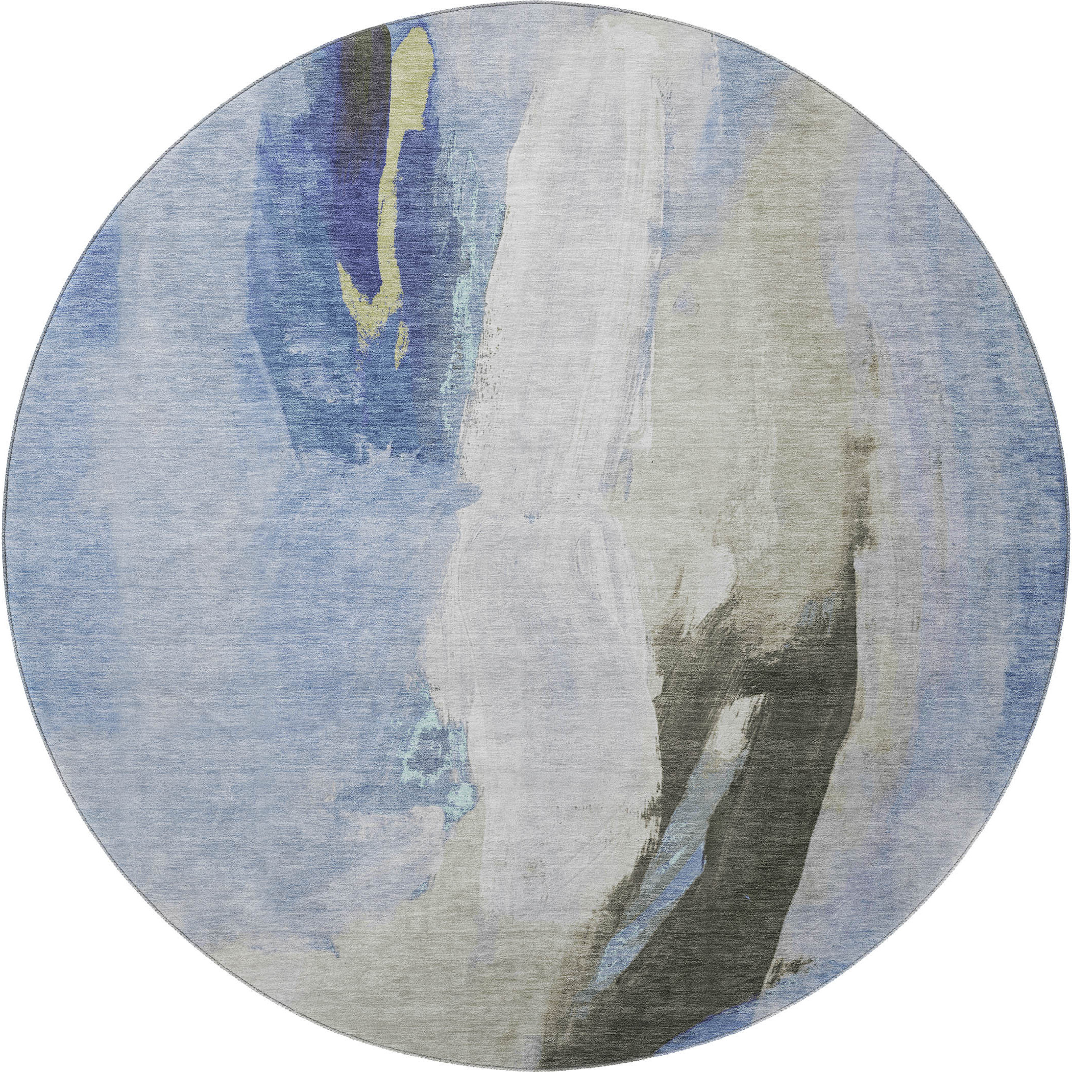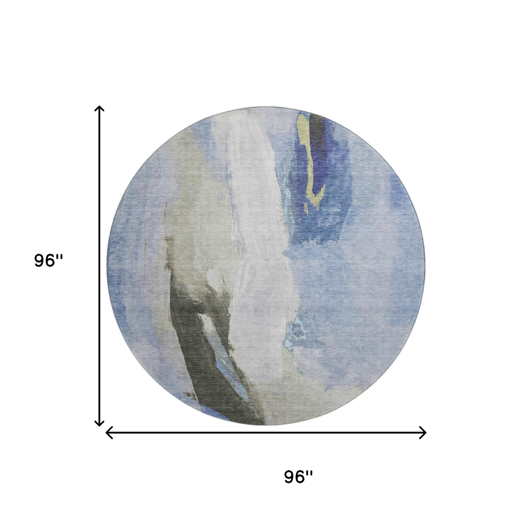 Add some artistry to your room with this 8-foot denim blue gray and ivory abstract washable round rug with uv protection. Ideal for spaces with kids and pets, this rug is stain resistant to help repel dirt and spilled liquids. Built to last, this rug crafted from polyester fibers is known for its durability and long lasting appeal. Rugs are a great way to showcase your style, hide imperfections, warm your home and reduce noise. This larger sized, transitional styled rug is ready to create a focal point or statement piece in your room. 96.00-inch h x 96.00-inch w x 0.39-inch d.