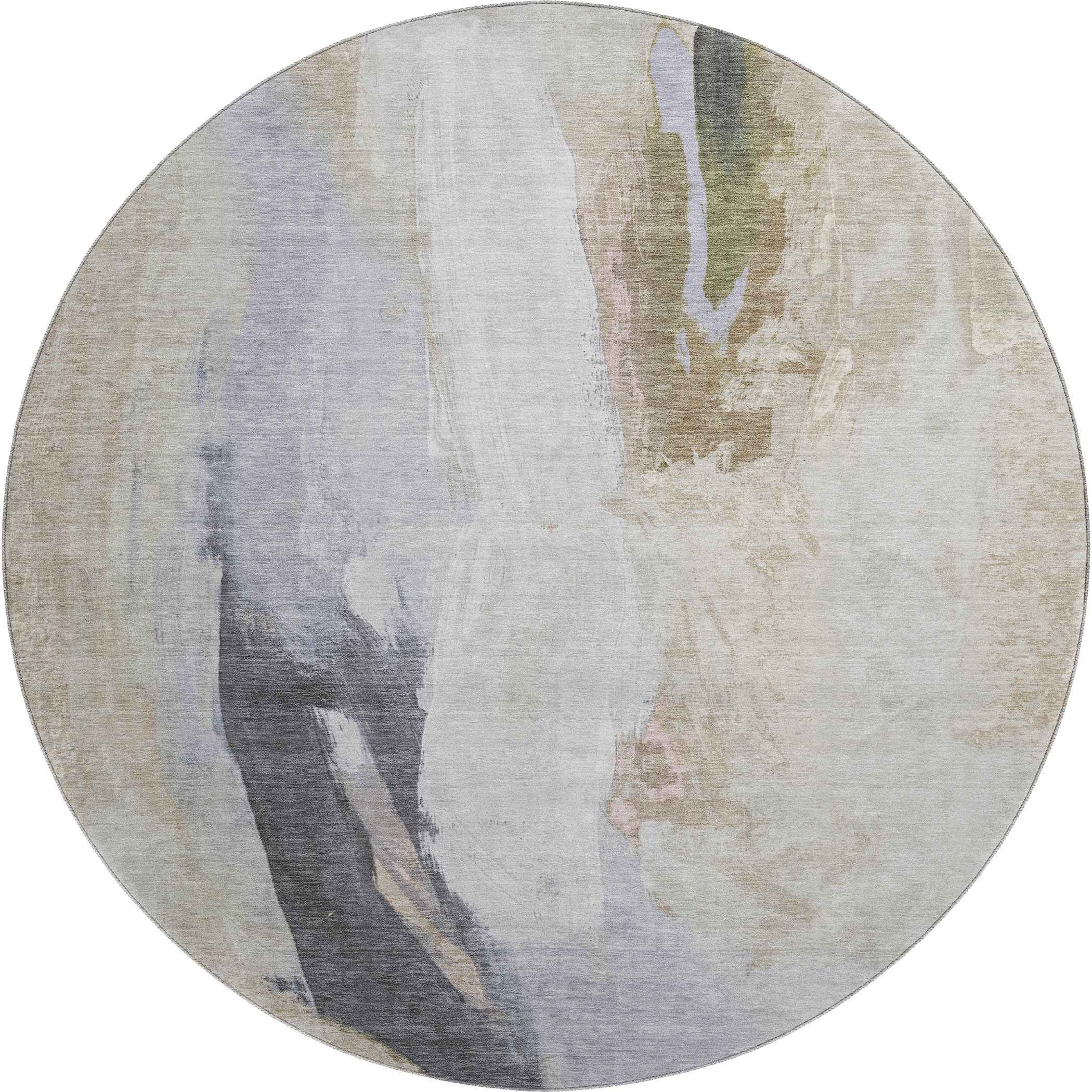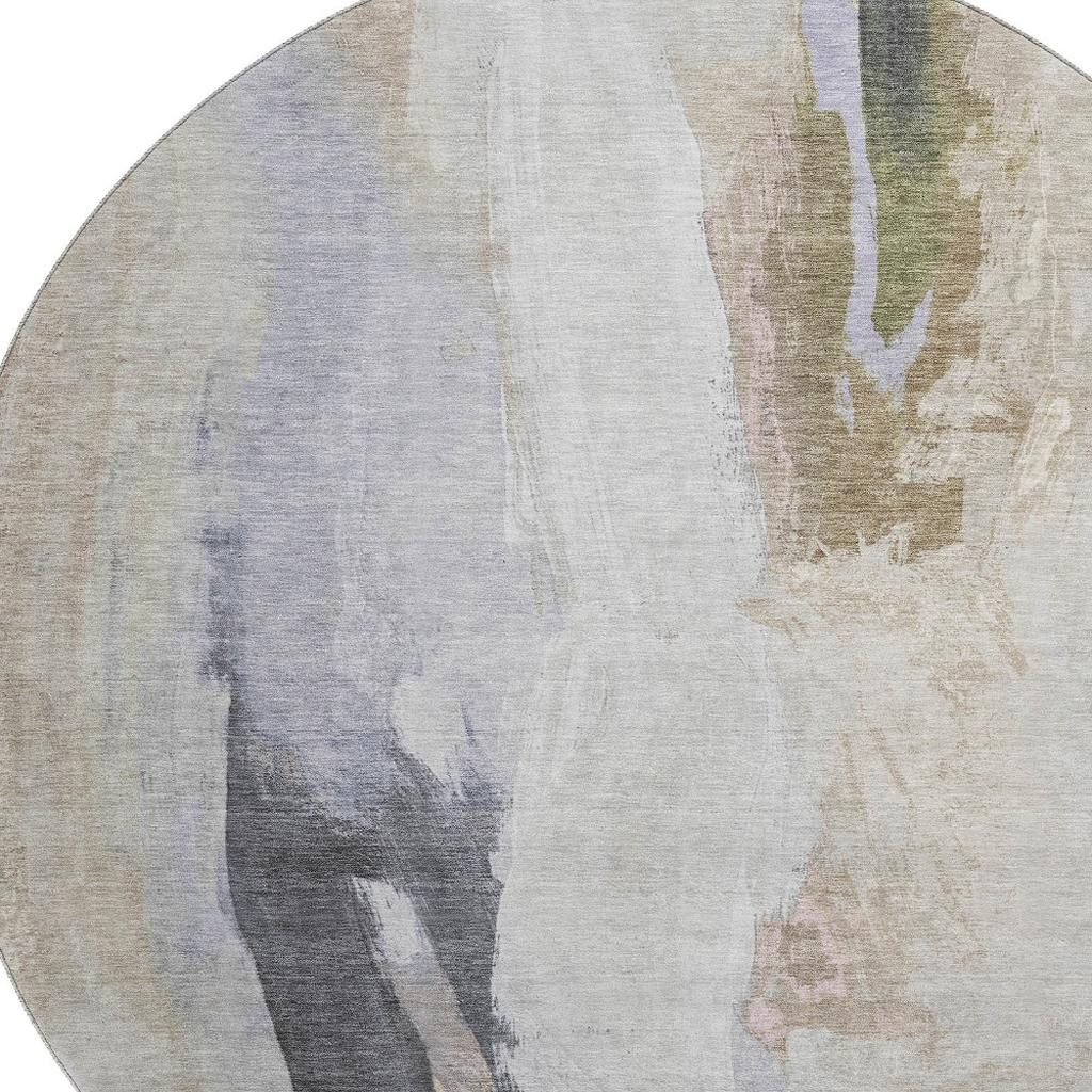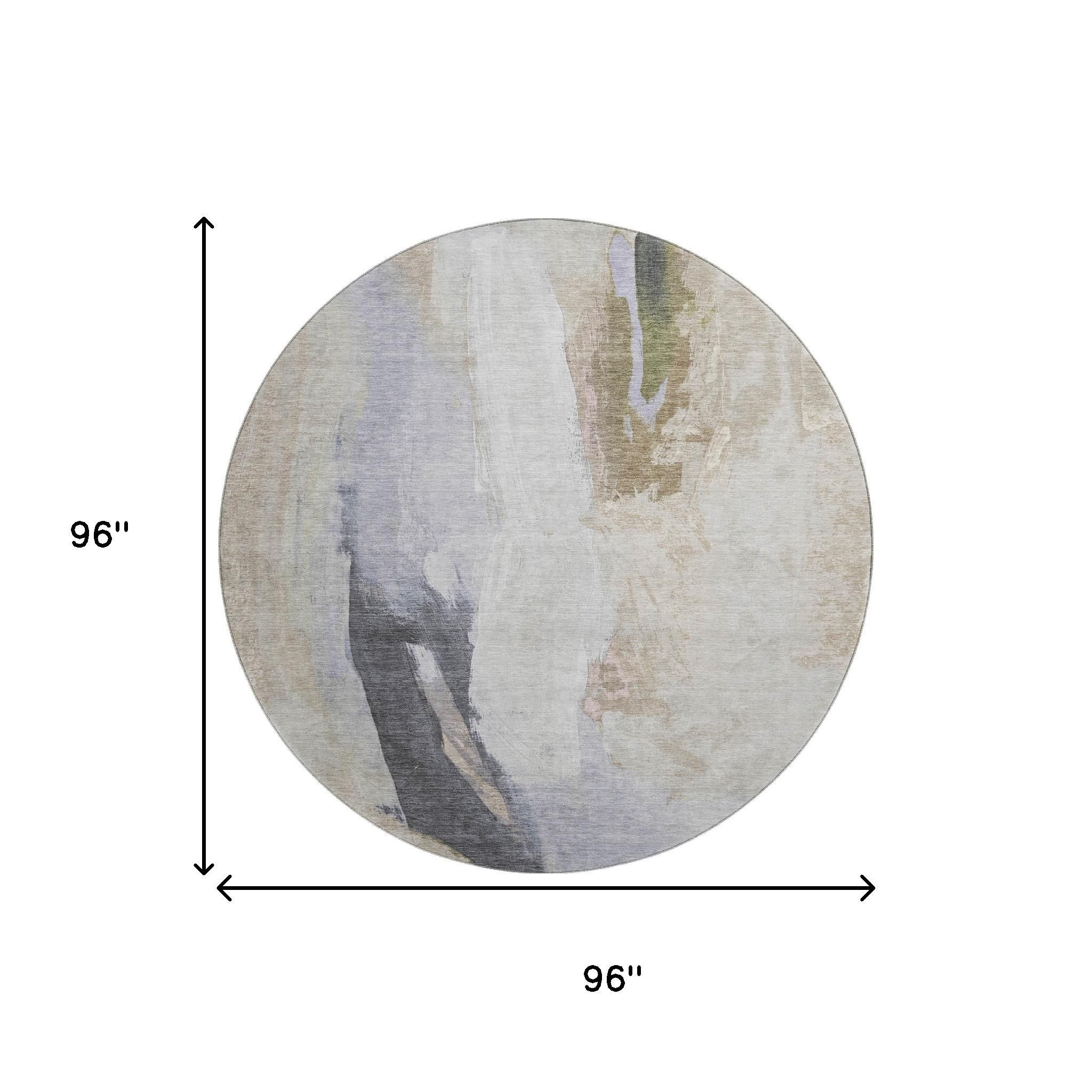 Add some artistry to your room with this 8-foot ivory charcoal and beige abstract washable round rug with uv protection. Ideal for spaces with kids and pets, this rug is stain resistant to help repel dirt and spilled liquids. Built to last, this rug crafted from polyester fibers is known for its durability and long lasting appeal. Rugs are a great way to showcase your style, hide imperfections, warm your home and reduce noise. This larger sized, transitional styled rug is ready to create a focal point or statement piece in your room. 96.00-inch h x 96.00-inch w x 0.39-inch d.