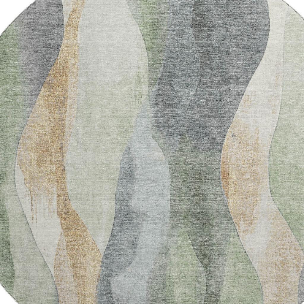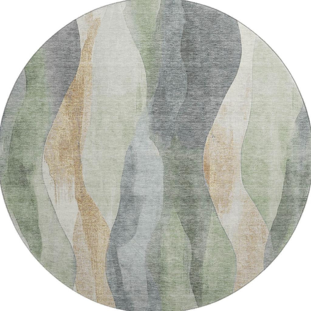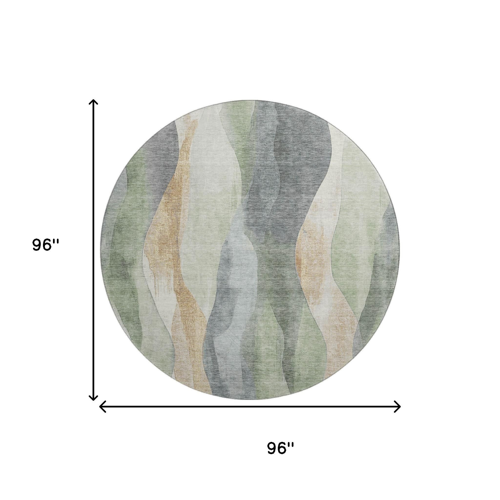 This 8-foot artichoke green gray and beige abstract washable round rug with uv protection, is a great way to add warmth to a room. Ideal for spaces with kids and pets, this rug is stain resistant to help repel dirt and spilled liquids. Built to last, this rug crafted from polyester fibers is known for its durability and long lasting appeal. Rugs are a great way to showcase your style, hide imperfections, warm your home and reduce noise. This larger sized, transitional styled rug is ready to create a focal point or statement piece in your room. 96.00-inch h x 96.00-inch w x 0.39-inch d.