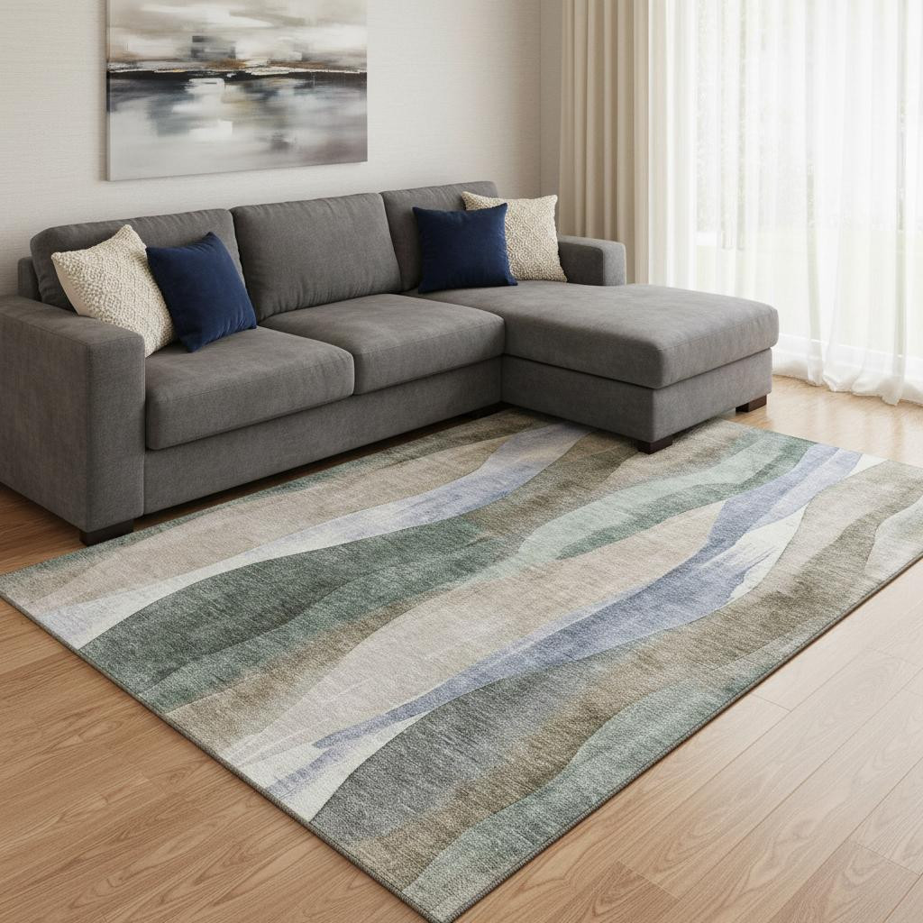 Add some artistry to your room with this 8-foot x 10-foot beige blue and ivory abstract washable area rug with uv protection. Ideal for spaces with kids and pets, this rug is stain resistant to help repel dirt and spilled liquids. Built to last, this rug crafted from polyester fibers is known for its durability and long lasting appeal. Rugs are a great way to showcase your style, hide imperfections, warm your home and reduce noise. This larger sized, transitional styled rug is ready to create a focal point or statement piece in your room. 96.00-inch h x 120.00-inch w x 0.39-inch d.