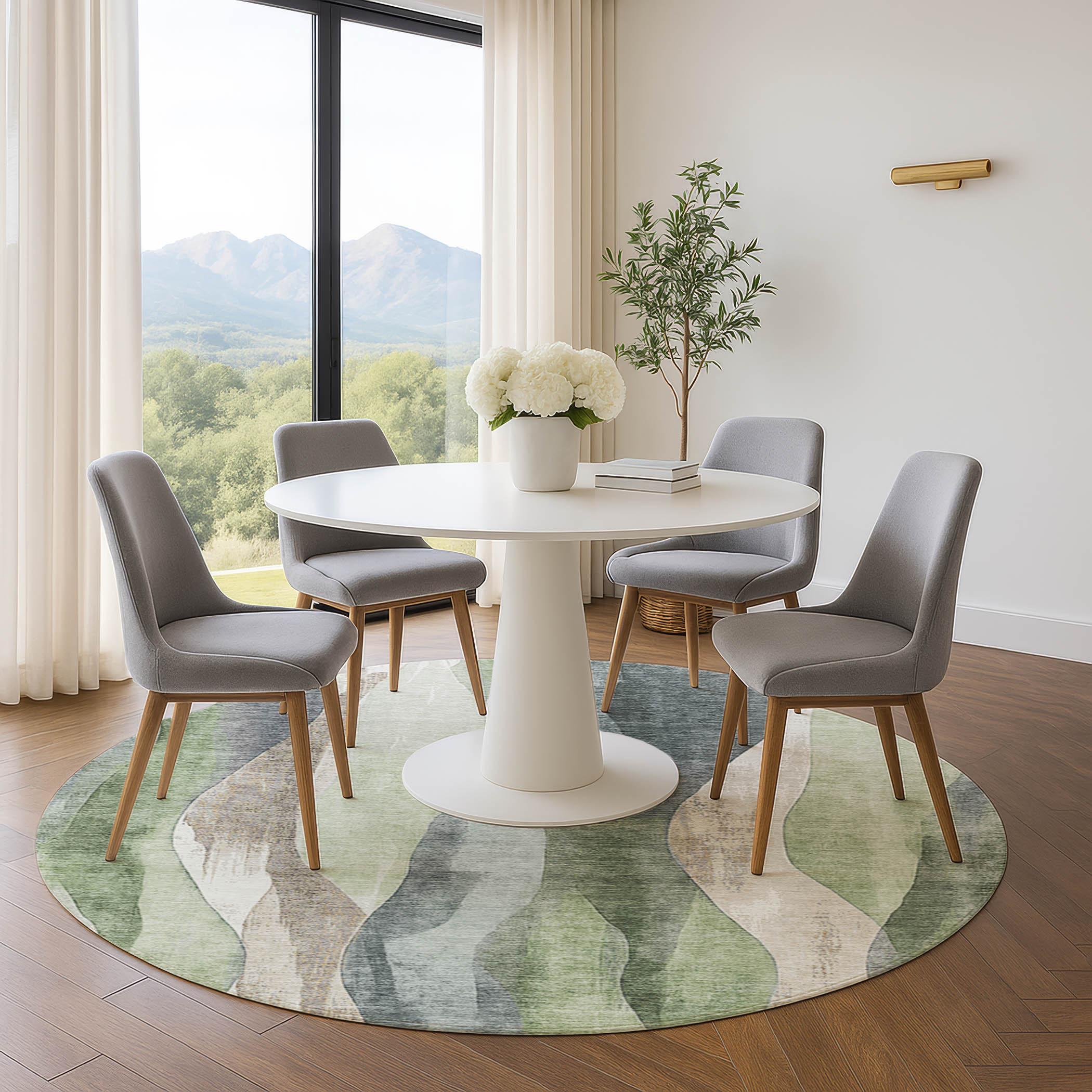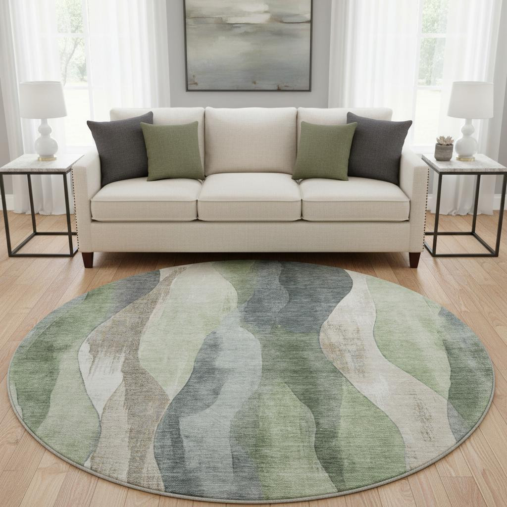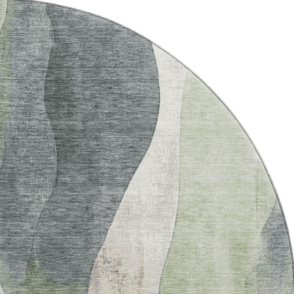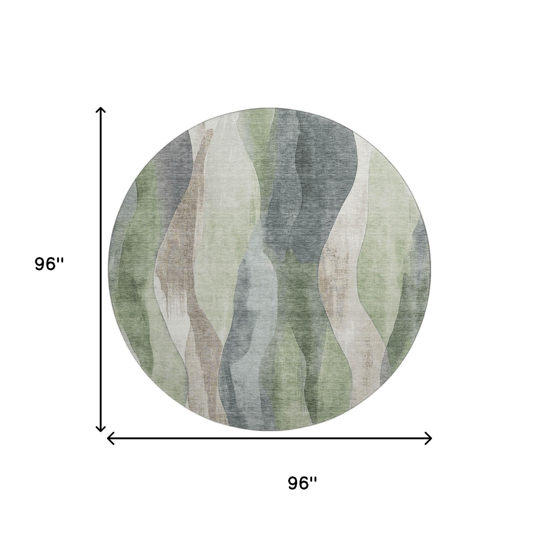 Add some artistry to your room with this 8-foot fern green beige and gray abstract washable round rug with uv protection. Ideal for spaces with kids and pets, this rug is stain resistant to help repel dirt and spilled liquids. Built to last, this rug crafted from polyester fibers is known for its durability and long lasting appeal. Rugs are a great way to showcase your style, hide imperfections, warm your home and reduce noise. This larger sized, transitional styled rug is ready to create a focal point or statement piece in your room. 96.00-inch h x 96.00-inch w x 0.39-inch d.