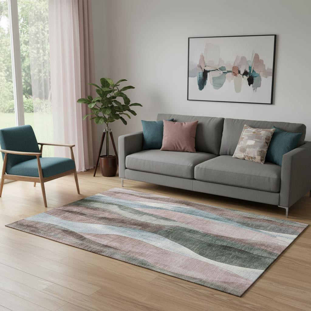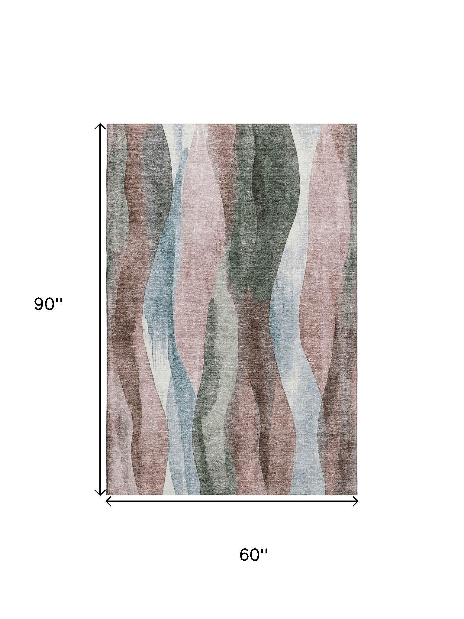 Add some artistry to your room with this 5-foot x 8-foot salmon blue and mauve abstract washable area rug with uv protection. Ideal for spaces with kids and pets, this rug is stain resistant to help repel dirt and spilled liquids. Built to last, this rug crafted from polyester fibers is known for its durability and long lasting appeal. Rugs are a great way to showcase your style, hide imperfections, warm your home and reduce noise. This larger sized, transitional styled rug is ready to create a focal point or statement piece in your room. 60.00-inch h x 90.00-inch w x 0.39-inch d.