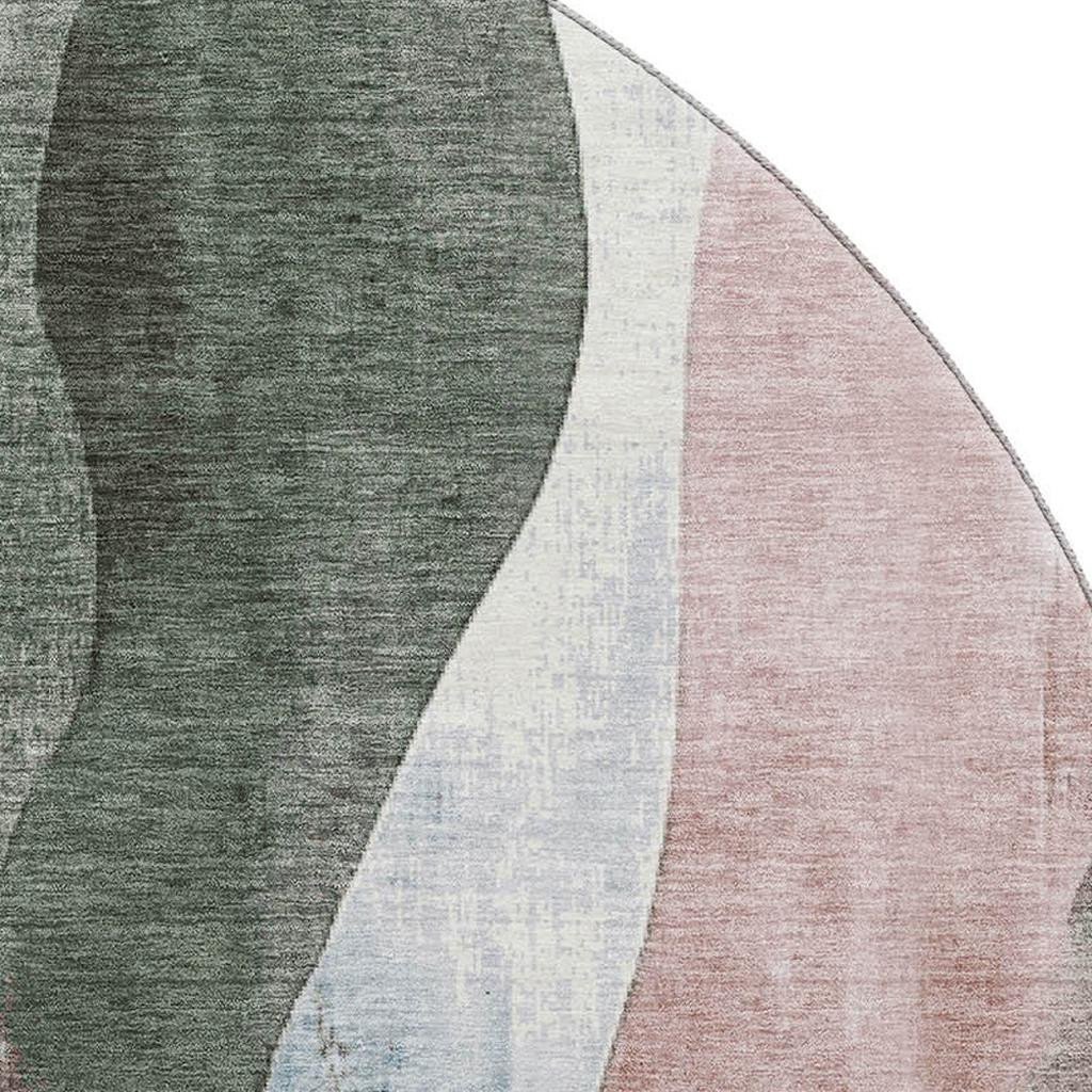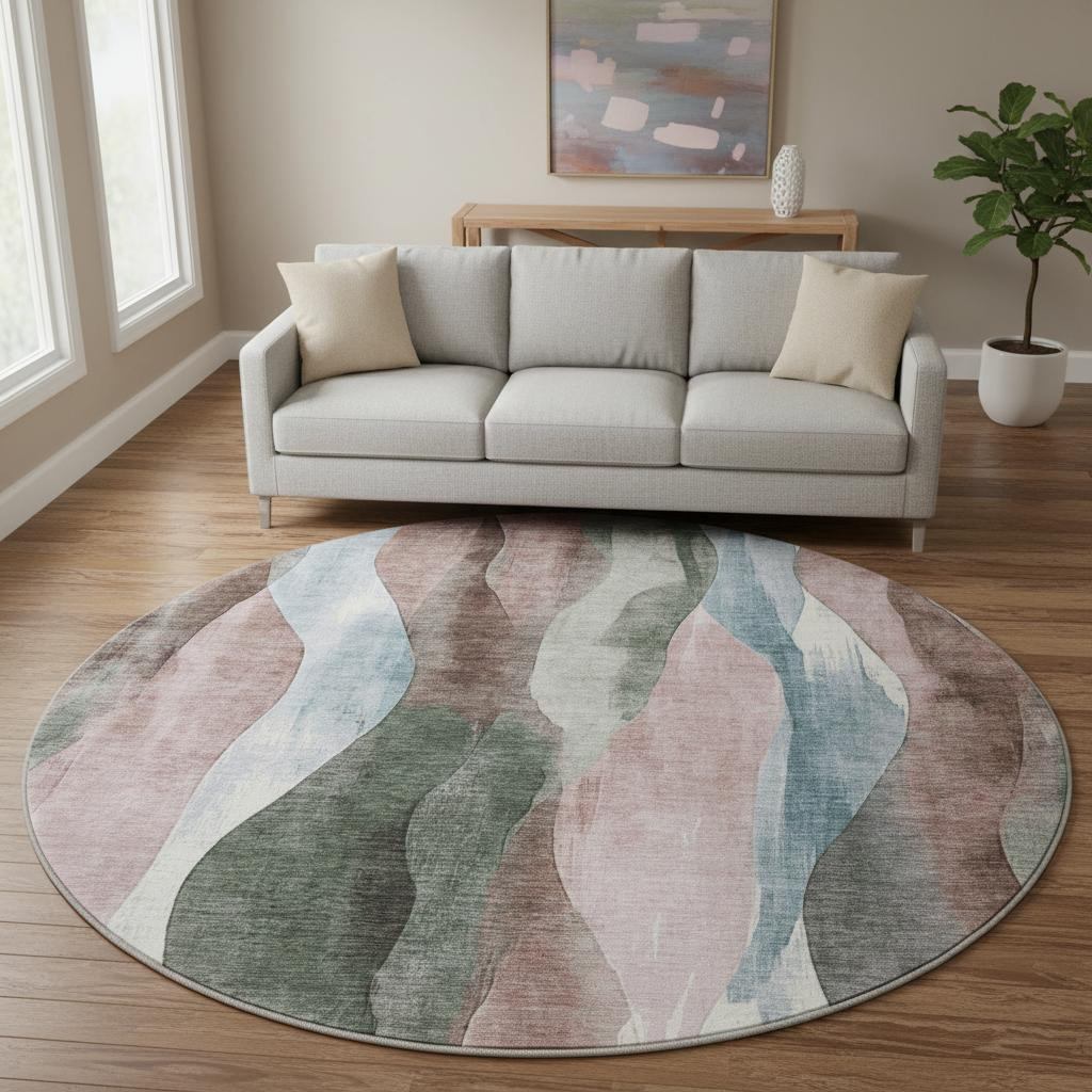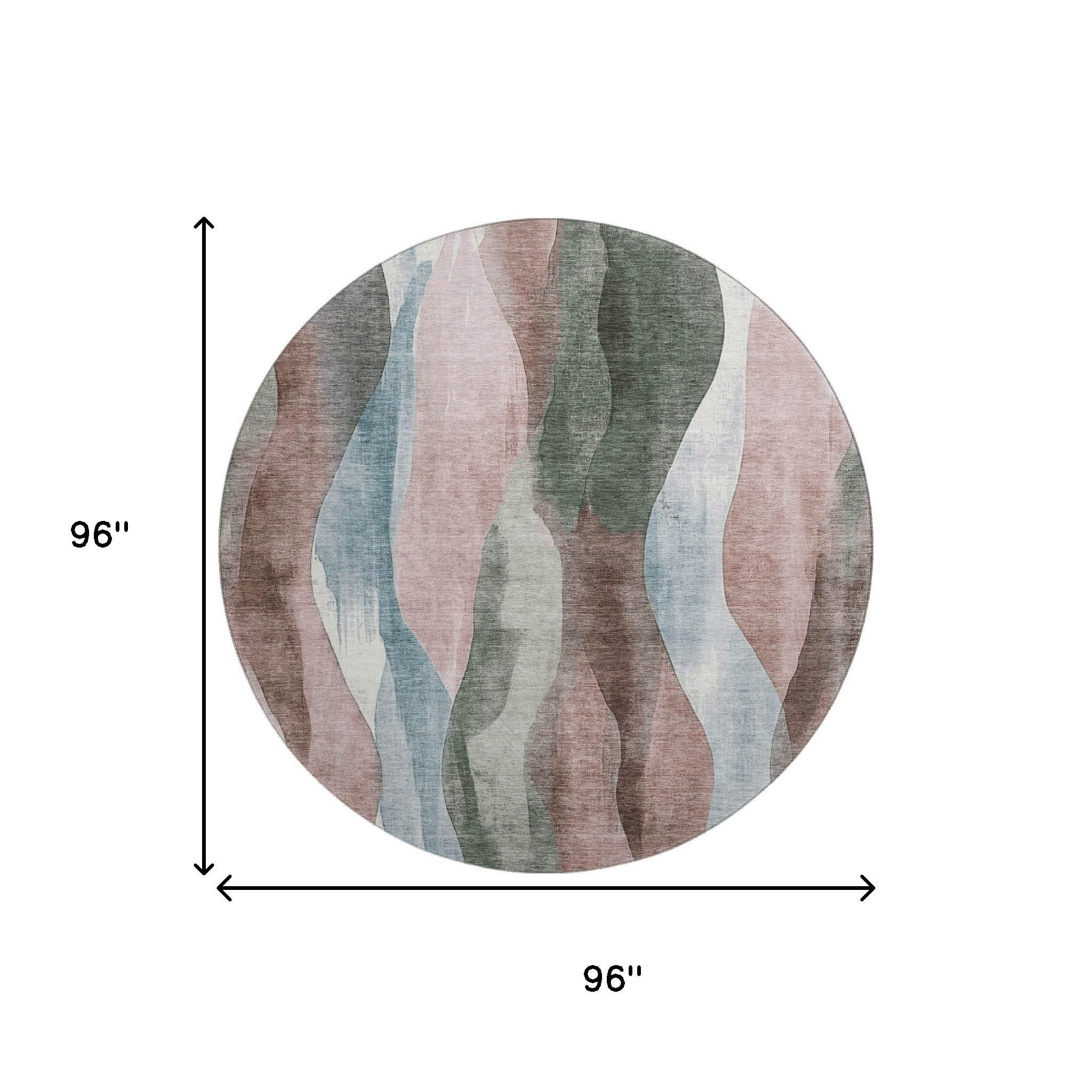 This 8-foot salmon blue and mauve abstract washable round rug with uv protection, is a great way to add warmth to a room. Ideal for spaces with kids and pets, this rug is stain resistant to help repel dirt and spilled liquids. Built to last, this rug crafted from polyester fibers is known for its durability and long lasting appeal. Rugs are a great way to showcase your style, hide imperfections, warm your home and reduce noise. This larger sized, transitional styled rug is ready to create a focal point or statement piece in your room. 96.00-inch h x 96.00-inch w x 0.39-inch d.
