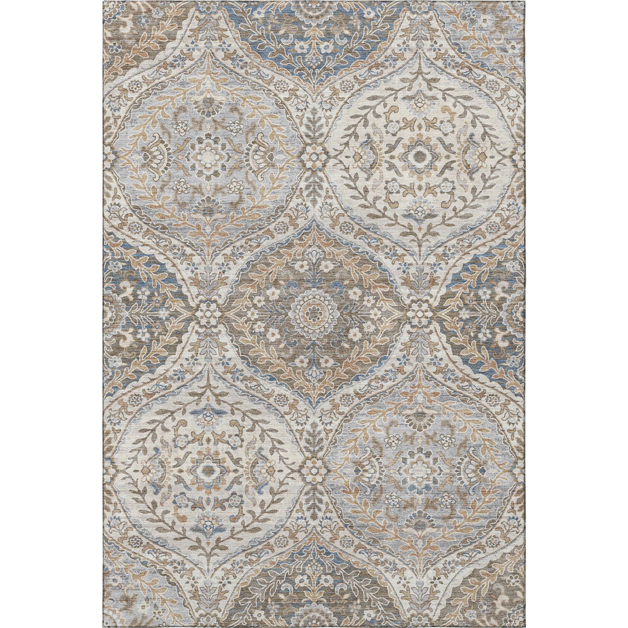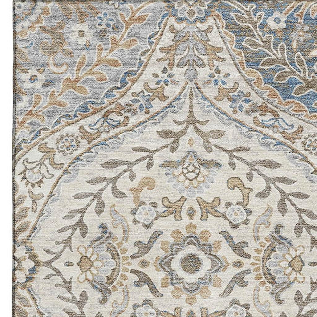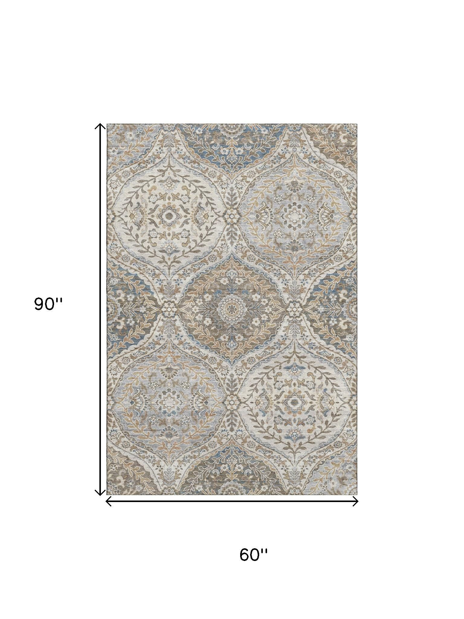 This 5-foot x 8-foot beige ivory and blue floral washable area rug with uv protection, is a great way to add warmth to a room. Ideal for spaces with kids and pets, this rug is stain resistant to help repel dirt and spilled liquids. Built to last, this rug crafted from polyester fibers is known for its durability and long lasting appeal. Rugs are a great way to showcase your style, hide imperfections, warm your home and reduce noise. This larger sized, traditional styled rug is ready to create a focal point or statement piece in your room. 60.00-inch h x 90.00-inch w x 0.39-inch d.