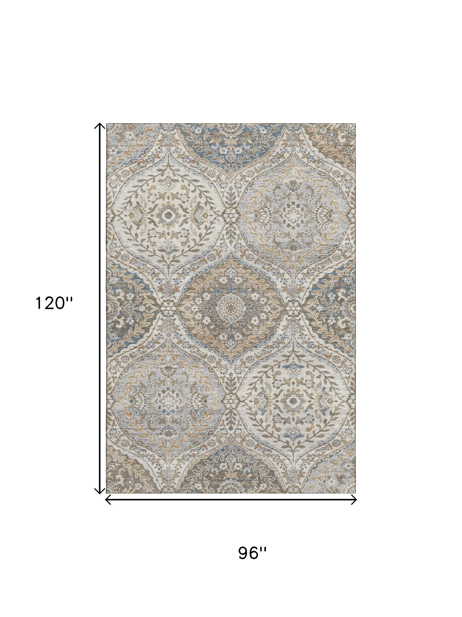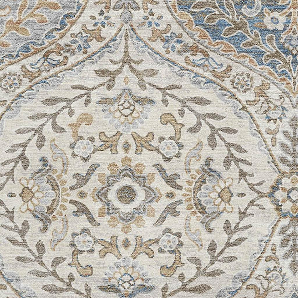 This 8-foot x 10-foot beige ivory and blue floral washable area rug with uv protection, is a great way to add warmth to a room. Ideal for spaces with kids and pets, this rug is stain resistant to help repel dirt and spilled liquids. Built to last, this rug crafted from polyester fibers is known for its durability and long lasting appeal. Rugs are a great way to showcase your style, hide imperfections, warm your home and reduce noise. This larger sized, traditional styled rug is ready to create a focal point or statement piece in your room. 96.00-inch h x 120.00-inch w x 0.39-inch d.