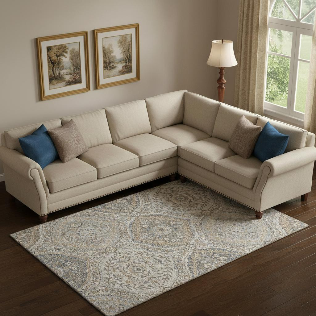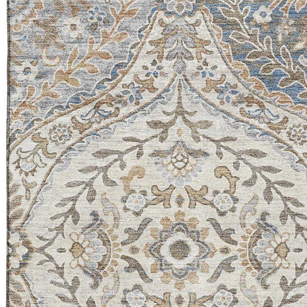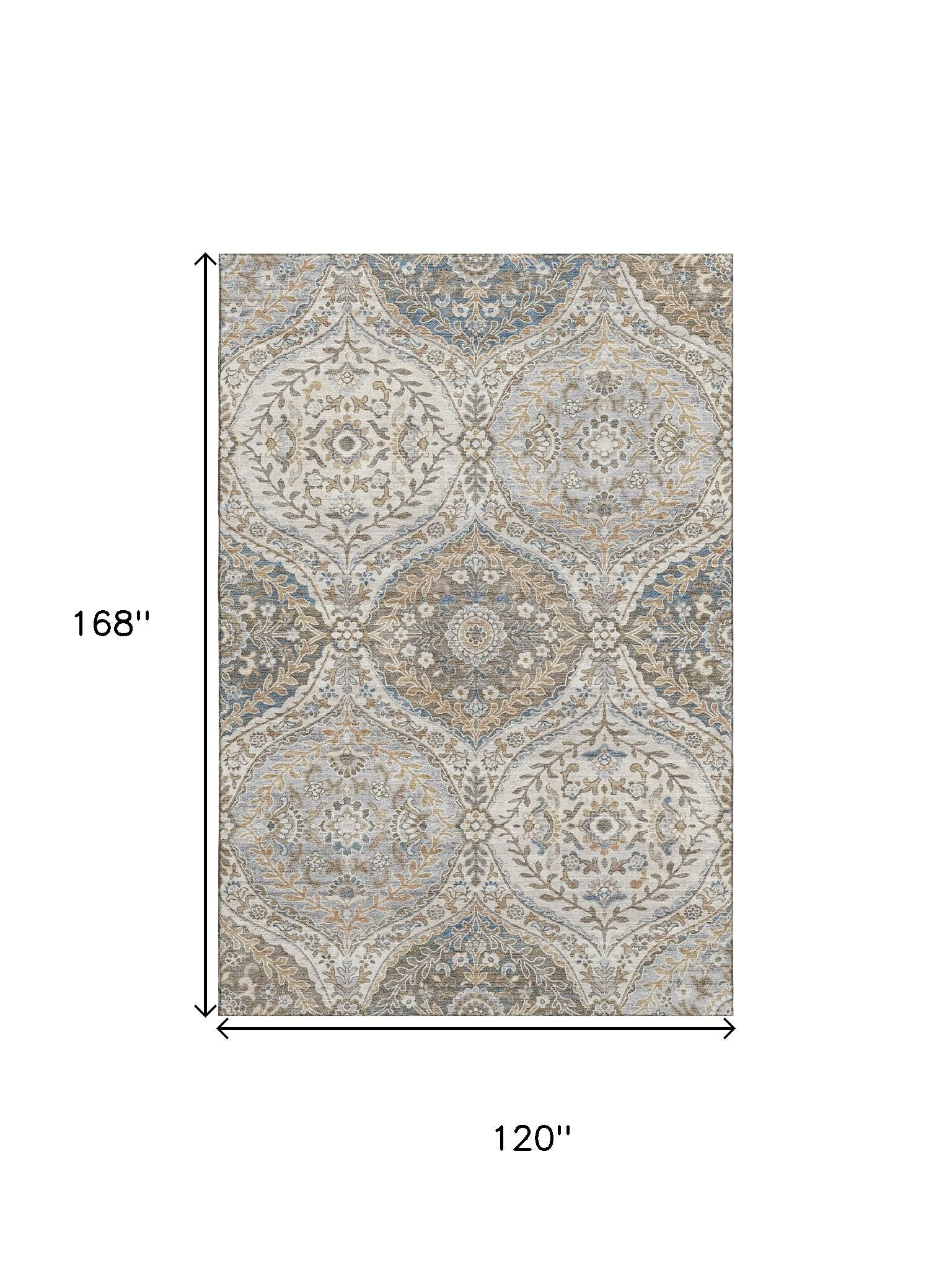 This 10-foot x 14-foot beige ivory and blue floral washable area rug with uv protection, is a great way to add warmth to a room. Ideal for spaces with kids and pets, this rug is stain resistant to help repel dirt and spilled liquids. Built to last, this rug crafted from polyester fibers is known for its durability and long lasting appeal. Rugs are a great way to showcase your style, hide imperfections, warm your home and reduce noise. This larger sized, traditional styled rug is ready to create a focal point or statement piece in your room. 120.00-inch h x 168.00-inch w x 0.39-inch d.