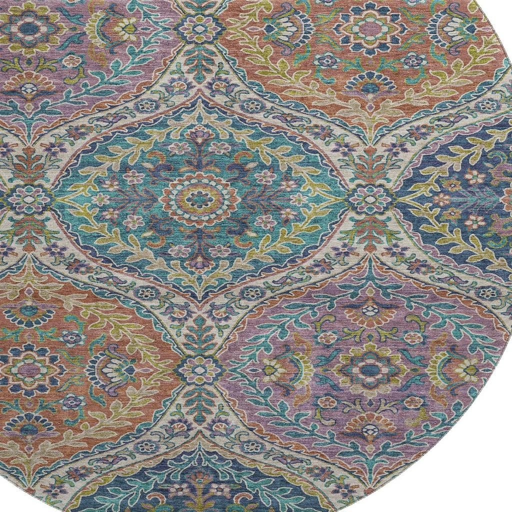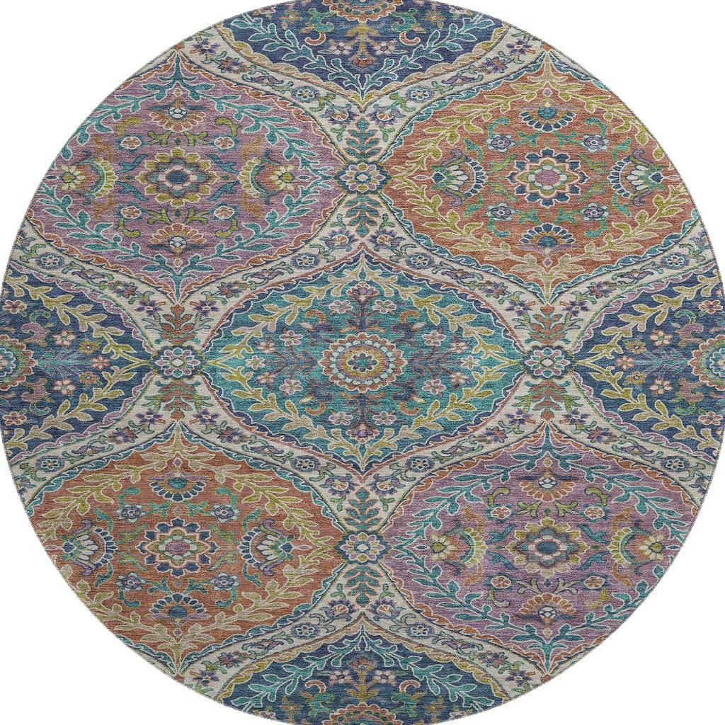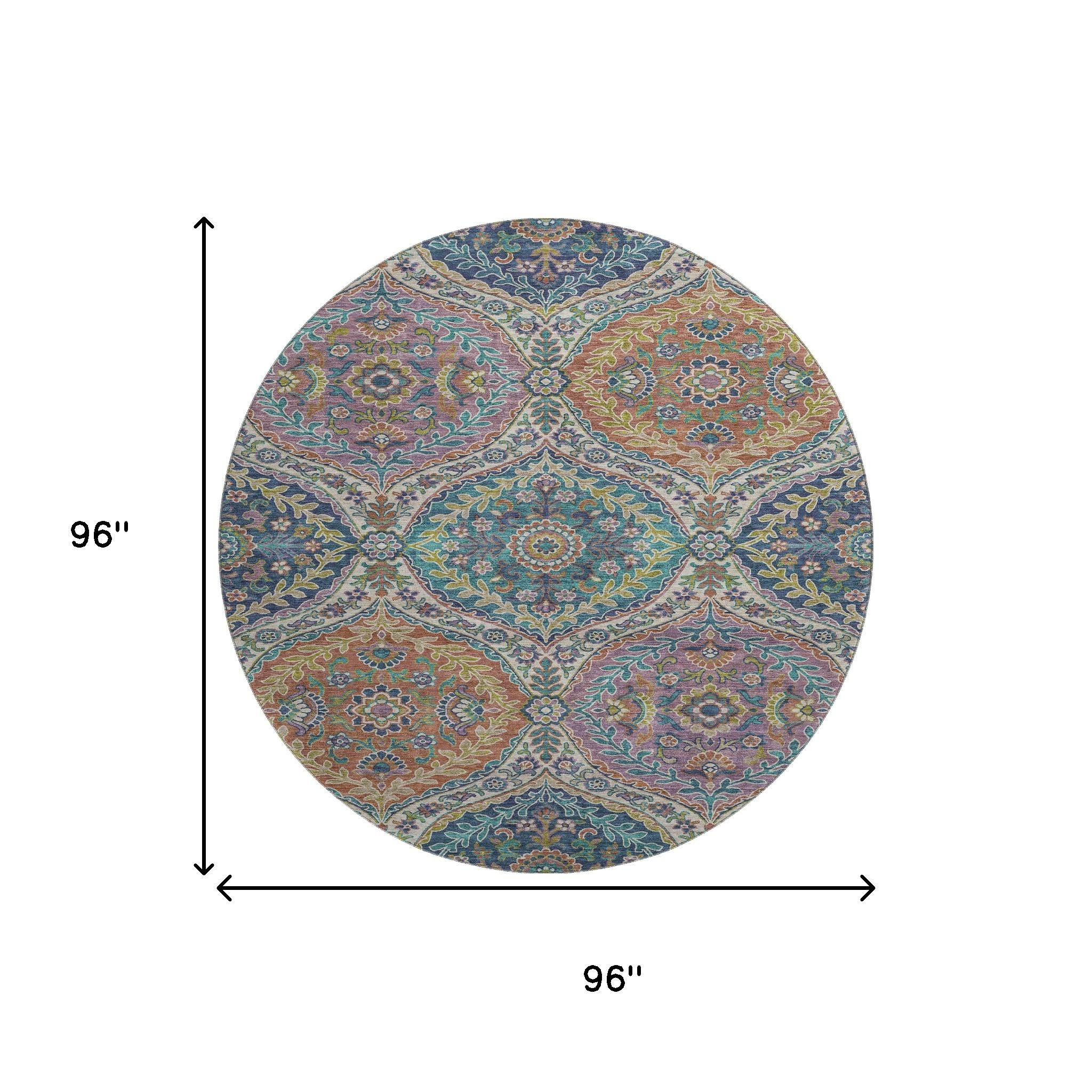 Add great coloration and comfortable texture to your space with this 8-foot blue copper and fern green floral washable round rug with uv protection. Ideal for spaces with kids and pets, this rug is stain resistant to help repel dirt and spilled liquids. Built to last, this rug crafted from polyester fibers is known for its durability and long lasting appeal. Rugs are a great way to showcase your style, hide imperfections, warm your home and reduce noise. This larger sized, traditional styled rug is ready to create a focal point or statement piece in your room. 96.00-inch h x 96.00-inch w x 0.39-inch d.