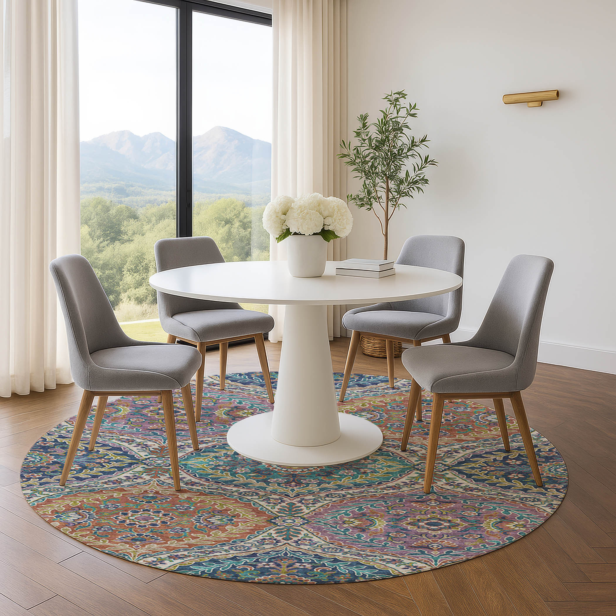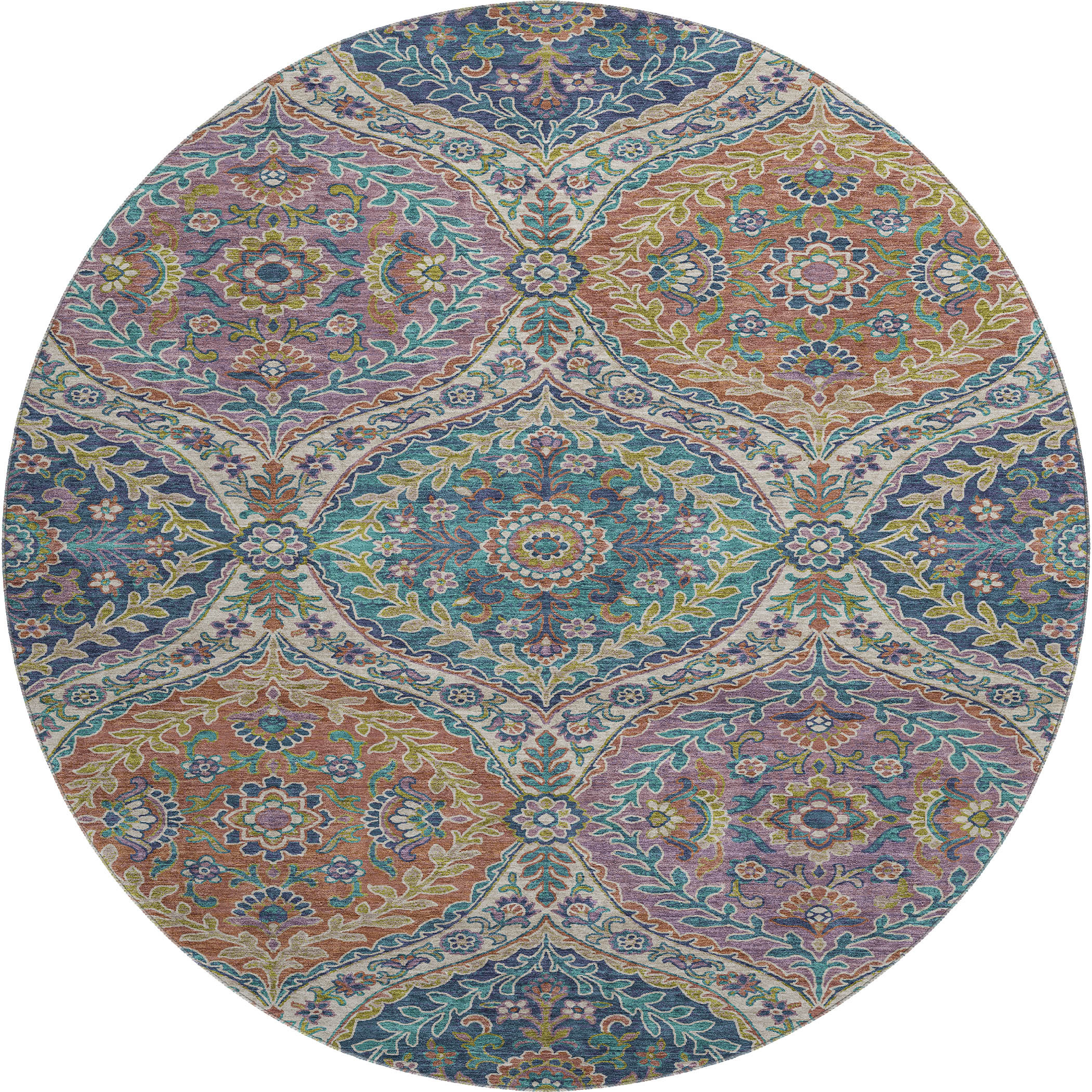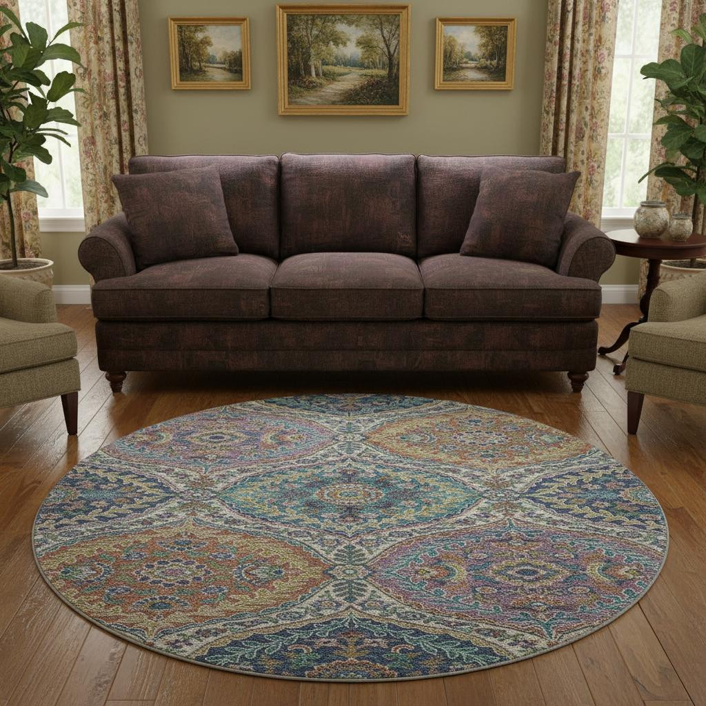 Add great coloration and comfortable texture to your space with this 8-foot blue copper and fern green floral washable round rug with uv protection. Ideal for spaces with kids and pets, this rug is stain resistant to help repel dirt and spilled liquids. Built to last, this rug crafted from polyester fibers is known for its durability and long lasting appeal. Rugs are a great way to showcase your style, hide imperfections, warm your home and reduce noise. This larger sized, traditional styled rug is ready to create a focal point or statement piece in your room. 96.00-inch h x 96.00-inch w x 0.39-inch d.