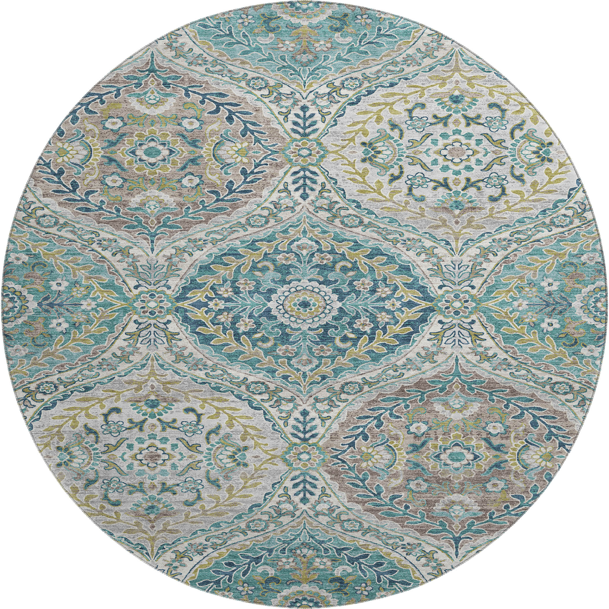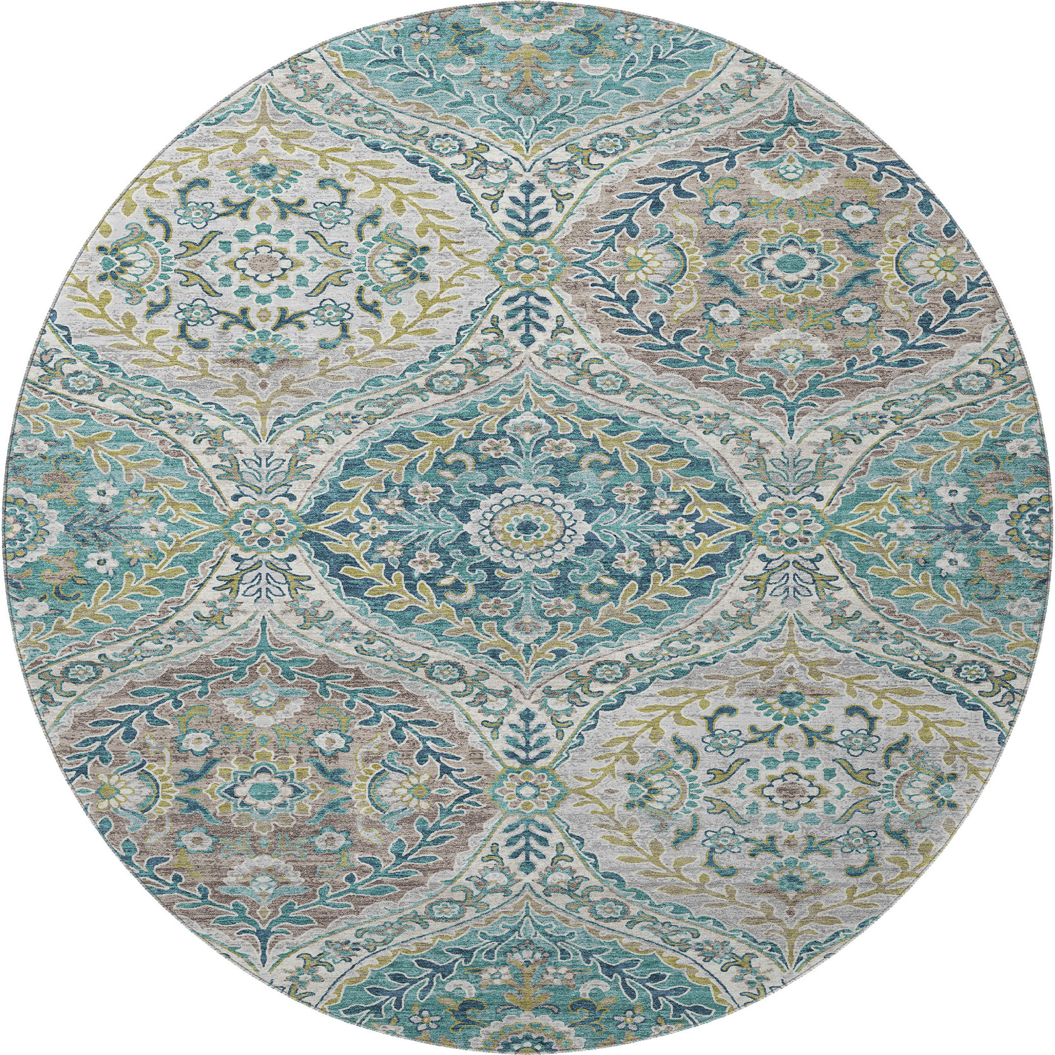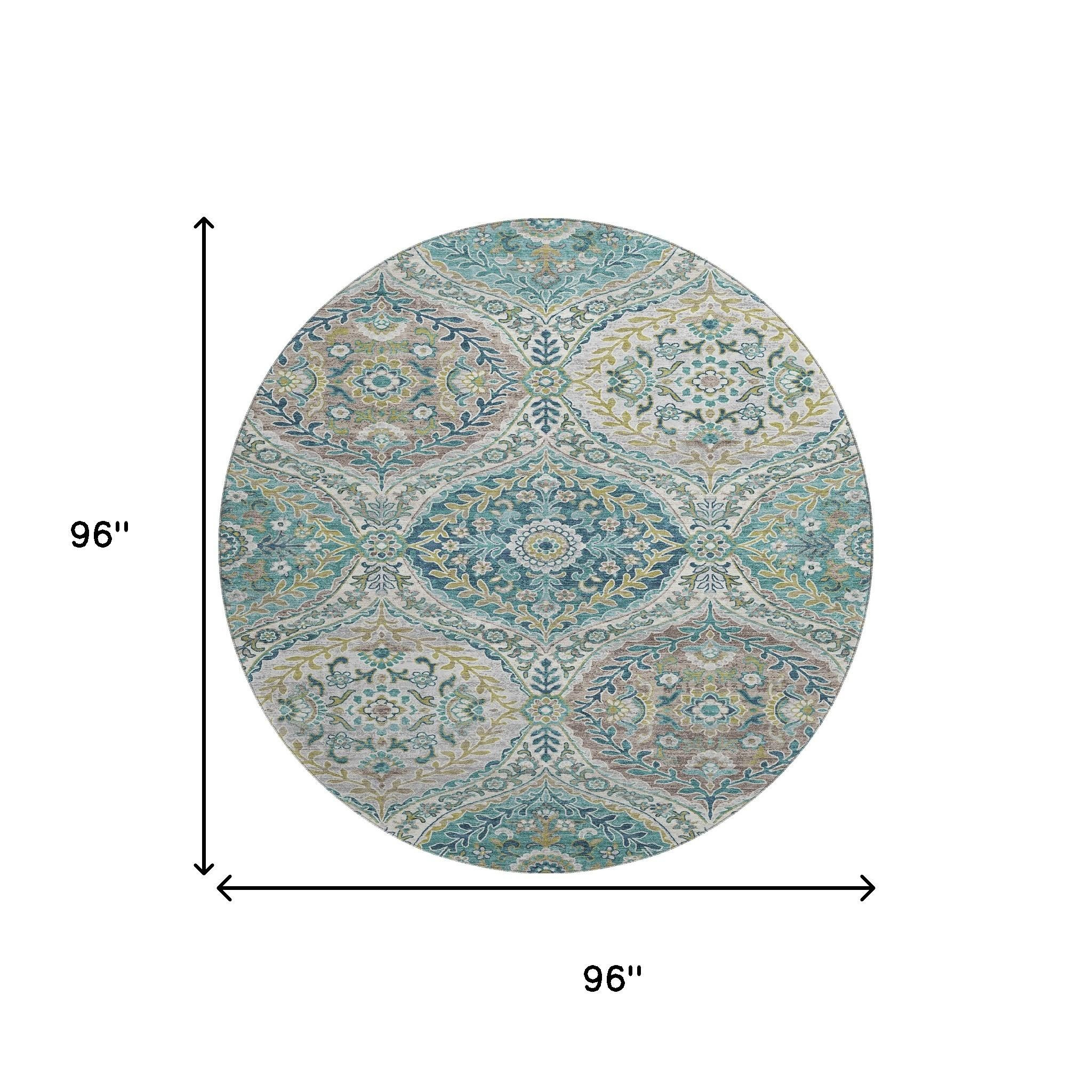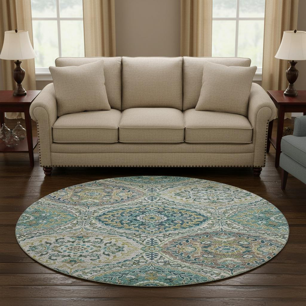 Add great coloration and comfortable texture to your space with this 8-foot teal ivory and beige floral washable round rug with uv protection. Ideal for spaces with kids and pets, this rug is stain resistant to help repel dirt and spilled liquids. Built to last, this rug crafted from polyester fibers is known for its durability and long lasting appeal. Rugs are a great way to showcase your style, hide imperfections, warm your home and reduce noise. This larger sized, traditional styled rug is ready to create a focal point or statement piece in your room. 96.00-inch h x 96.00-inch w x 0.39-inch d.