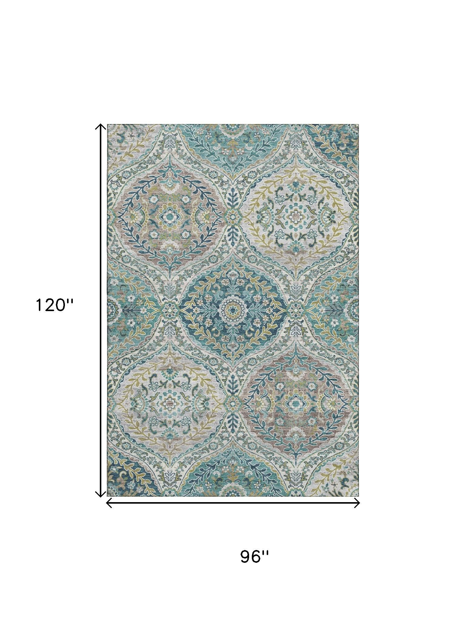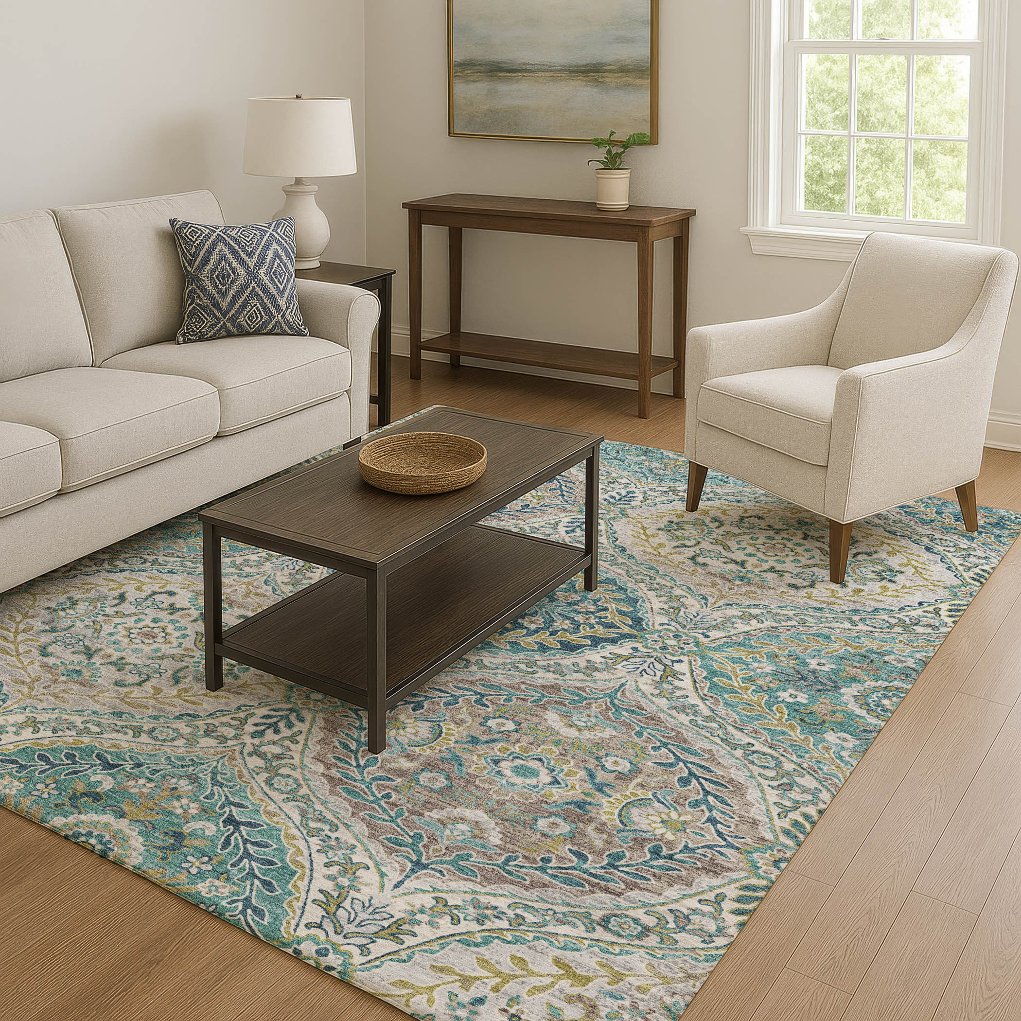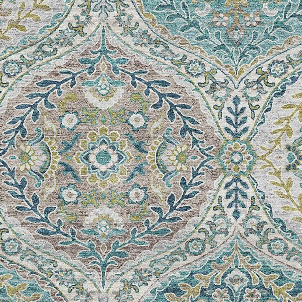Add some artistry to your room with this 8-foot x 10-foot teal ivory and beige floral washable area rug with uv protection. Ideal for spaces with kids and pets, this rug is stain resistant to help repel dirt and spilled liquids. Built to last, this rug crafted from polyester fibers is known for its durability and long lasting appeal. Rugs are a great way to showcase your style, hide imperfections, warm your home and reduce noise. This larger sized, traditional styled rug is ready to create a focal point or statement piece in your room. 96.00-inch h x 120.00-inch w x 0.39-inch d.