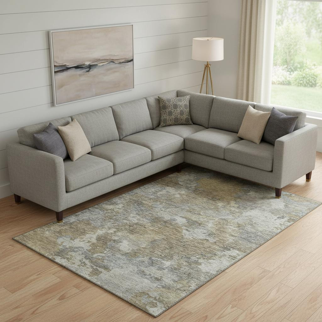 Set an inviting tone in your space with this 10-foot x 14-foot gold and gray abstract washable area rug with uv protection. Ideal for spaces with kids and pets, this rug is stain resistant to help repel dirt and spilled liquids. Built to last, this rug crafted from polyester fibers is known for its durability and long lasting appeal. Rugs are a great way to showcase your style, hide imperfections, warm your home and reduce noise. This larger sized, transitional styled rug is ready to create a focal point or statement piece in your room. 120.00-inch h x 168.00-inch w x 0.39-inch d.