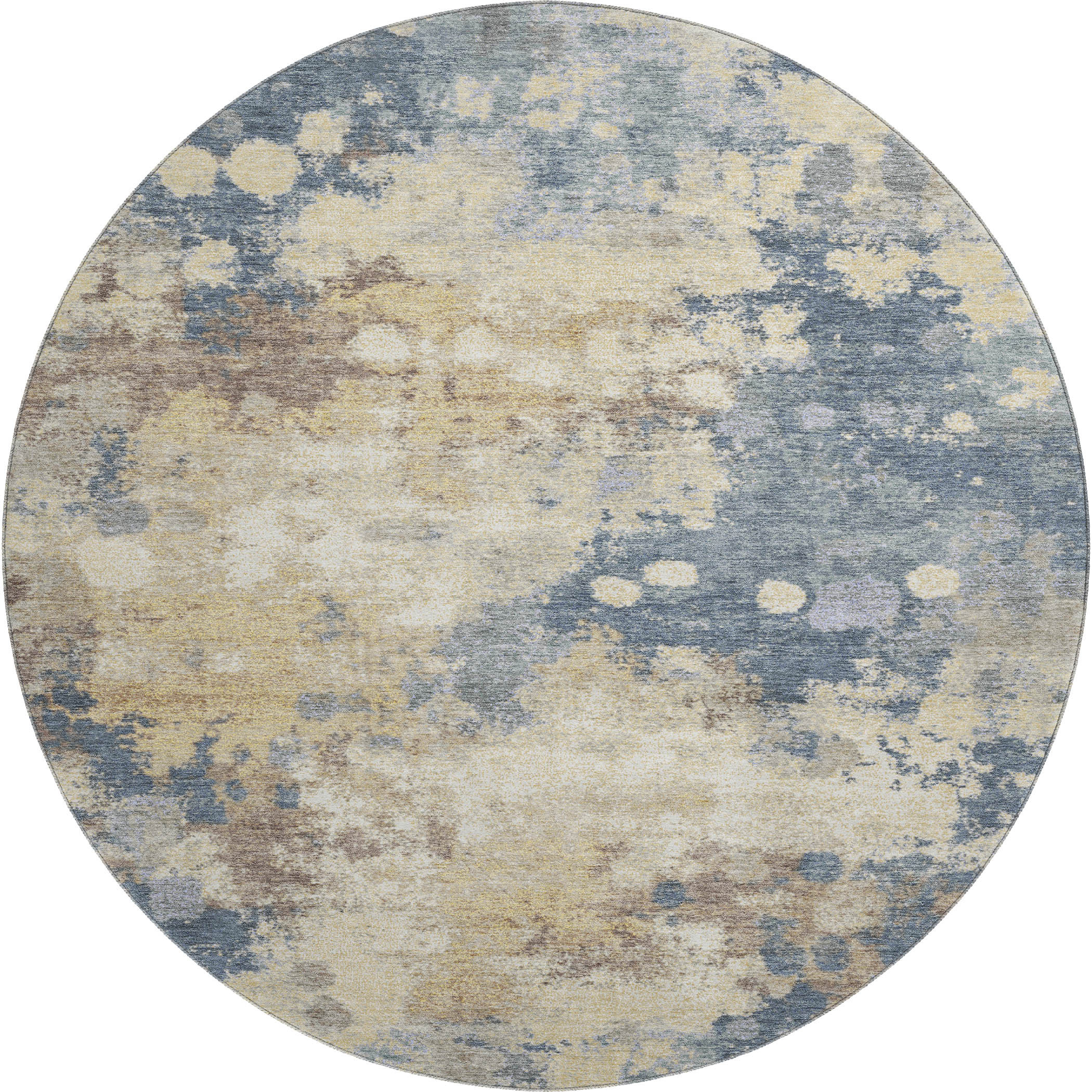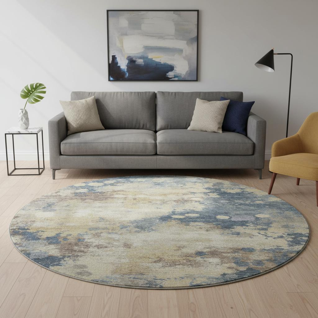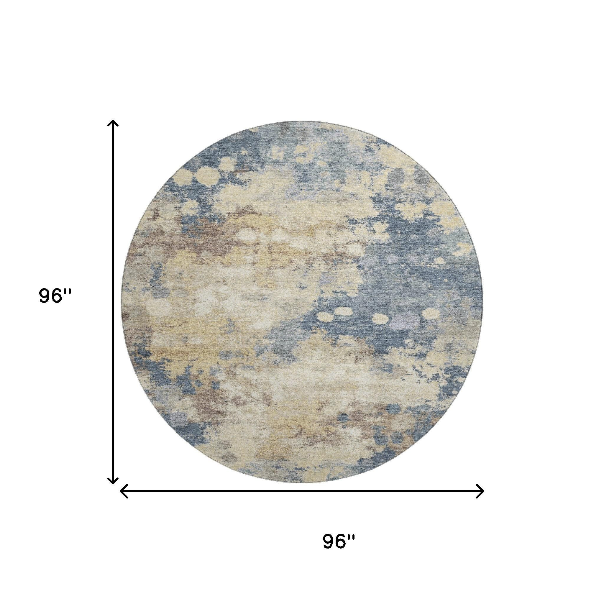 Add great coloration and comfortable texture to your space with this 8-foot gold and blue abstract washable round rug with uv protection. Ideal for spaces with kids and pets, this rug is stain resistant to help repel dirt and spilled liquids. Built to last, this rug crafted from polyester fibers is known for its durability and long lasting appeal. Rugs are a great way to showcase your style, hide imperfections, warm your home and reduce noise. This larger sized, transitional styled rug is ready to create a focal point or statement piece in your room. 96.00-inch h x 96.00-inch w x 0.39-inch d.