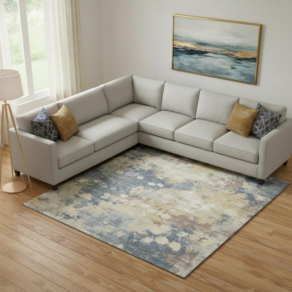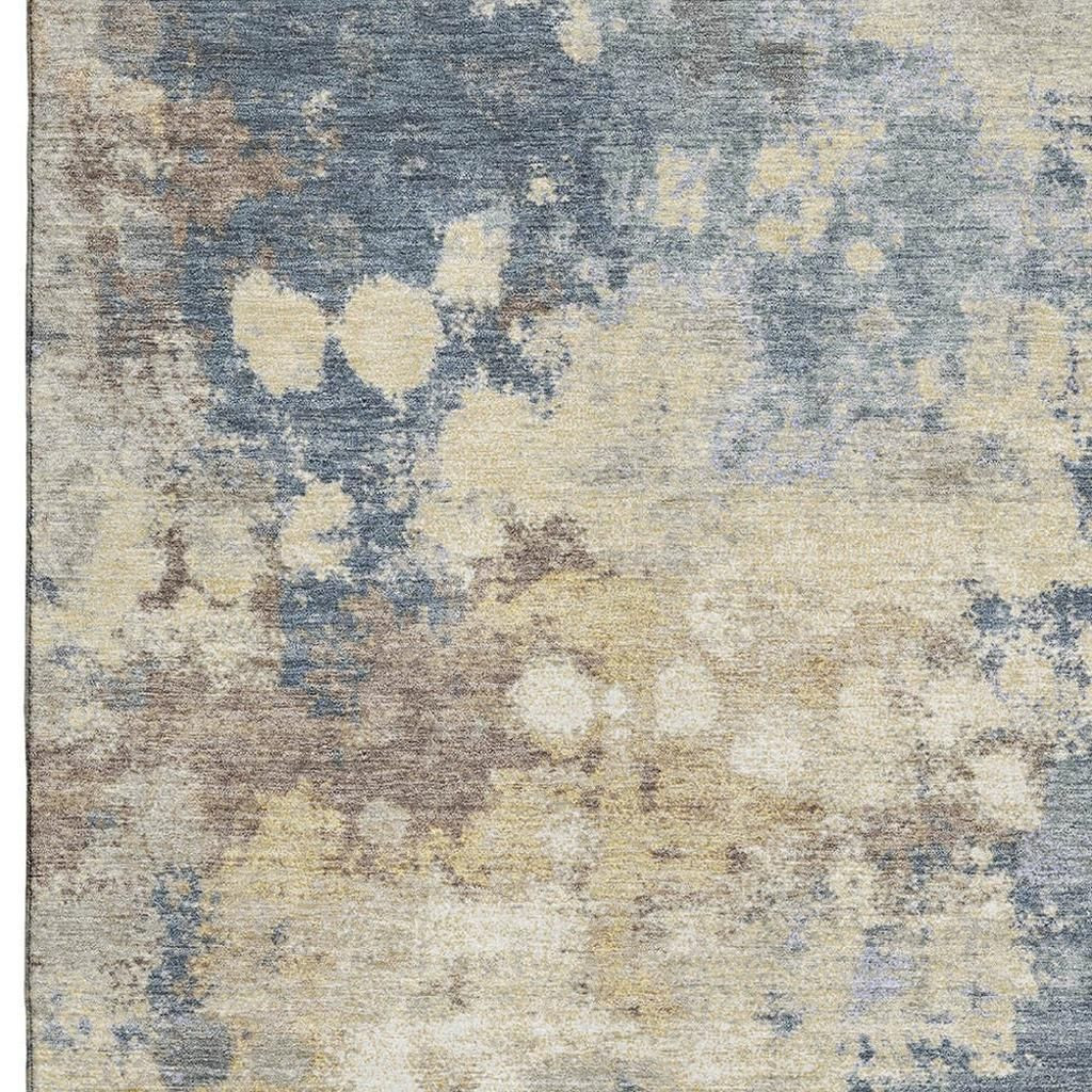 Add some artistry to your room with this 10-foot x 14-foot gold and blue abstract washable area rug with uv protection. Ideal for spaces with kids and pets, this rug is stain resistant to help repel dirt and spilled liquids. Built to last, this rug crafted from polyester fibers is known for its durability and long lasting appeal. Rugs are a great way to showcase your style, hide imperfections, warm your home and reduce noise. This larger sized, transitional styled rug is ready to create a focal point or statement piece in your room. 120.00-inch h x 168.00-inch w x 0.39-inch d.