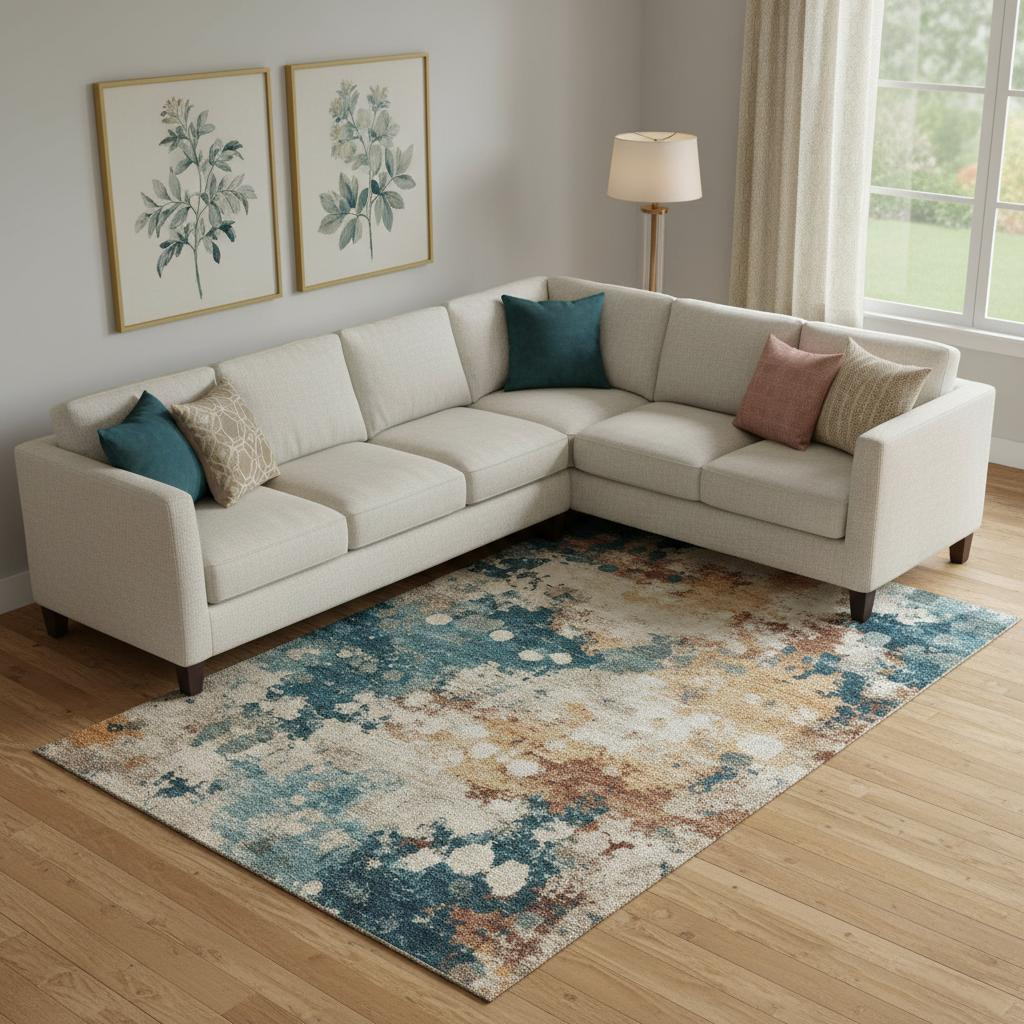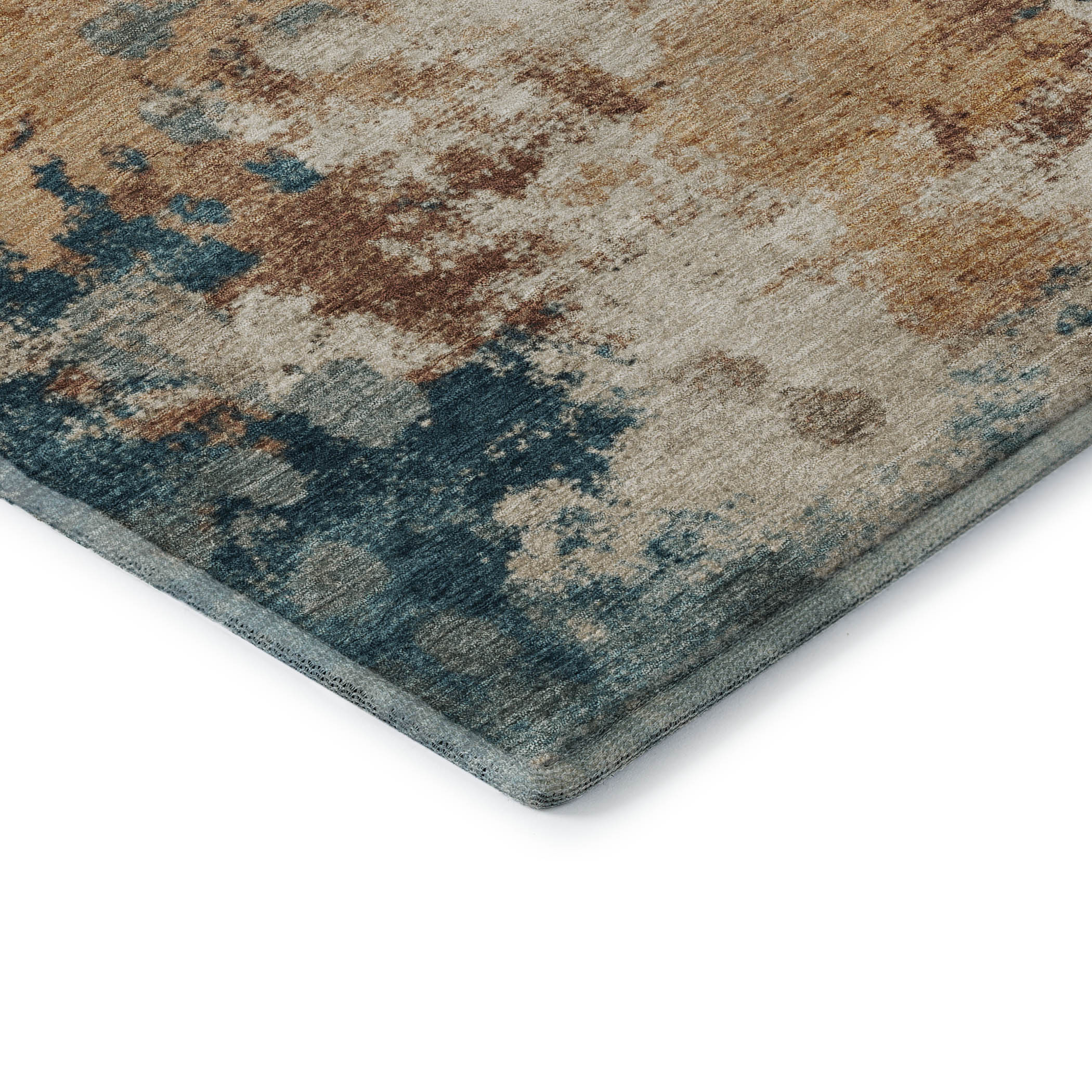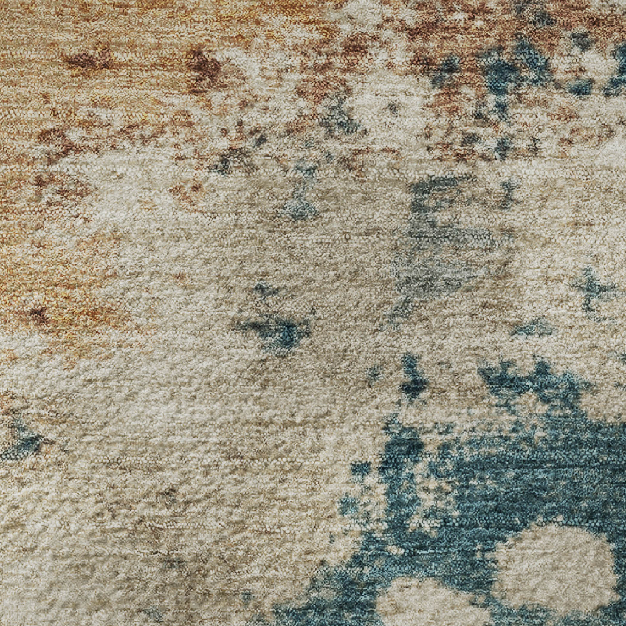 This 9-foot x 12-foot beige copper and blue abstract washable area rug with uv protection, is a great way to add warmth to a room. Ideal for spaces with kids and pets, this rug is stain resistant to help repel dirt and spilled liquids. Built to last, this rug crafted from polyester fibers is known for its durability and long lasting appeal. Rugs are a great way to showcase your style, hide imperfections, warm your home and reduce noise. This larger sized, transitional styled rug is ready to create a focal point or statement piece in your room. 108.00-inch h x 144.00-inch w x 0.39-inch d.