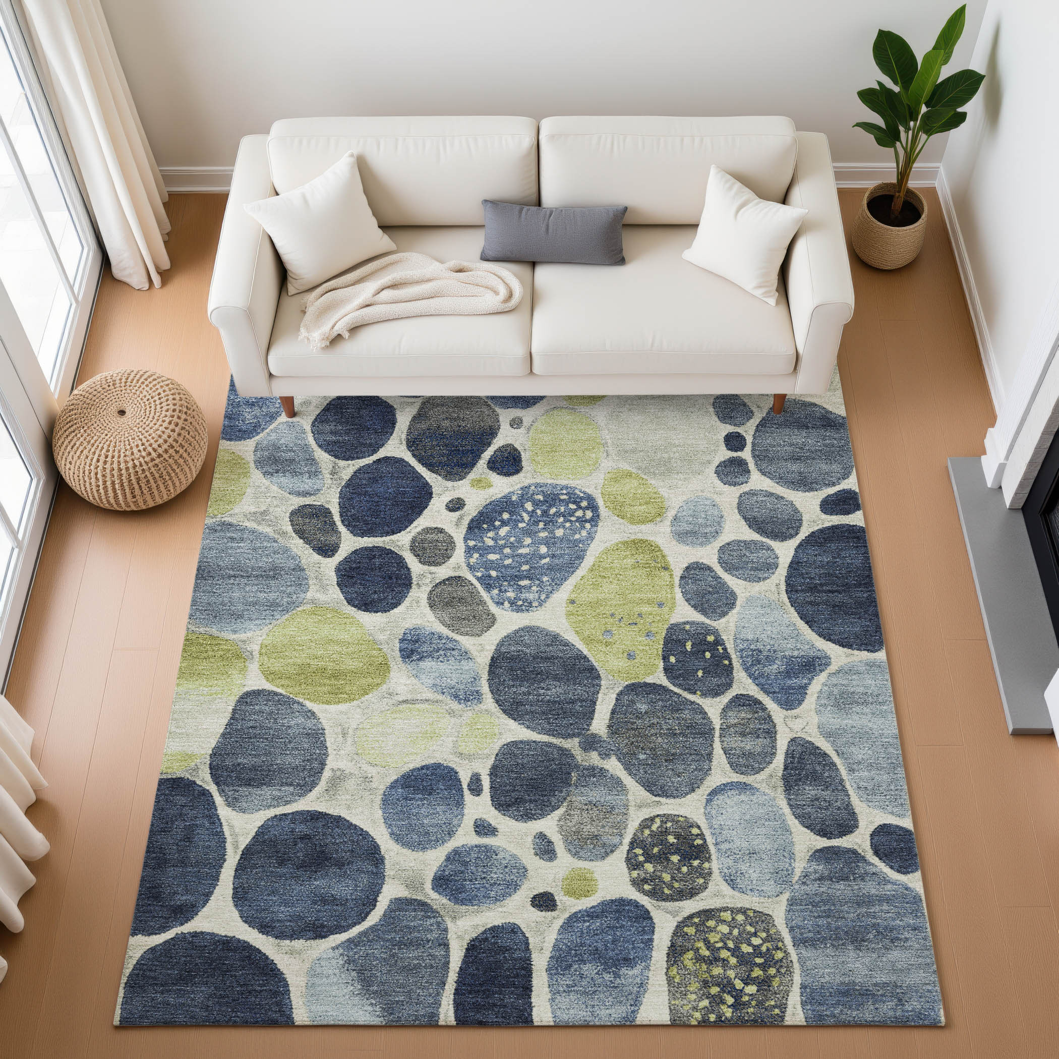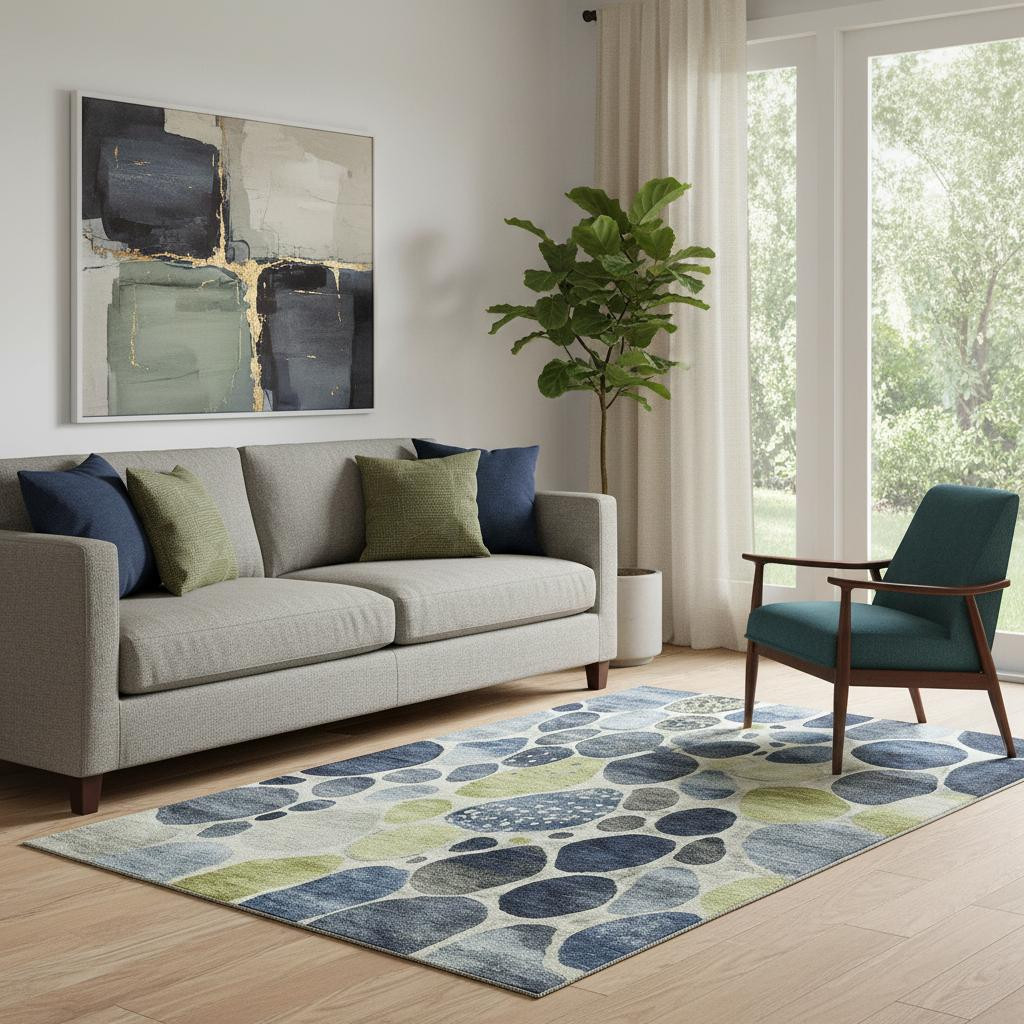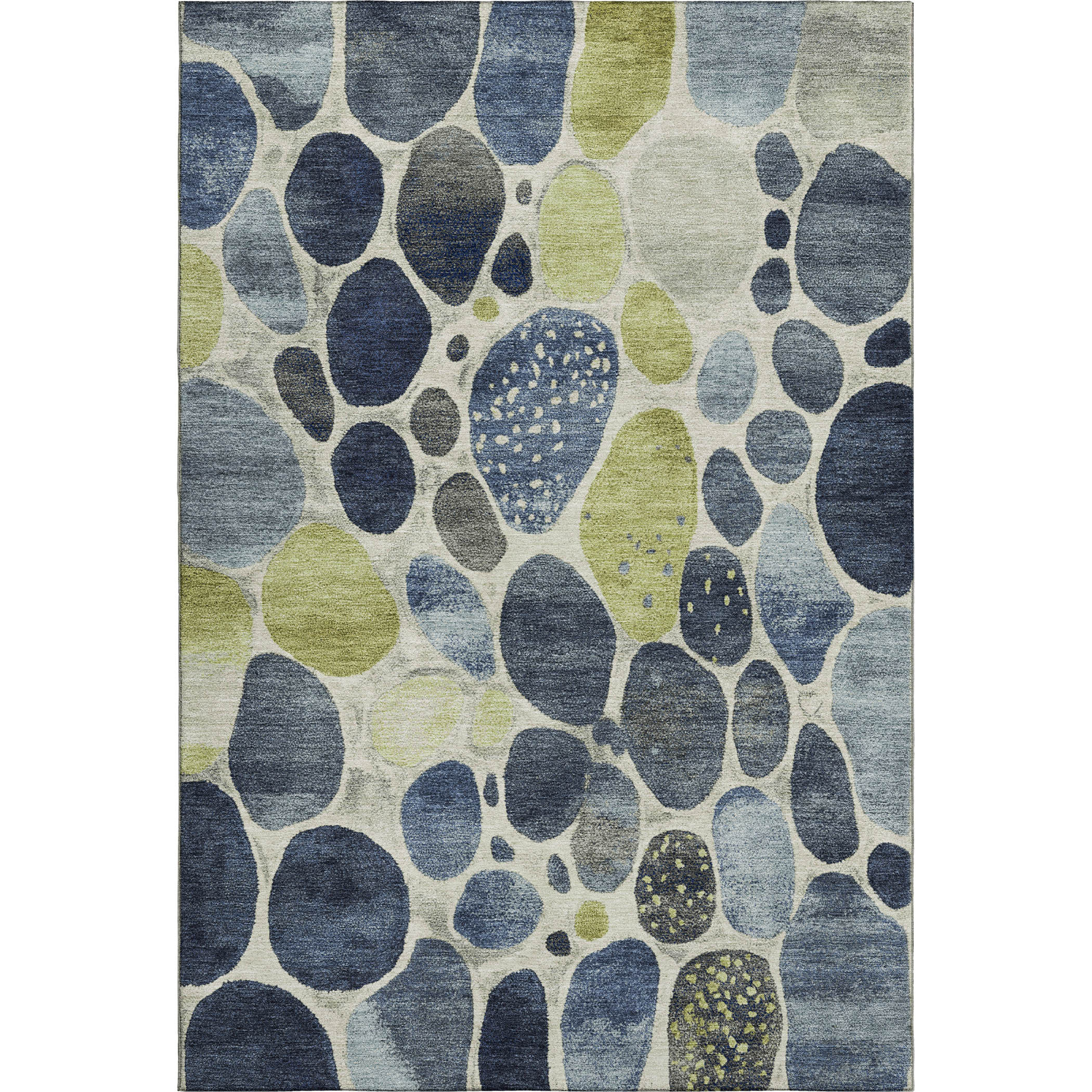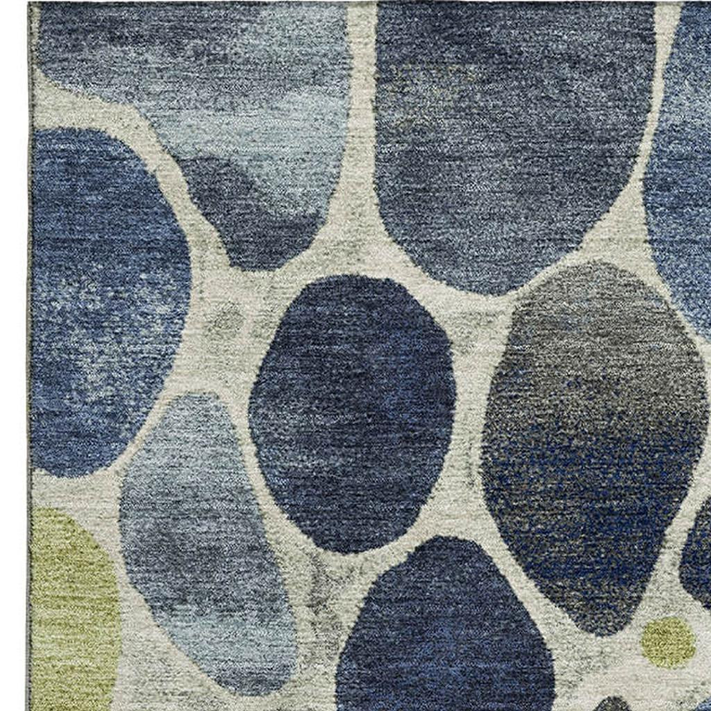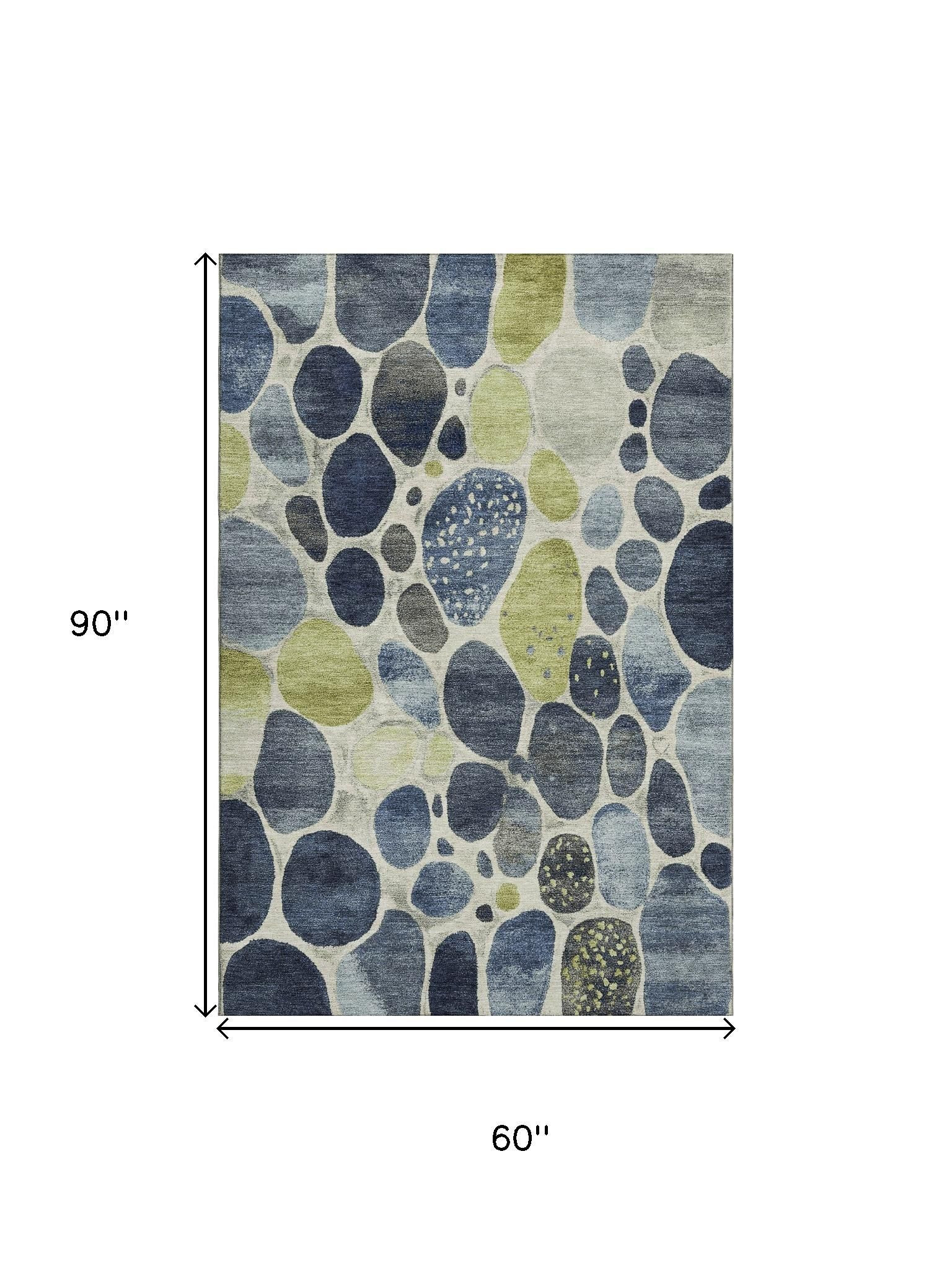 Add great coloration and comfortable texture to your space with this 5-foot x 8-foot denim blue lime green and ivory geometric washable area rug with uv protection. Ideal for spaces with kids and pets, this rug is stain resistant to help repel dirt and spilled liquids. Built to last, this rug crafted from polyester fibers is known for its durability and long lasting appeal. Rugs are a great way to showcase your style, hide imperfections, warm your home and reduce noise. This larger sized, transitional styled rug is ready to create a focal point or statement piece in your room. 60.00-inch h x 90.00-inch w x 0.39-inch d.