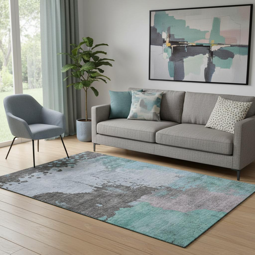 Add great coloration and comfortable texture to your space with this 5-foot x 8-foot teal and taupe abstract washable area rug with uv protection. Ideal for spaces with kids and pets, this rug is stain resistant to help repel dirt and spilled liquids. Built to last, this rug crafted from polyester fibers is known for its durability and long lasting appeal. Rugs are a great way to showcase your style, hide imperfections, warm your home and reduce noise. This larger sized, transitional styled rug is ready to create a focal point or statement piece in your room. 60.00-inch h x 90.00-inch w x 0.39-inch d.