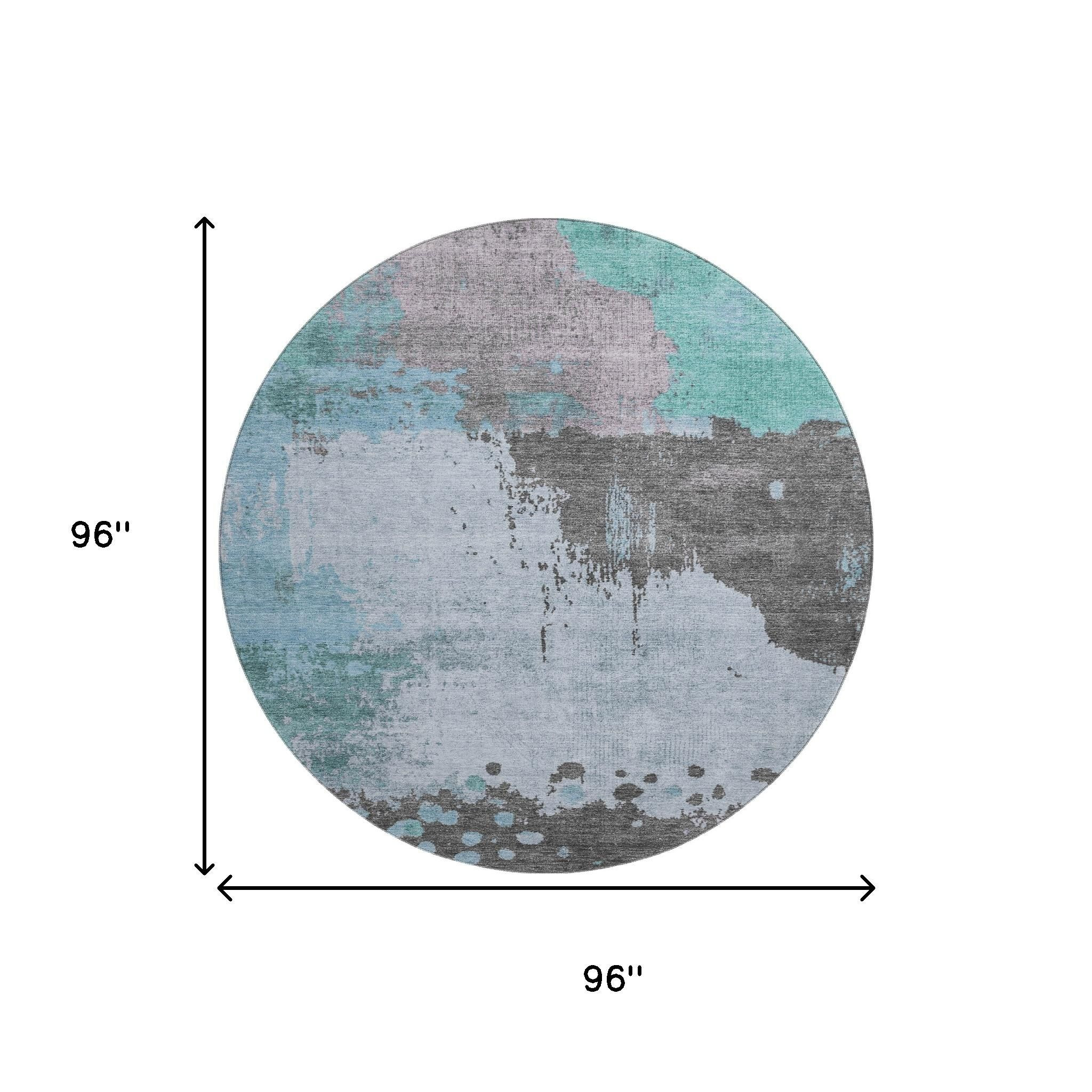 Add some artistry to your room with this 8-foot teal and taupe abstract washable round rug with uv protection. Ideal for spaces with kids and pets, this rug is stain resistant to help repel dirt and spilled liquids. Built to last, this rug crafted from polyester fibers is known for its durability and long lasting appeal. Rugs are a great way to showcase your style, hide imperfections, warm your home and reduce noise. This larger sized, transitional styled rug is ready to create a focal point or statement piece in your room. 96.00-inch h x 96.00-inch w x 0.39-inch d.