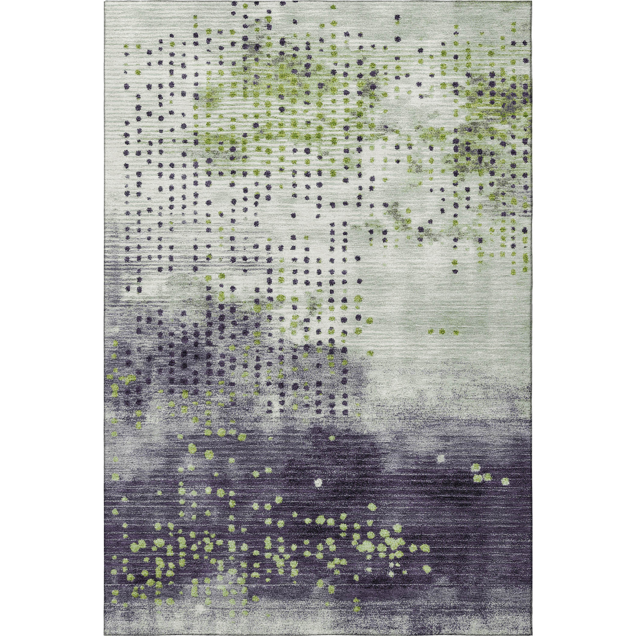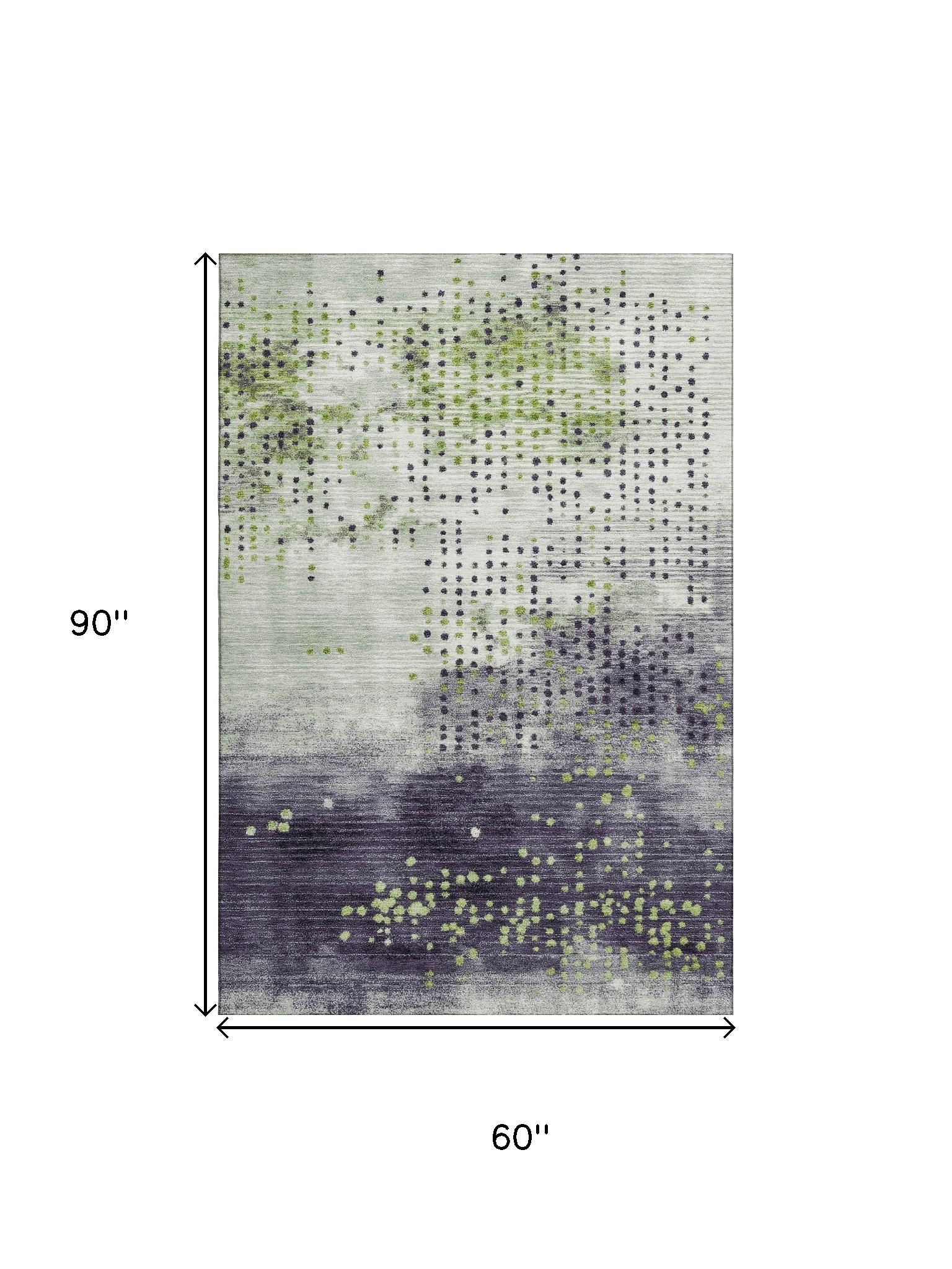 Add some artistry to your room with this 5-foot x 8-foot artichoke green and eggplant geometric washable area rug with uv protection. Ideal for spaces with kids and pets, this rug is stain resistant to help repel dirt and spilled liquids. Built to last, this rug crafted from polyester fibers is known for its durability and long lasting appeal. Rugs are a great way to showcase your style, hide imperfections, warm your home and reduce noise. This larger sized, transitional styled rug is ready to create a focal point or statement piece in your room. 60.00-inch h x 90.00-inch w x 0.39-inch d.