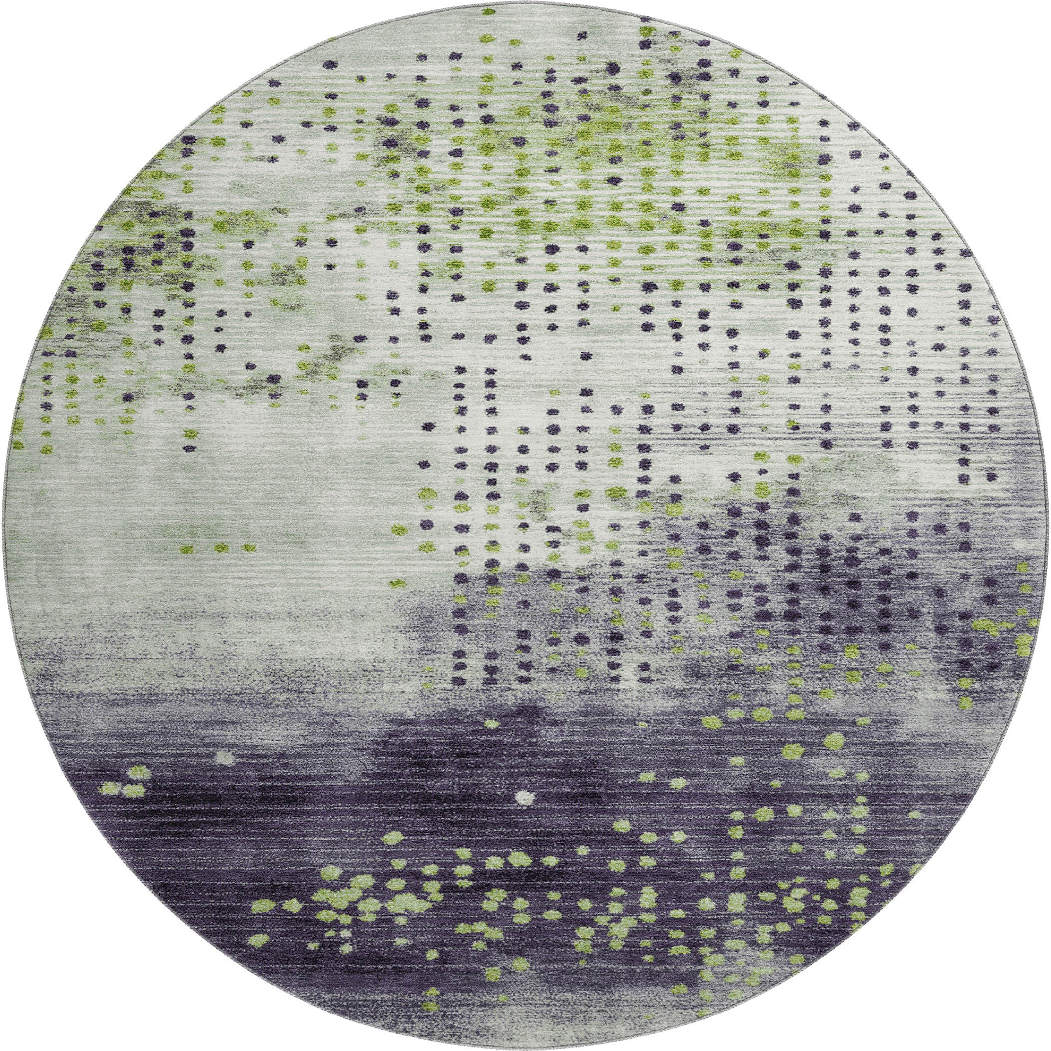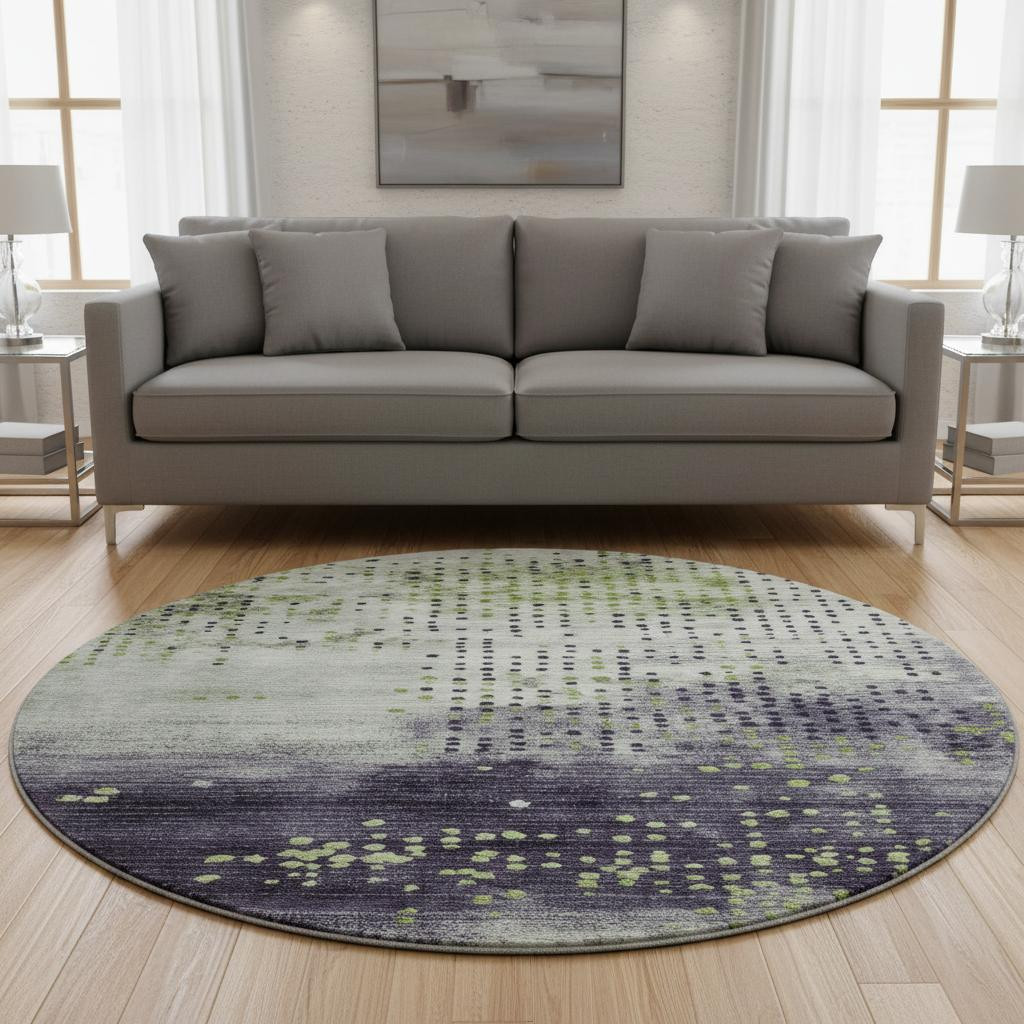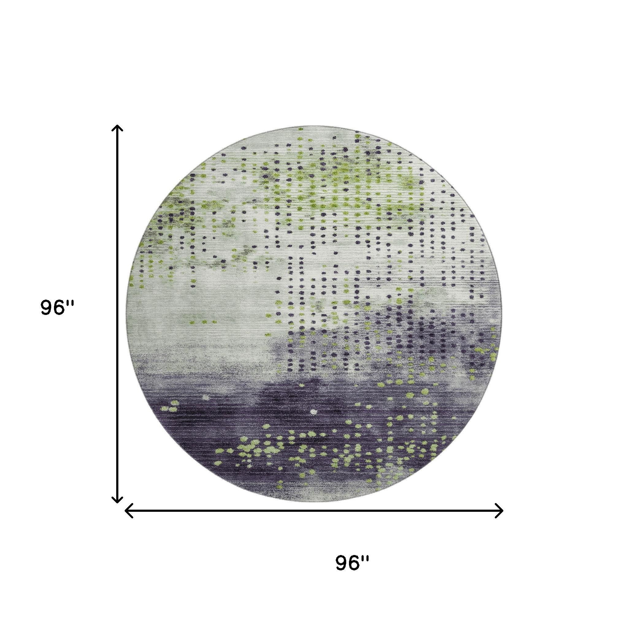 Add great coloration and comfortable texture to your space with this 8-foot artichoke green and eggplant geometric washable round rug with uv protection. Ideal for spaces with kids and pets, this rug is stain resistant to help repel dirt and spilled liquids. Built to last, this rug crafted from polyester fibers is known for its durability and long lasting appeal. Rugs are a great way to showcase your style, hide imperfections, warm your home and reduce noise. This larger sized, transitional styled rug is ready to create a focal point or statement piece in your room. 96.00-inch h x 96.00-inch w x 0.39-inch d.