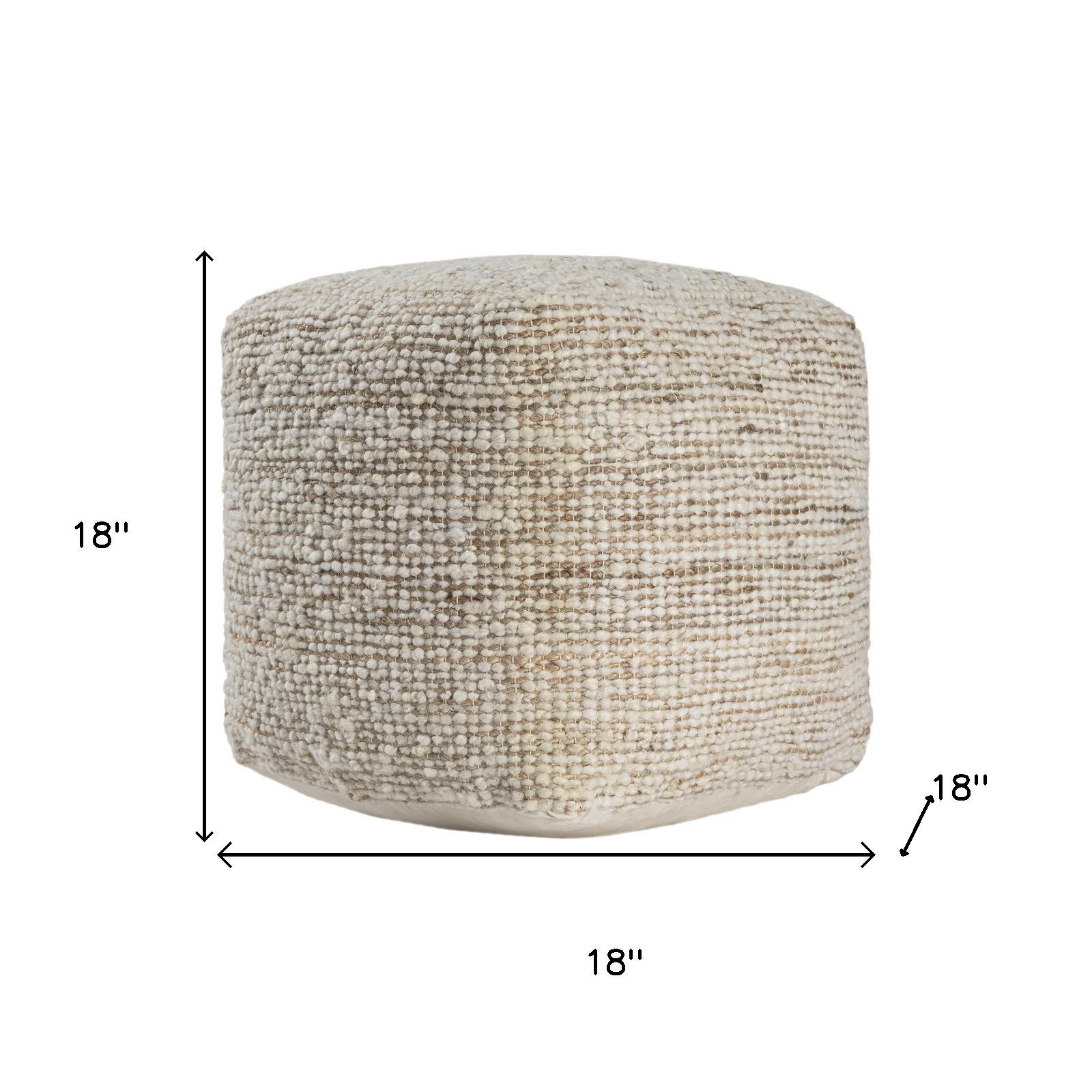 Get ready to relax with this 18-inch ivory cotton wool and jute striped pouf ottoman. Add chic style to your space with this fun pouf that not only looks cool but can be a great foot rest or extra seat when needed. The upholstery top of this ottoman is a nice contrast to the upholstery material. Expertly upholstered with padding and soft cotton, wool, and jute in a striped pattern, this ottoman is as comfortable as it is good looking. Ottomans are multi-functional additions to your space that add fashion and practical value. 18.00-inch h x 18.00-inch w x 18.00-inch d.
