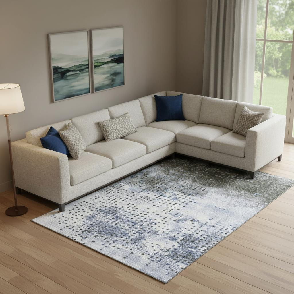 Add some artistry to your room with this 10-foot x 14-foot denim blue and chocolate geometric washable area rug with uv protection. Ideal for spaces with kids and pets, this rug is stain resistant to help repel dirt and spilled liquids. Built to last, this rug crafted from polyester fibers is known for its durability and long lasting appeal. Rugs are a great way to showcase your style, hide imperfections, warm your home and reduce noise. This larger sized, transitional styled rug is ready to create a focal point or statement piece in your room. 120.00-inch h x 168.00-inch w x 0.39-inch d.