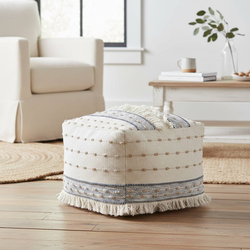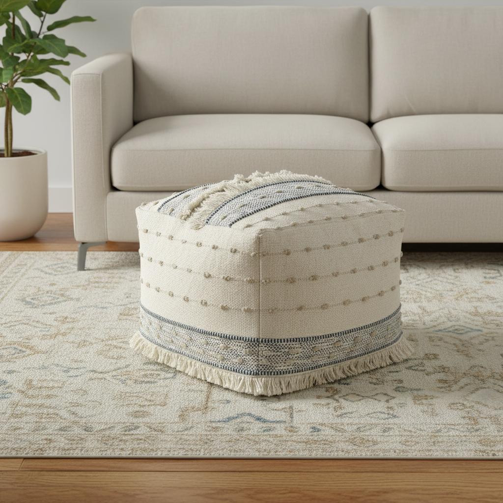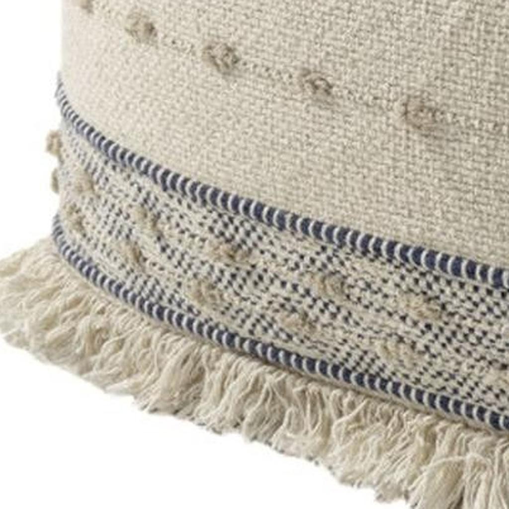 Practicality and fashion mix together with this handy 18-inch ivory cotton and wool striped pouf ottoman. Add chic style to your space with this fun pouf that not only looks cool but can be a great foot rest or extra seat when needed. Full of textural embellishments and tassels, this hand made pouf gives a cozy modern farmhouse or modern boho vibe. This ottoman is as comfortable as it is good looking and makes a multi-functional addition to your space. 14.00-inch h x 18.00-inch w x 18.00-inch d.