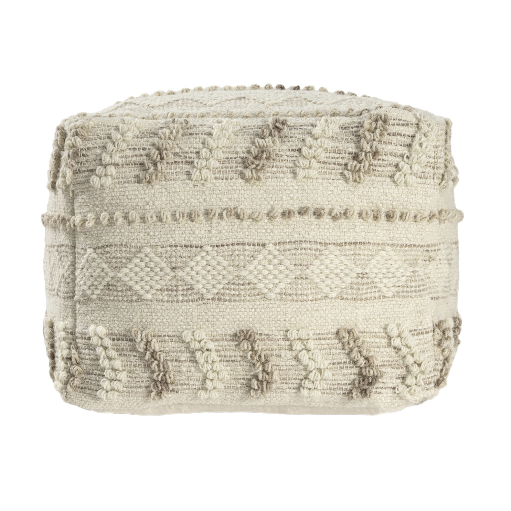 Get ready to relax with this 18-inch ivory and natural cotton and wool striped pouf ottoman. Add chic style to your space with this fun pouf that not only looks cool but can be a great foot rest or extra seat when needed. Full of neutral tones, geometric patterning, and textural embellishments, this hand made pouf gives a cozy modern modern boho vibe. This ottoman is as comfortable as it is good looking and makes a multi-functional addition to your space. 14.00-inch h x 18.00-inch w x 18.00-inch d.