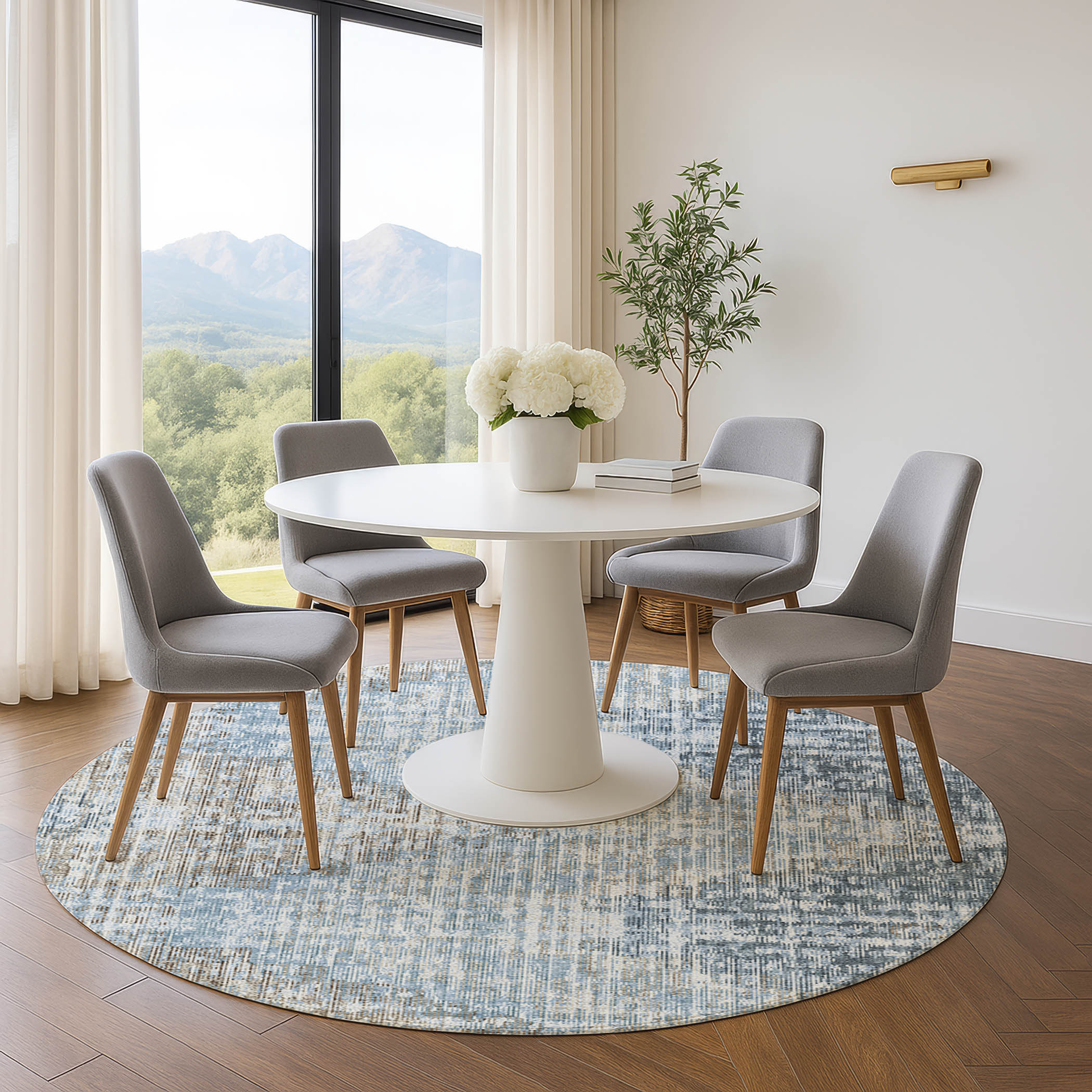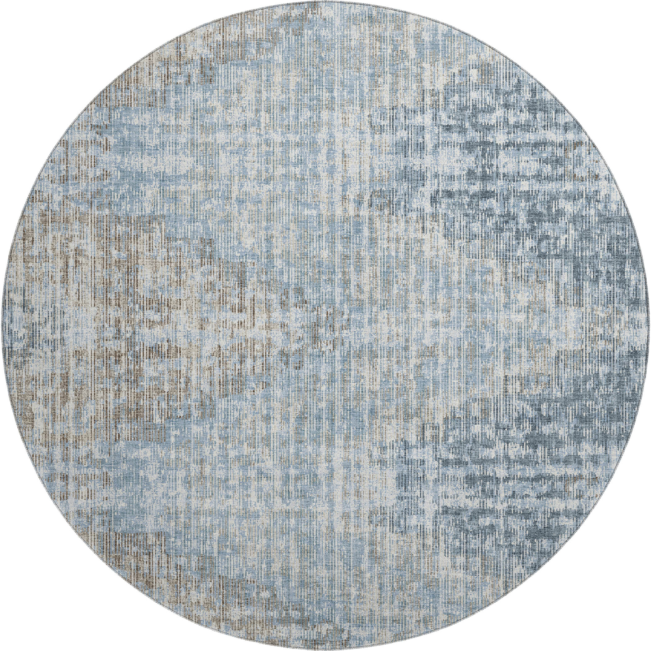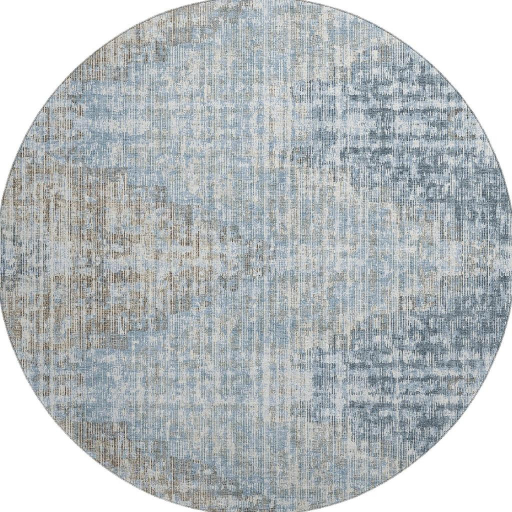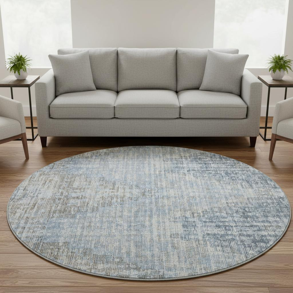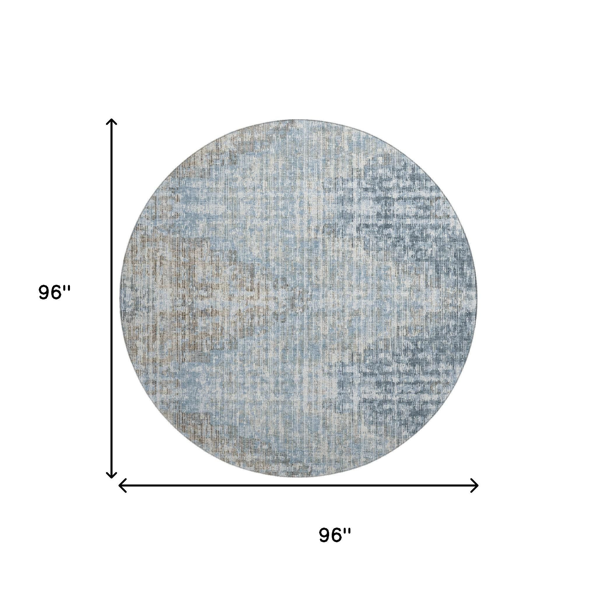 This 8-foot denim blue and ivory geometric washable round rug with uv protection, is a great way to add warmth to a room. Ideal for spaces with kids and pets, this rug is stain resistant to help repel dirt and spilled liquids. Built to last, this rug crafted from polyester fibers is known for its durability and long lasting appeal. Rugs are a great way to showcase your style, hide imperfections, warm your home and reduce noise. This larger sized, transitional styled rug is ready to create a focal point or statement piece in your room. 96.00-inch h x 96.00-inch w x 0.39-inch d.