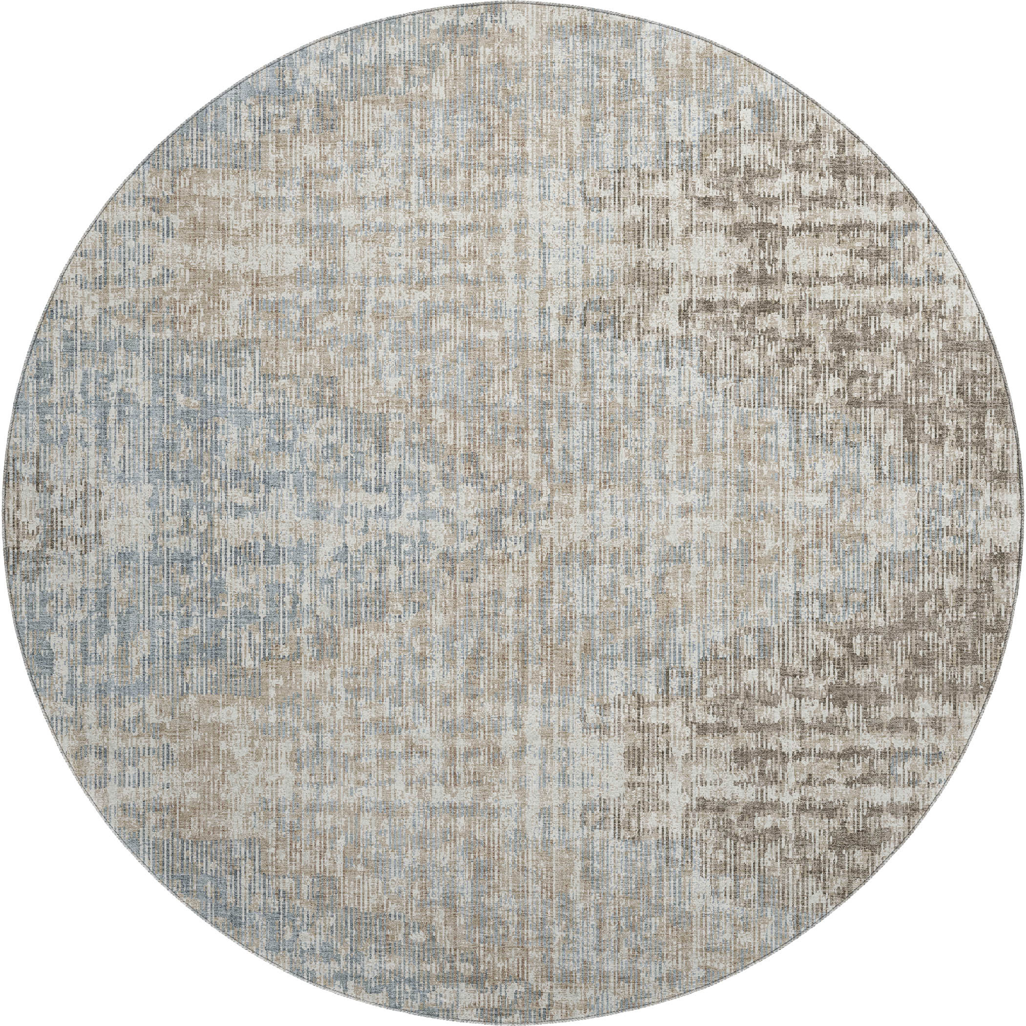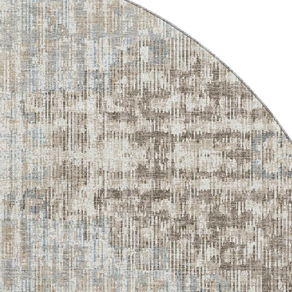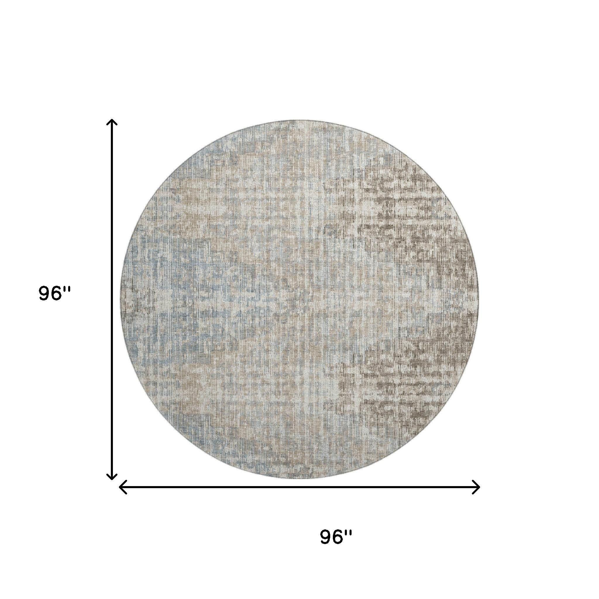 Add some artistry to your room with this 8-foot beige and gray geometric washable round rug with uv protection. Ideal for spaces with kids and pets, this rug is stain resistant to help repel dirt and spilled liquids. Built to last, this rug crafted from polyester fibers is known for its durability and long lasting appeal. Rugs are a great way to showcase your style, hide imperfections, warm your home and reduce noise. This larger sized, transitional styled rug is ready to create a focal point or statement piece in your room. 96.00-inch h x 96.00-inch w x 0.39-inch d.