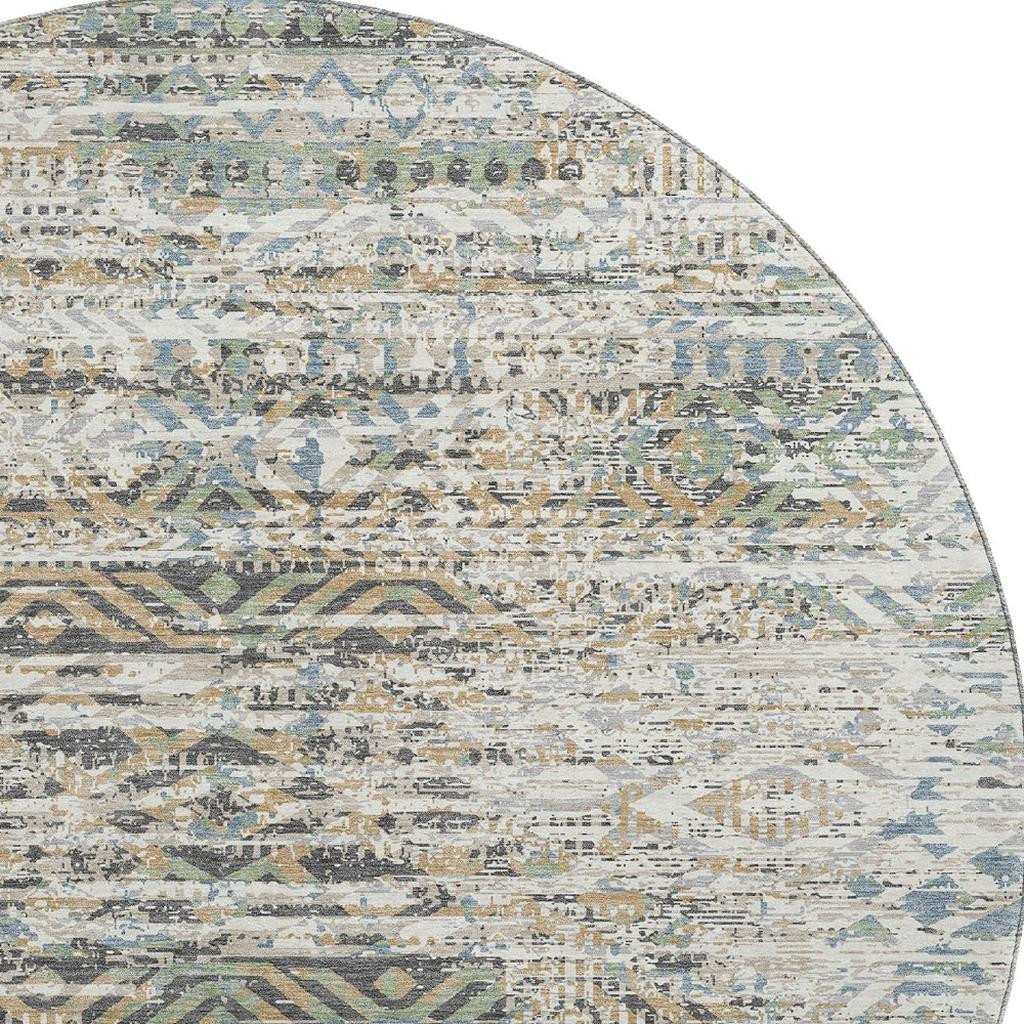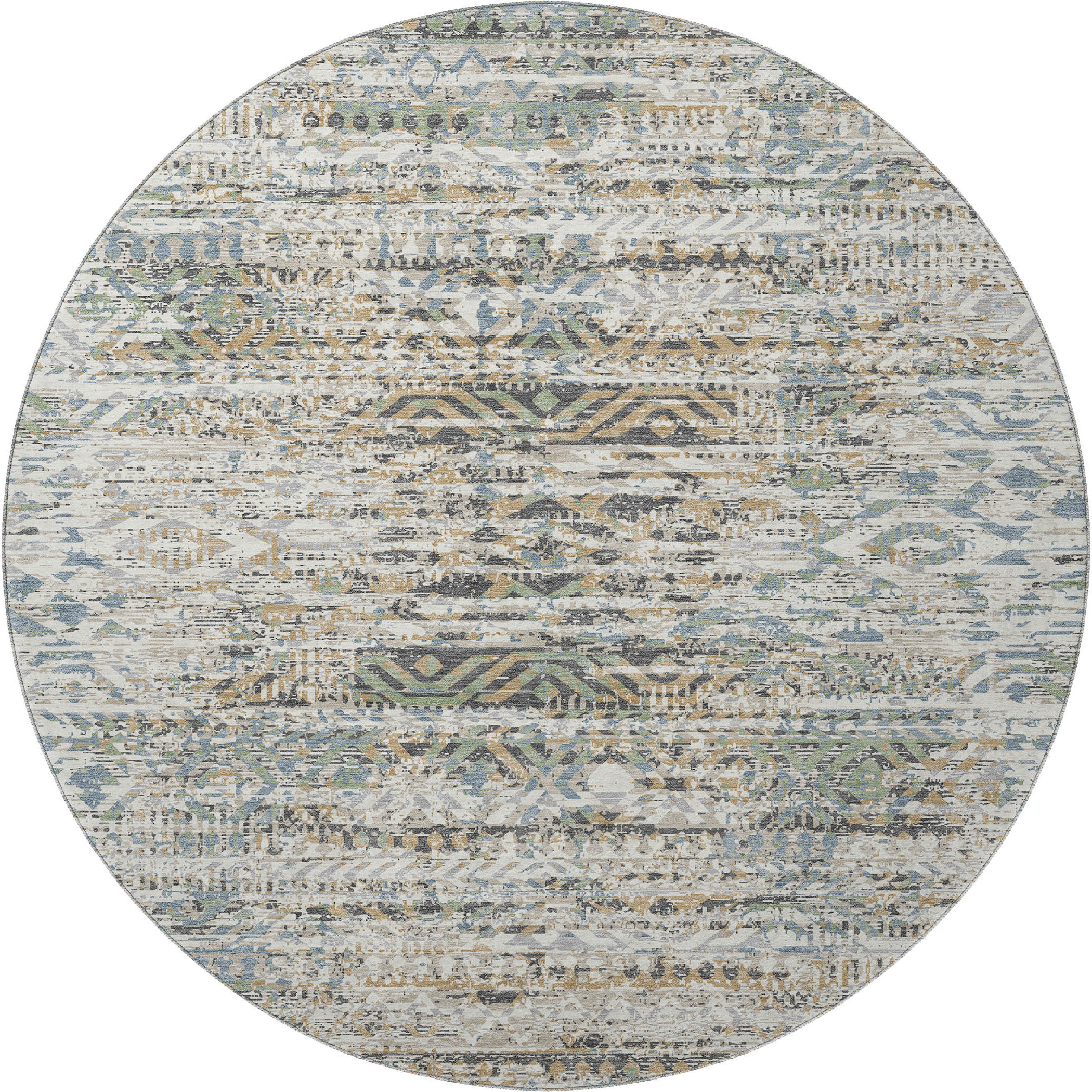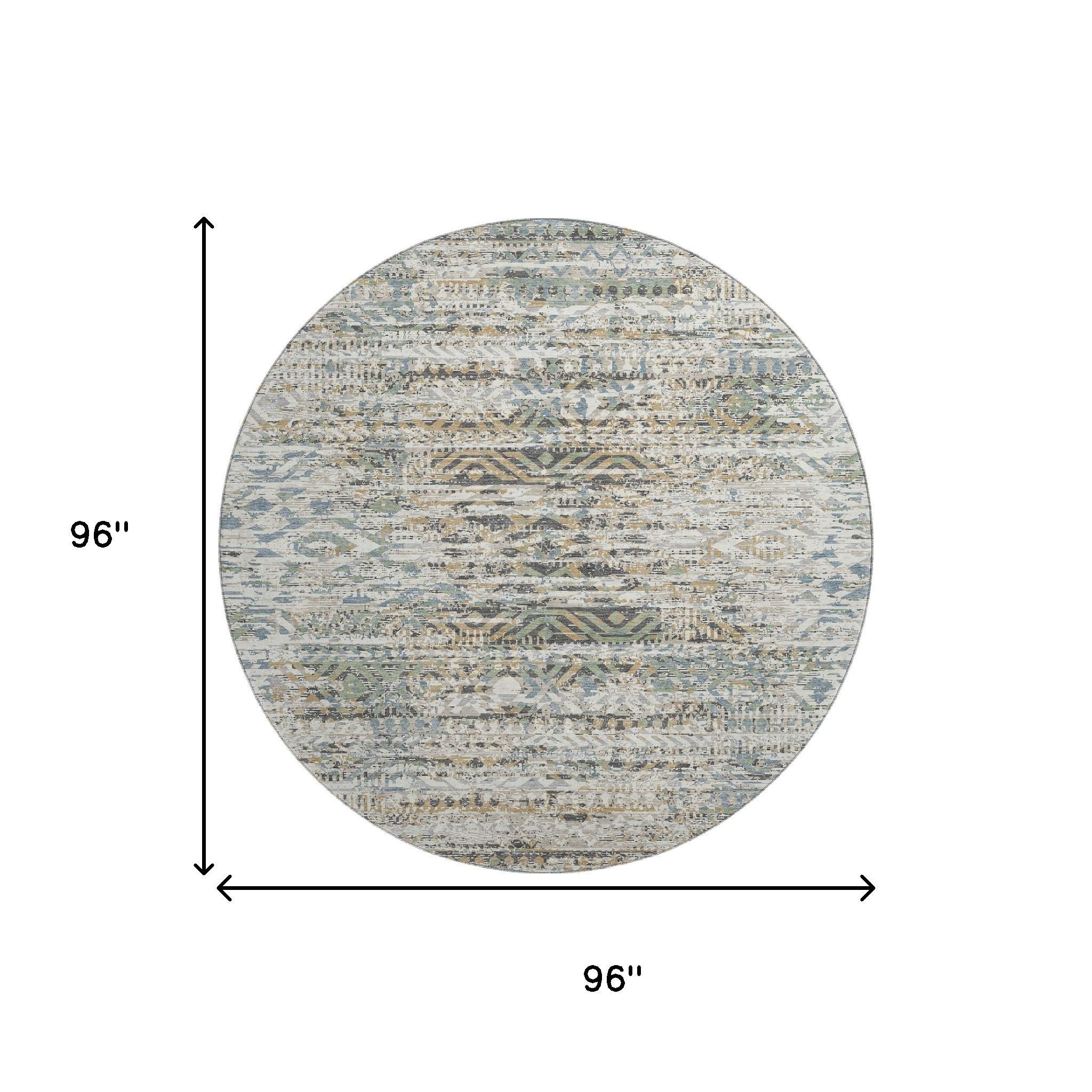 This 8-foot ivory beige and charcoal moroccan washable round rug with uv protection, is a great way to add warmth to a room. Ideal for spaces with kids and pets, this rug is stain resistant to help repel dirt and spilled liquids. Built to last, this rug crafted from polyester fibers is known for its durability and long lasting appeal. Rugs are a great way to showcase your style, hide imperfections, warm your home and reduce noise. This larger sized, transitional styled rug is ready to create a focal point or statement piece in your room. 96.00-inch h x 96.00-inch w x 0.39-inch d.