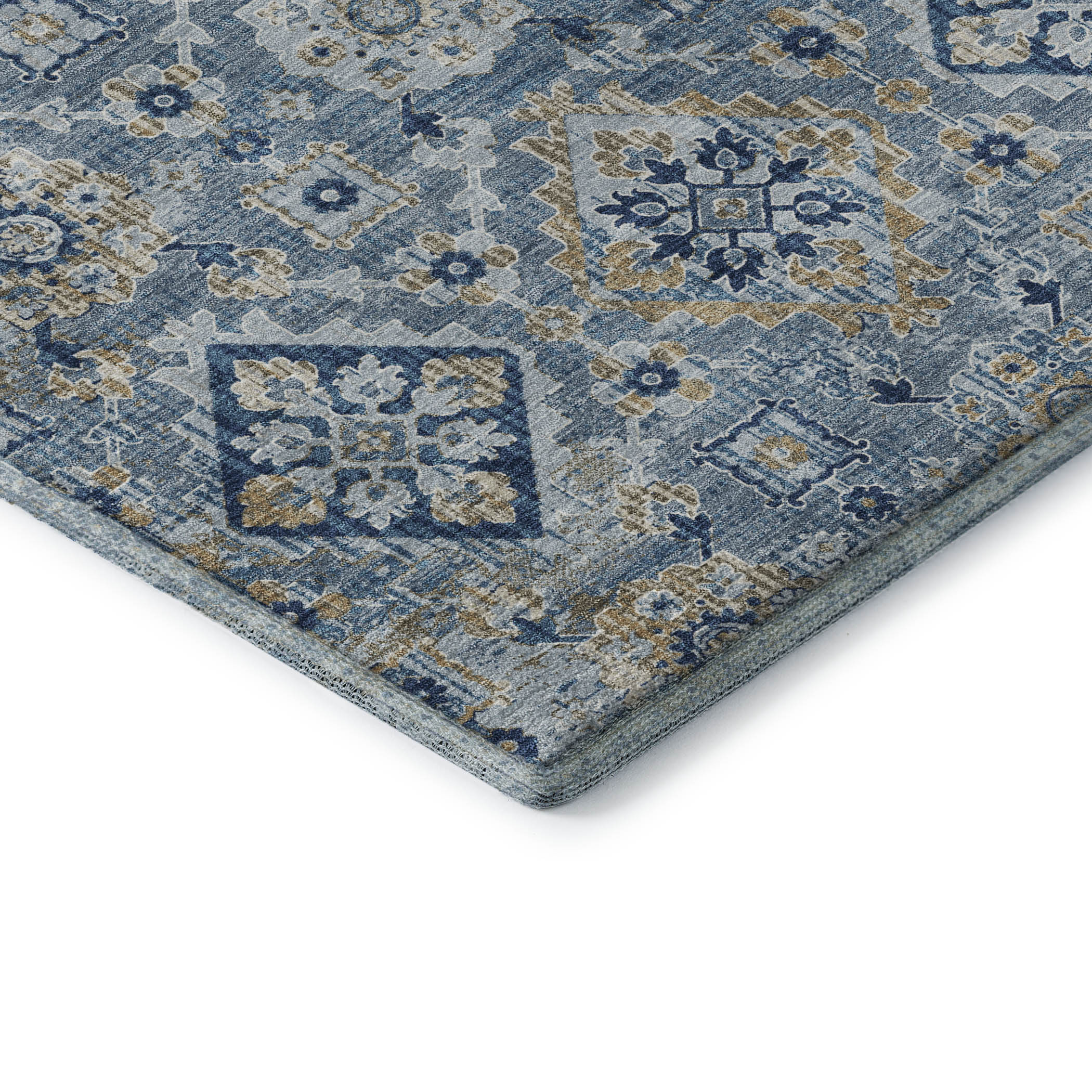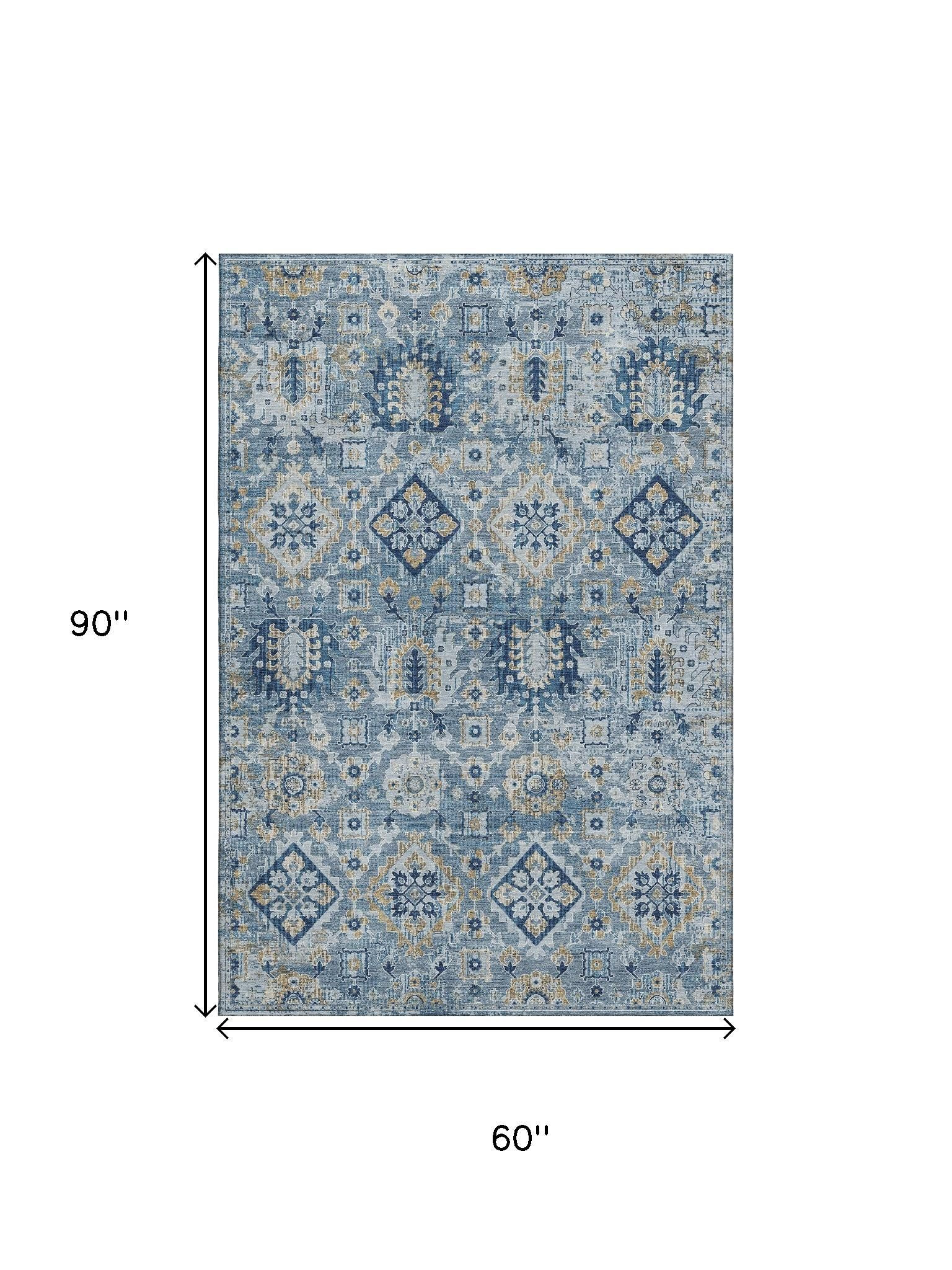 Set an inviting tone in your space with this 5-foot x 8-foot denim blue and gold oriental washable area rug with uv protection. Ideal for spaces with kids and pets, this rug is stain resistant to help repel dirt and spilled liquids. Built to last, this rug crafted from polyester fibers is known for its durability and long lasting appeal. Rugs are a great way to showcase your style, hide imperfections, warm your home and reduce noise. This larger sized, traditional styled rug is ready to create a focal point or statement piece in your room. 60.00-inch h x 90.00-inch w x 0.39-inch d.