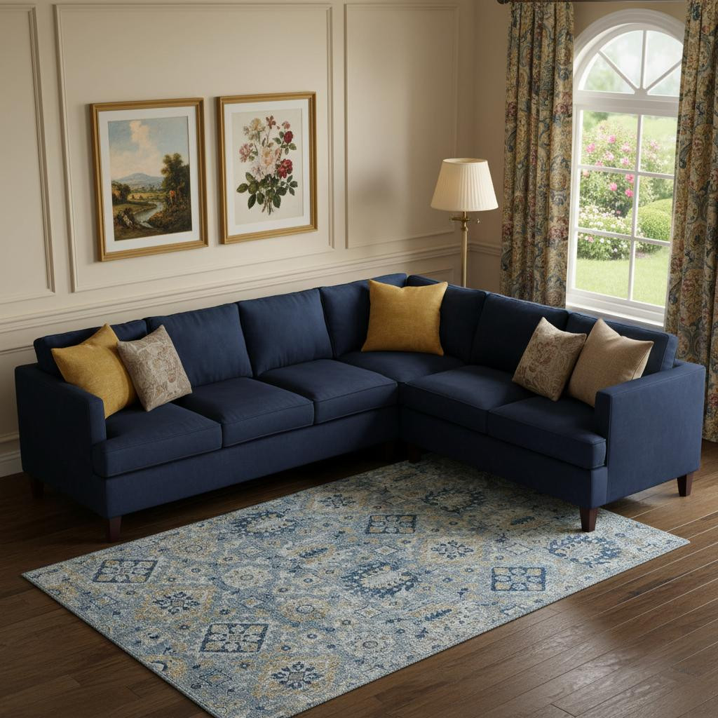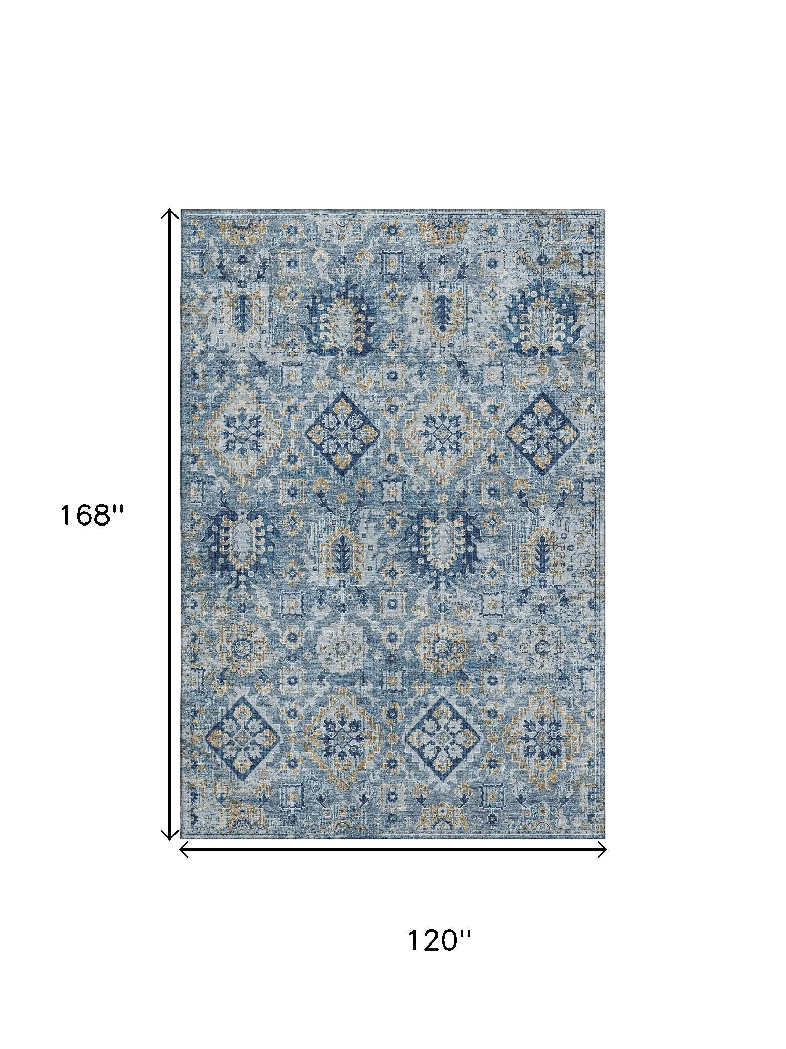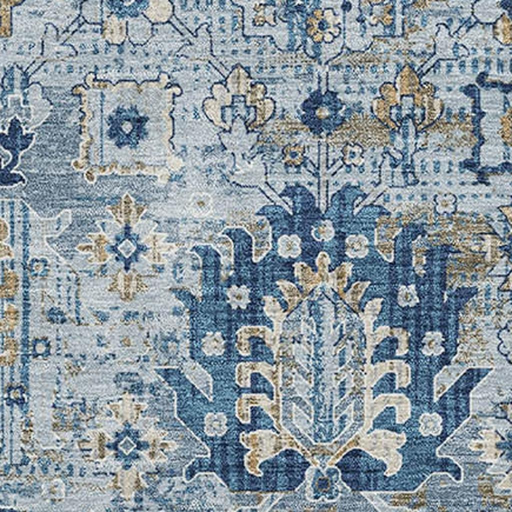 Add some artistry to your room with this 10-foot x 14-foot denim blue and gold oriental washable area rug with uv protection. Ideal for spaces with kids and pets, this rug is stain resistant to help repel dirt and spilled liquids. Built to last, this rug crafted from polyester fibers is known for its durability and long lasting appeal. Rugs are a great way to showcase your style, hide imperfections, warm your home and reduce noise. This larger sized, traditional styled rug is ready to create a focal point or statement piece in your room. 120.00-inch h x 168.00-inch w x 0.39-inch d.