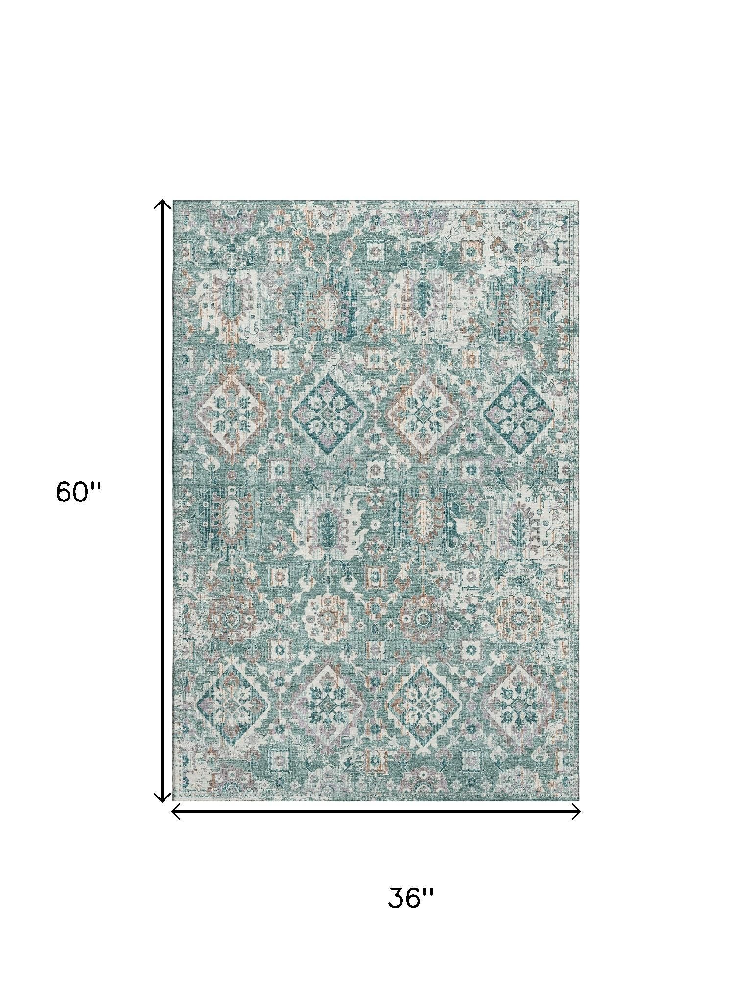 Set an inviting tone in your space with this 3-foot x 5-foot pale aqua and ivory oriental washable area rug with uv protection. Ideal for spaces with kids and pets, this rug is stain resistant to help repel dirt and spilled liquids. Built to last, this rug crafted from polyester fibers is known for its durability and long lasting appeal. Rugs are a great way to showcase your style, hide imperfections, warm your home and reduce noise. This smaller sized, traditional styled rug is just what you need for your walkway, bedside, in front of door, cabinet, refrigerator, or chair. 36.00-inch h x 60.00-inch w x 0.39-inch d.
