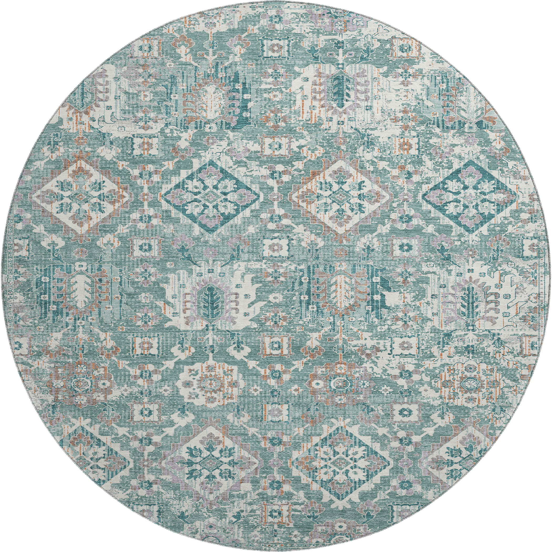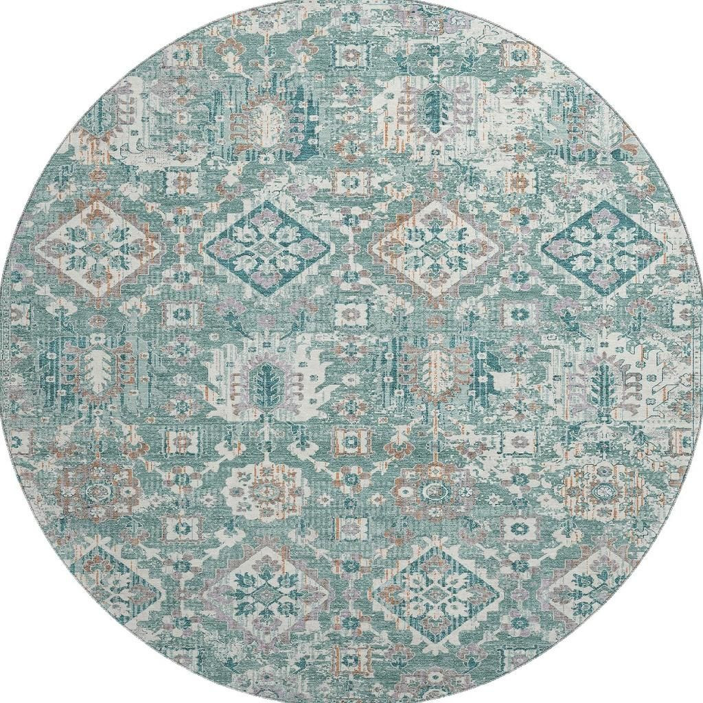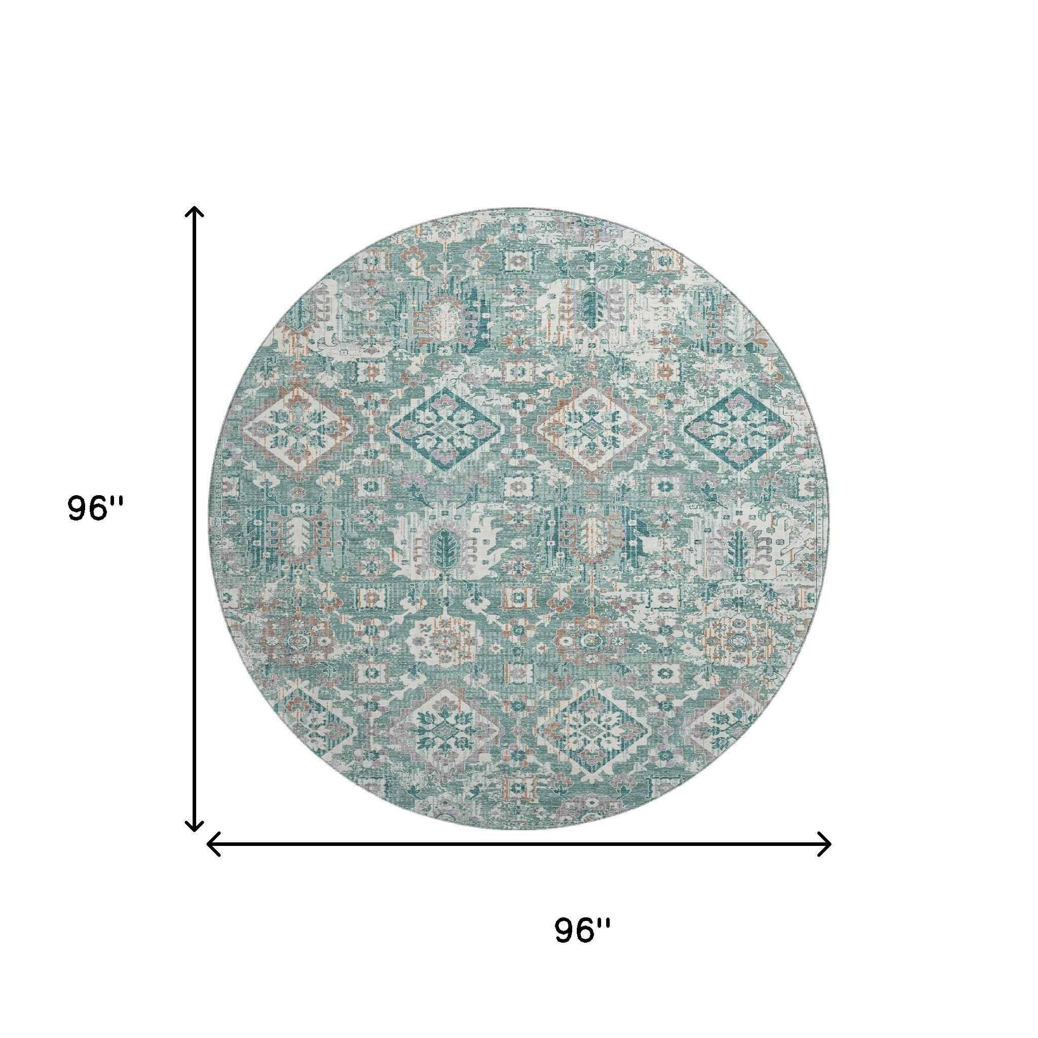 Add some artistry to your room with this 8-foot pale aqua and ivory oriental washable round rug with uv protection. Ideal for spaces with kids and pets, this rug is stain resistant to help repel dirt and spilled liquids. Built to last, this rug crafted from polyester fibers is known for its durability and long lasting appeal. Rugs are a great way to showcase your style, hide imperfections, warm your home and reduce noise. This larger sized, traditional styled rug is ready to create a focal point or statement piece in your room. 96.00-inch h x 96.00-inch w x 0.39-inch d.
