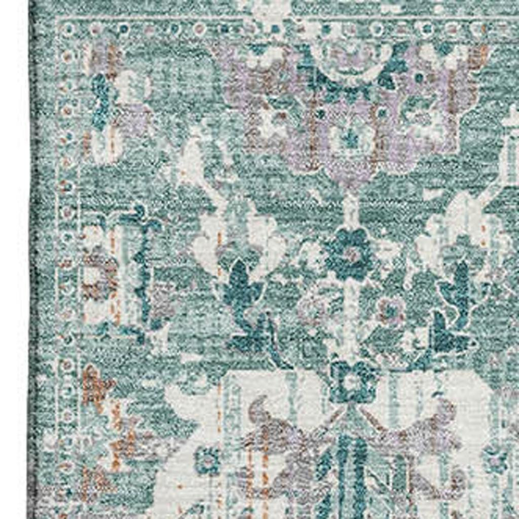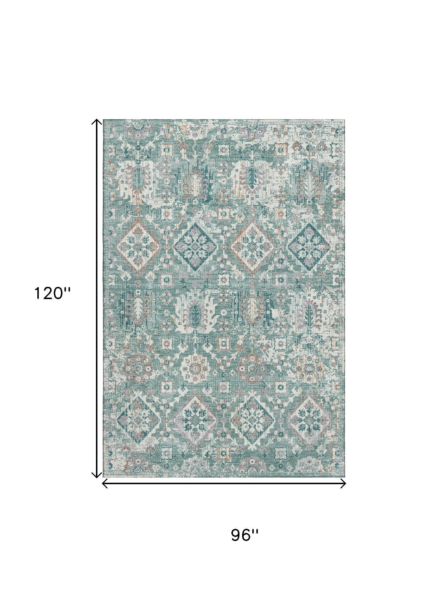 This 8-foot x 10-foot pale aqua and ivory oriental washable area rug with uv protection, is a great way to add warmth to a room. Ideal for spaces with kids and pets, this rug is stain resistant to help repel dirt and spilled liquids. Built to last, this rug crafted from polyester fibers is known for its durability and long lasting appeal. Rugs are a great way to showcase your style, hide imperfections, warm your home and reduce noise. This larger sized, traditional styled rug is ready to create a focal point or statement piece in your room. 96.00-inch h x 120.00-inch w x 0.39-inch d.