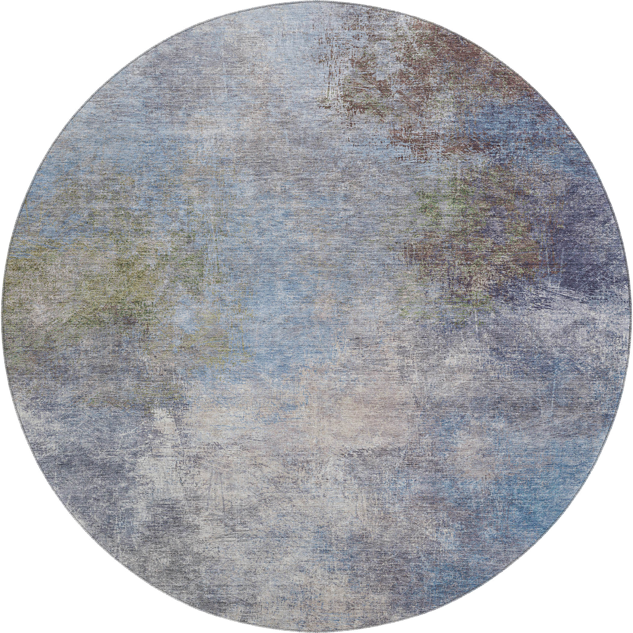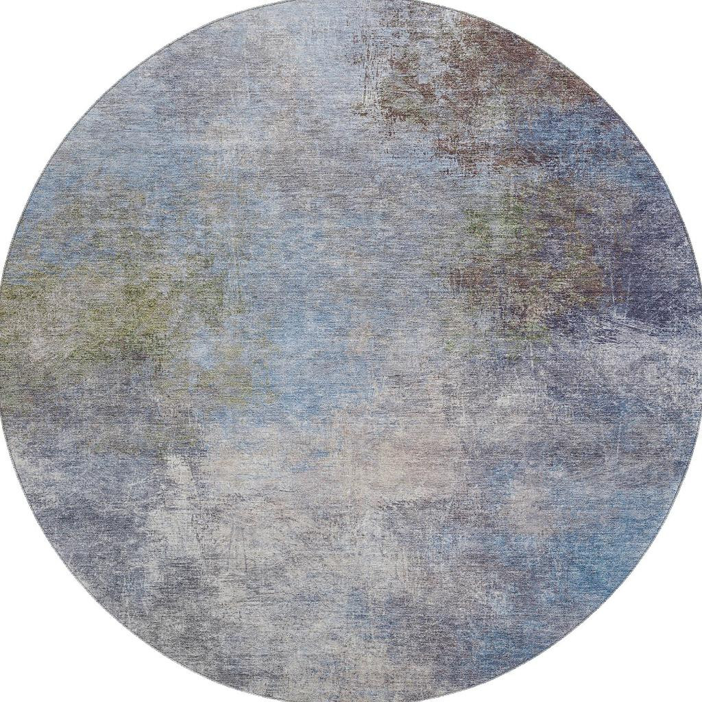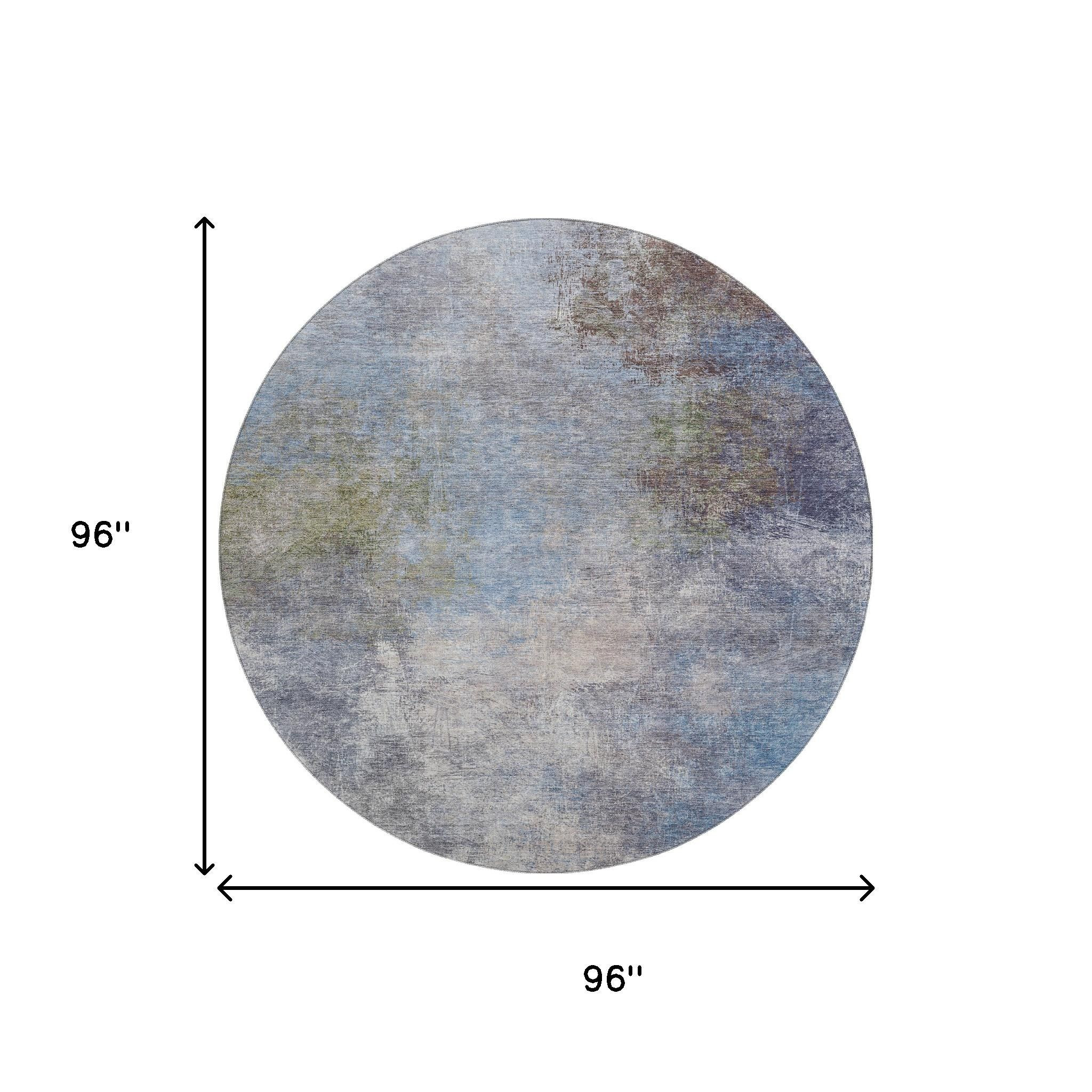 This 8-foot denim blue and brown abstract washable round rug with uv protection, is a great way to add warmth to a room. Ideal for spaces with kids and pets, this rug is stain resistant to help repel dirt and spilled liquids. Built to last, this rug crafted from polyester fibers is known for its durability and long lasting appeal. Rugs are a great way to showcase your style, hide imperfections, warm your home and reduce noise. This larger sized, transitional styled rug is ready to create a focal point or statement piece in your room. 96.00-inch h x 96.00-inch w x 0.39-inch d.