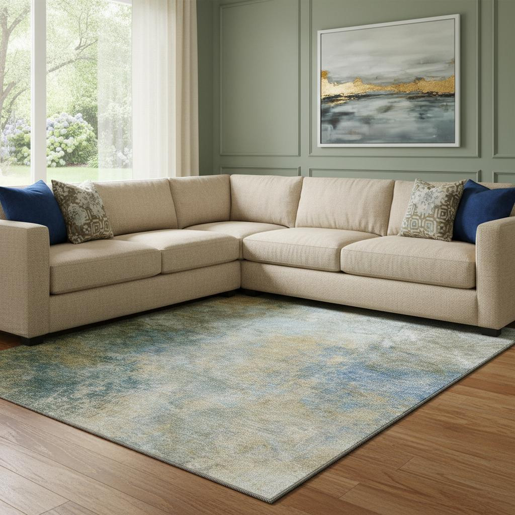 Add some artistry to your room with this 8-foot x 10-foot khaki blue and gold abstract washable area rug with uv protection. Ideal for spaces with kids and pets, this rug is stain resistant to help repel dirt and spilled liquids. Built to last, this rug crafted from polyester fibers is known for its durability and long lasting appeal. Rugs are a great way to showcase your style, hide imperfections, warm your home and reduce noise. This larger sized, transitional styled rug is ready to create a focal point or statement piece in your room. 96.00-inch h x 120.00-inch w x 0.39-inch d.