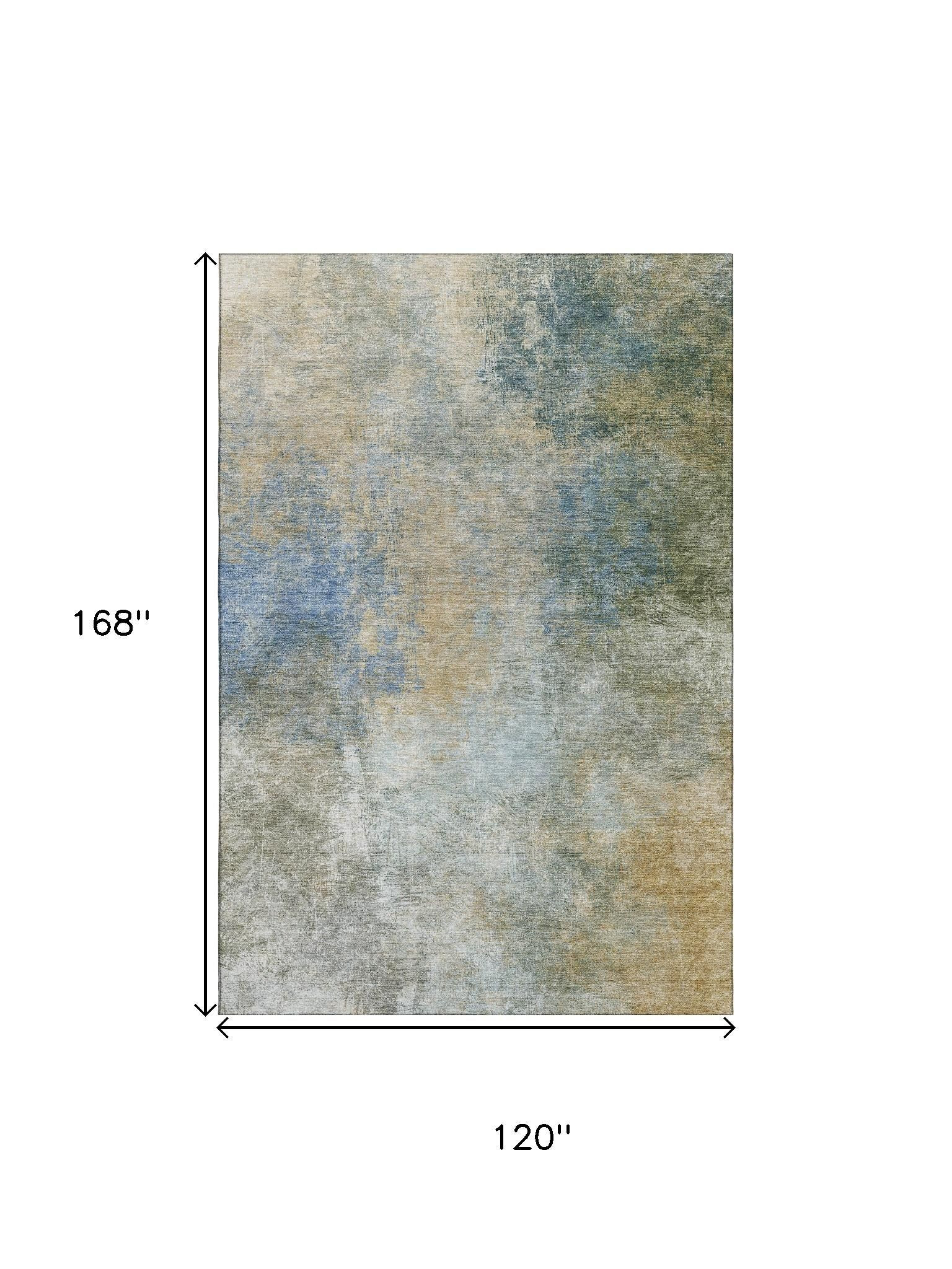 Set an inviting tone in your space with this 10-foot x 14-foot khaki blue and gold abstract washable area rug with uv protection. Ideal for spaces with kids and pets, this rug is stain resistant to help repel dirt and spilled liquids. Built to last, this rug crafted from polyester fibers is known for its durability and long lasting appeal. Rugs are a great way to showcase your style, hide imperfections, warm your home and reduce noise. This larger sized, transitional styled rug is ready to create a focal point or statement piece in your room. 120.00-inch h x 168.00-inch w x 0.39-inch d.