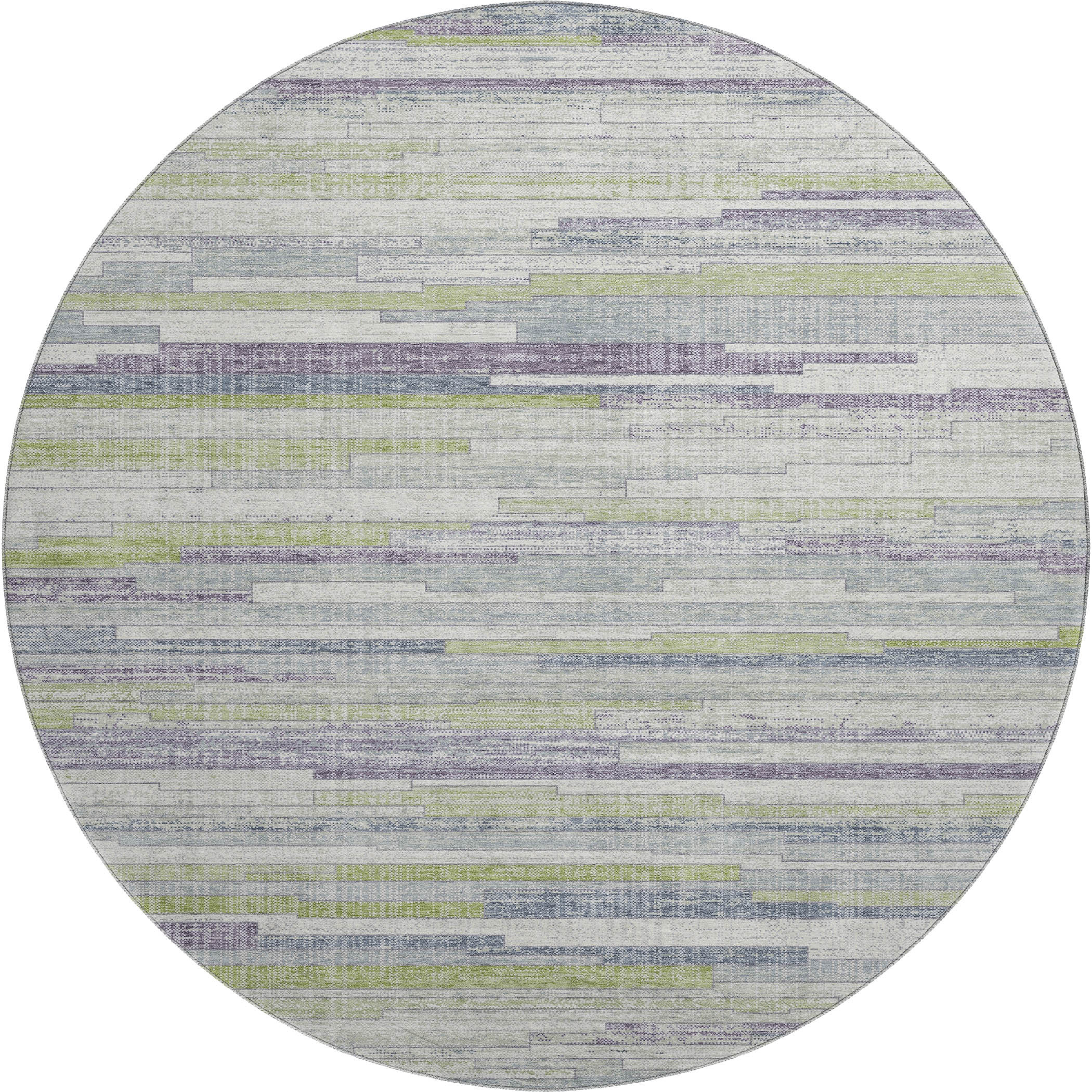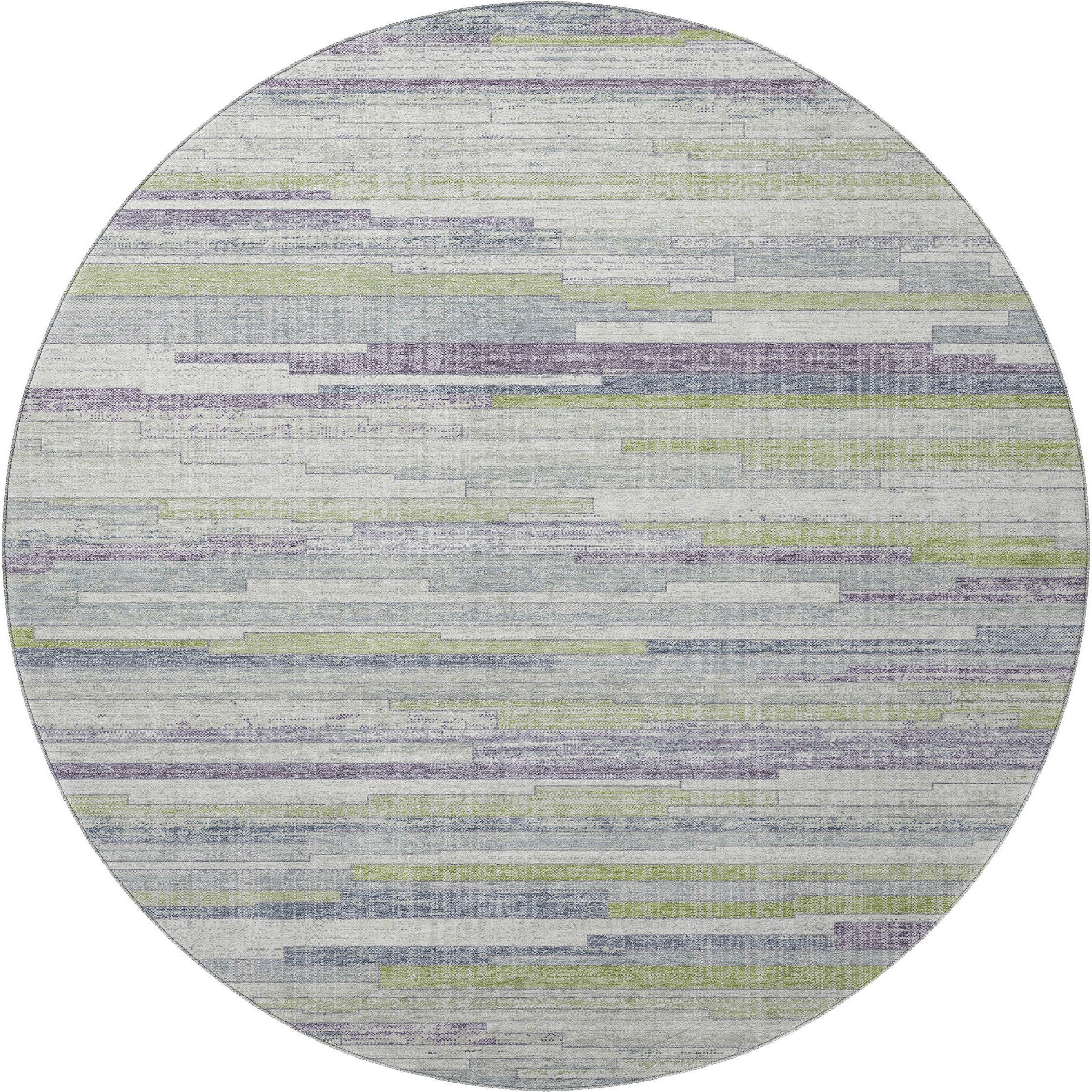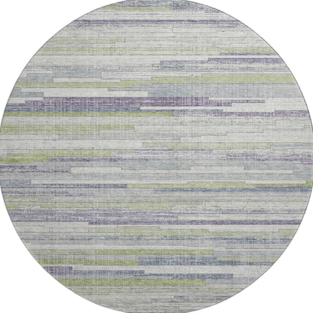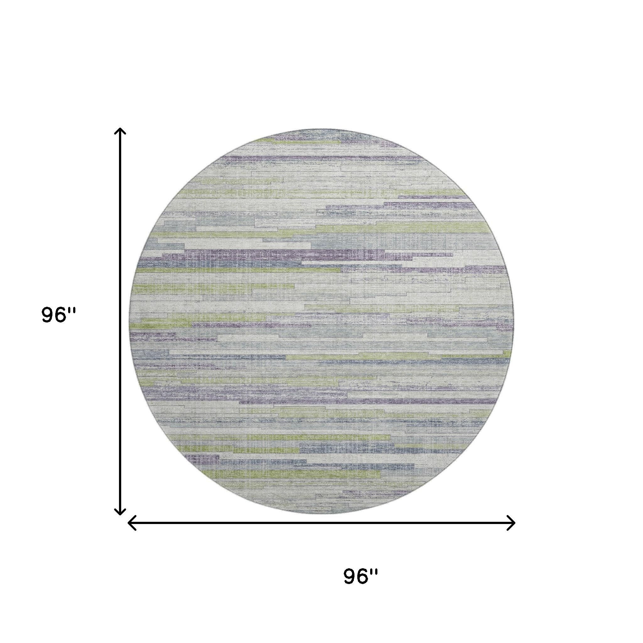 Add some artistry to your room with this 8-foot artichoke green ivory and plum striped washable round rug with uv protection. Ideal for spaces with kids and pets, this rug is stain resistant to help repel dirt and spilled liquids. Built to last, this rug crafted from polyester fibers is known for its durability and long lasting appeal. Rugs are a great way to showcase your style, hide imperfections, warm your home and reduce noise. This larger sized, transitional styled rug is ready to create a focal point or statement piece in your room. 96.00-inch h x 96.00-inch w x 0.39-inch d.